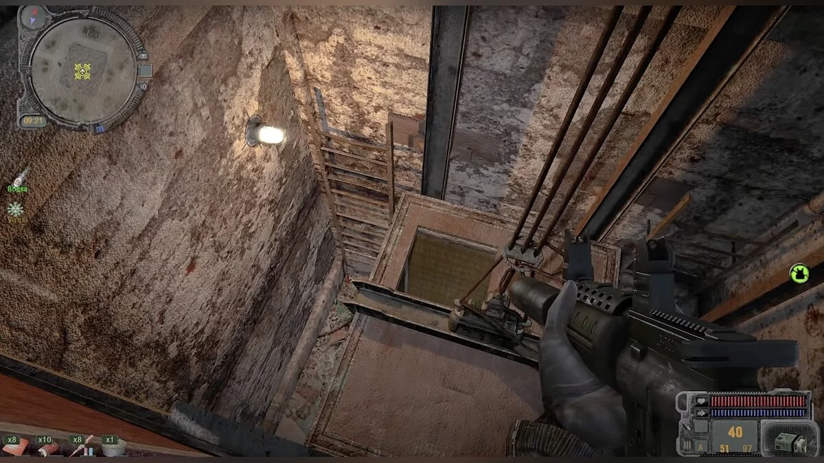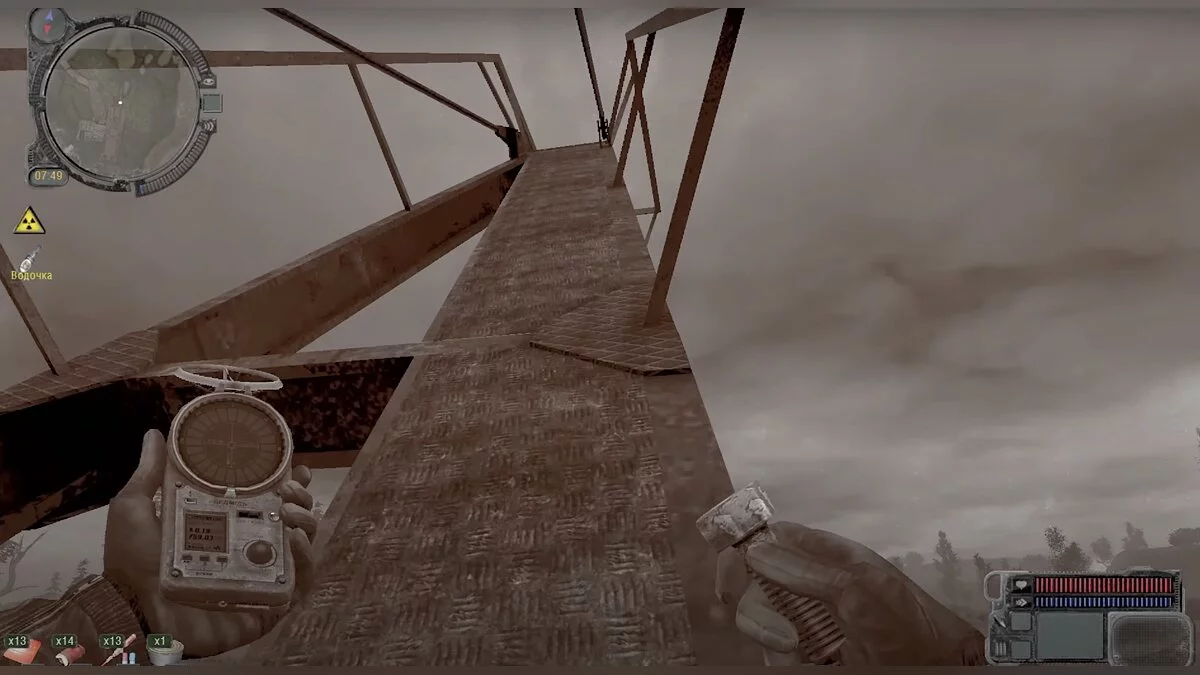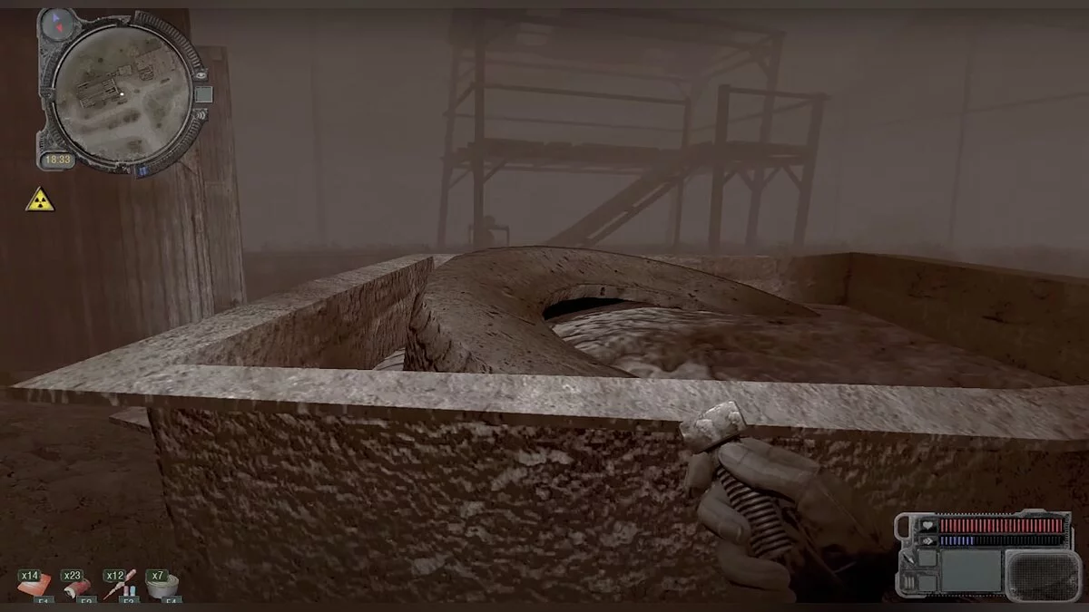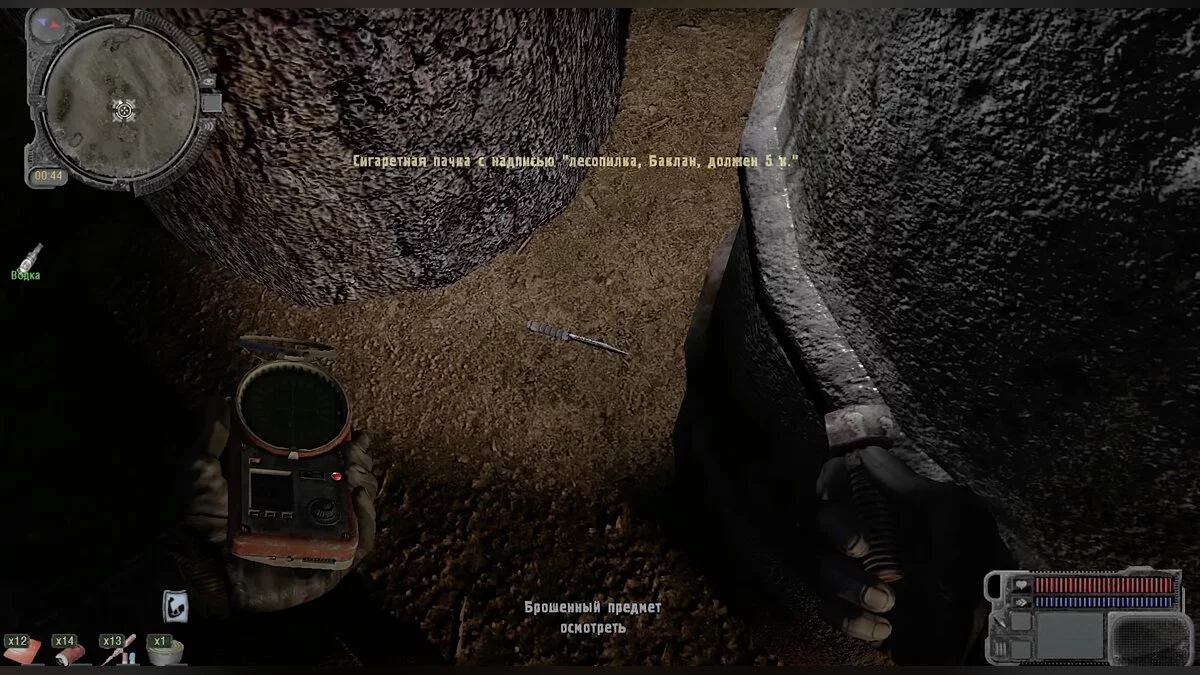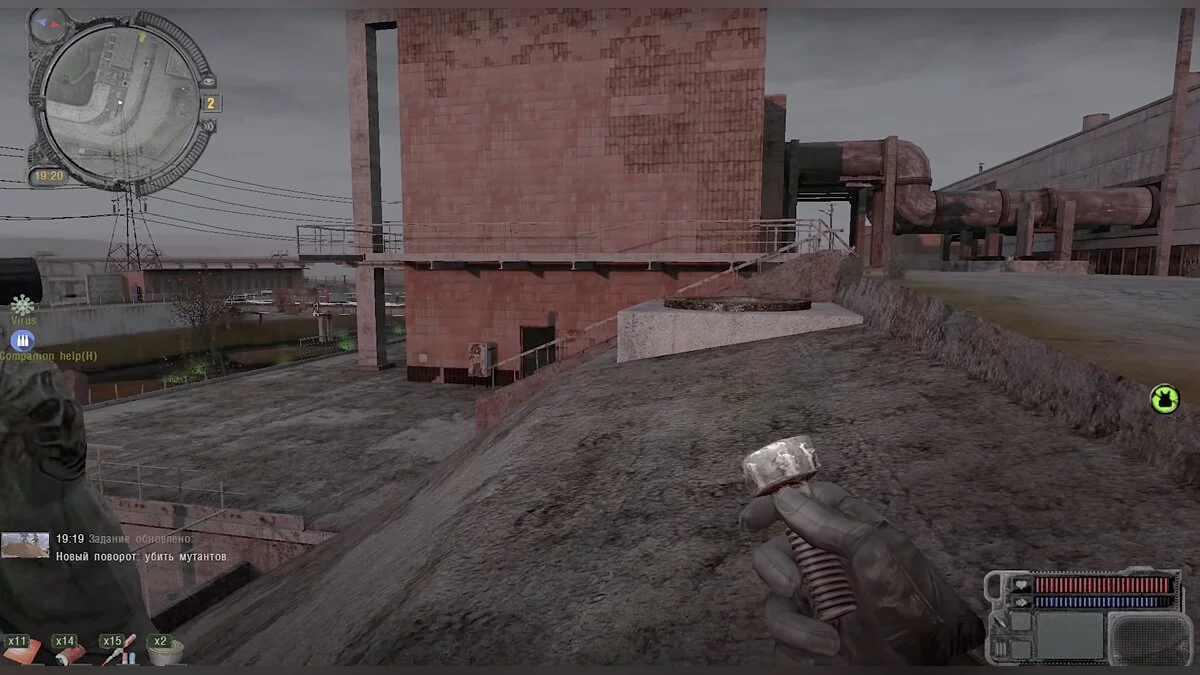 Подберите из единственного рюкзака бинт и посмотрите кат-сцену. Прощелыга обманул героя и закрыл выход из котла ящиком. Разбейте его выстрелами, а затем преследуйте сталкера. Оказавшись на мосту, не идите вперед, а найдите сбоку лестницу, чтобы забраться. Двигайтесь по большой трубе, только так получится избежать урон от аномалий. Догнав Прощелыгу, допросите его. В какой-то момент сталкера застрелят. Гнаться за убийцей бесполезно, поэтому просто подберите нужный вам планшет.