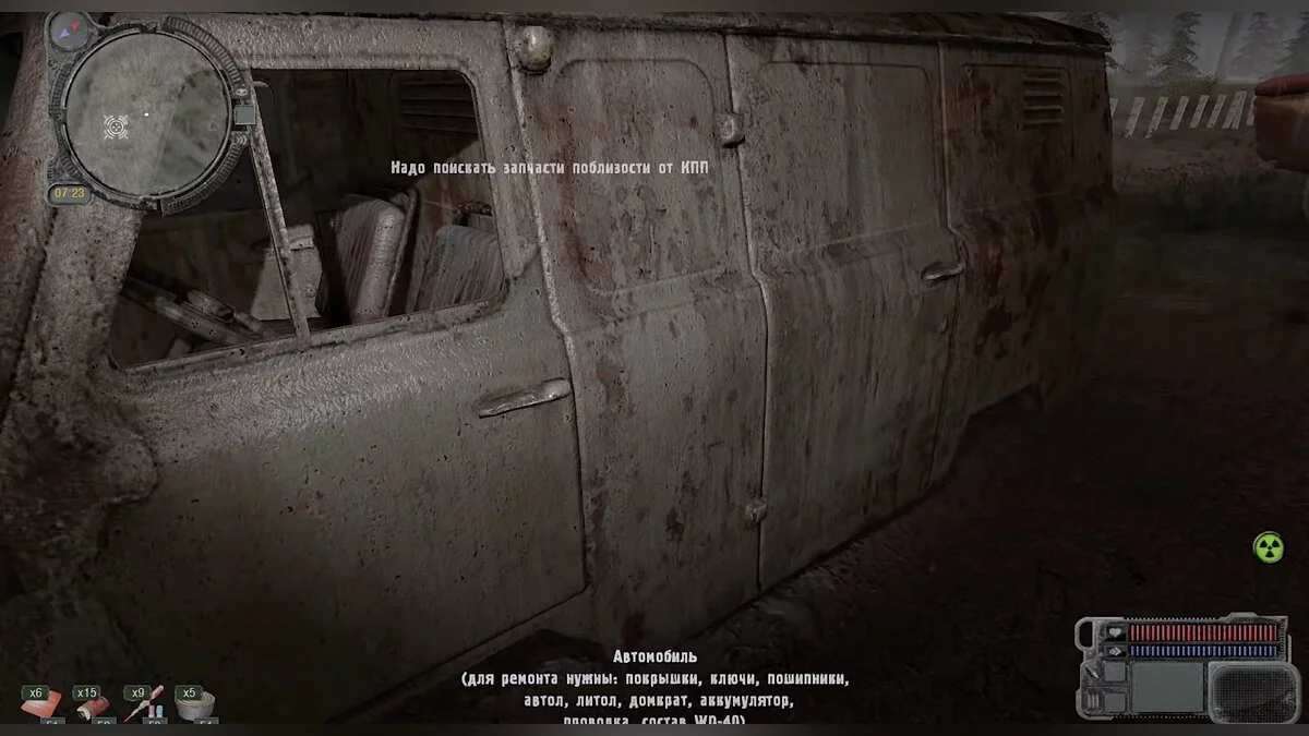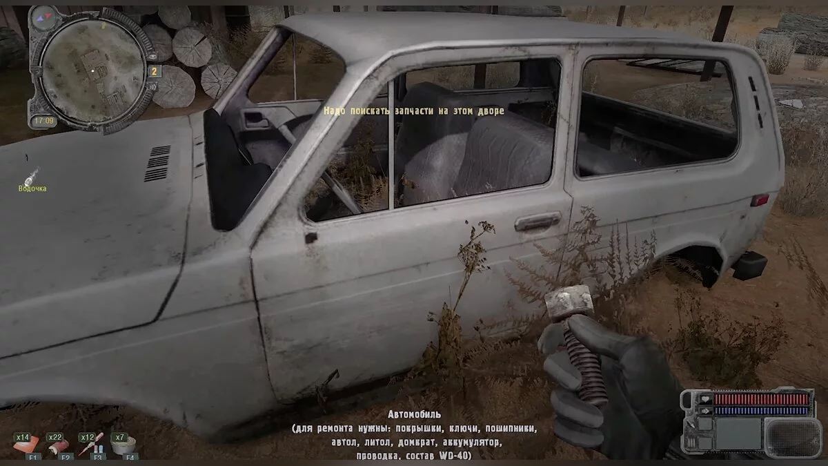 В здании неподалеку стоит сломанная белая машина– Нива. Подойдите к ней, чтобы увидеть список деталей, необходимых для починки: