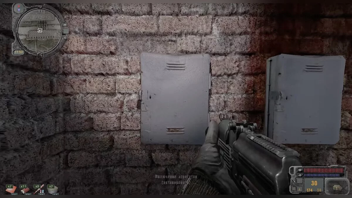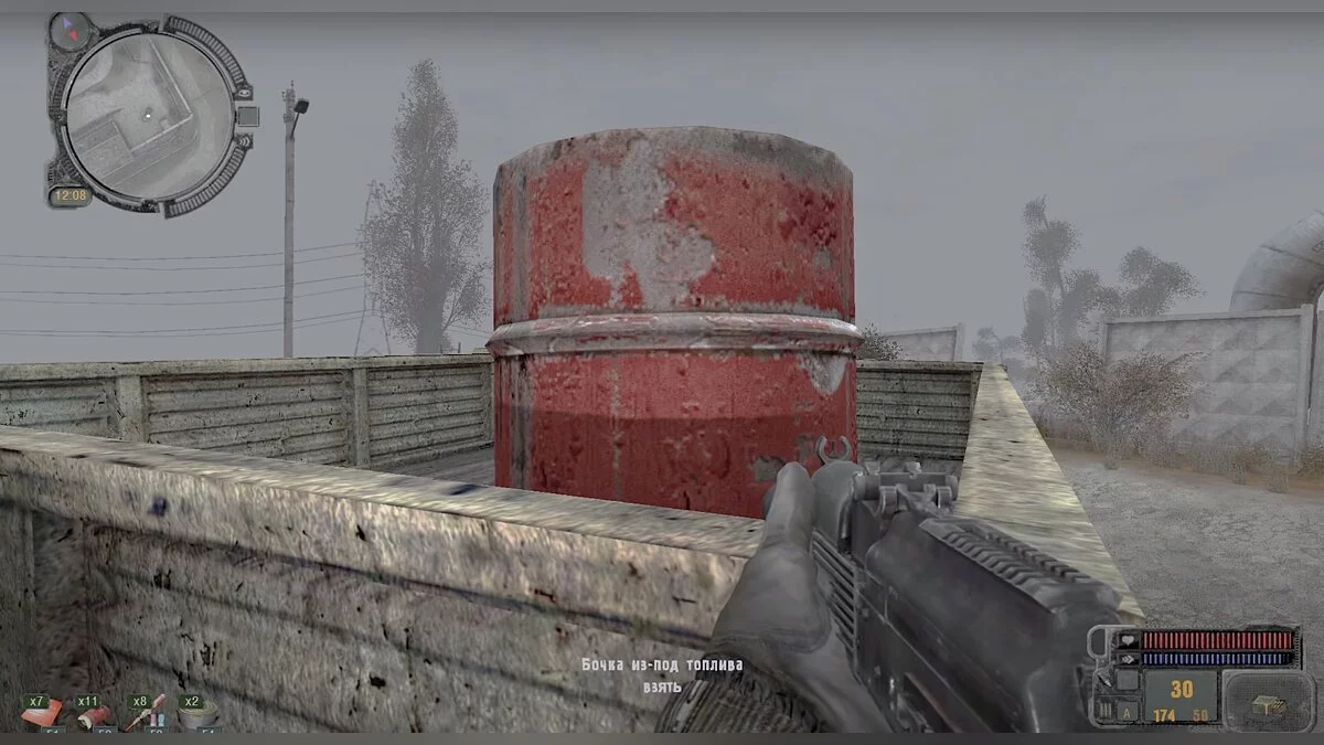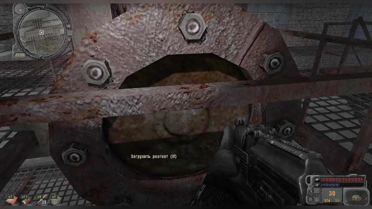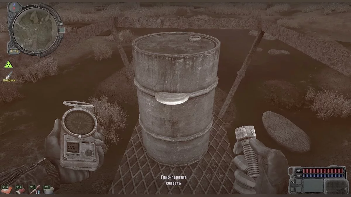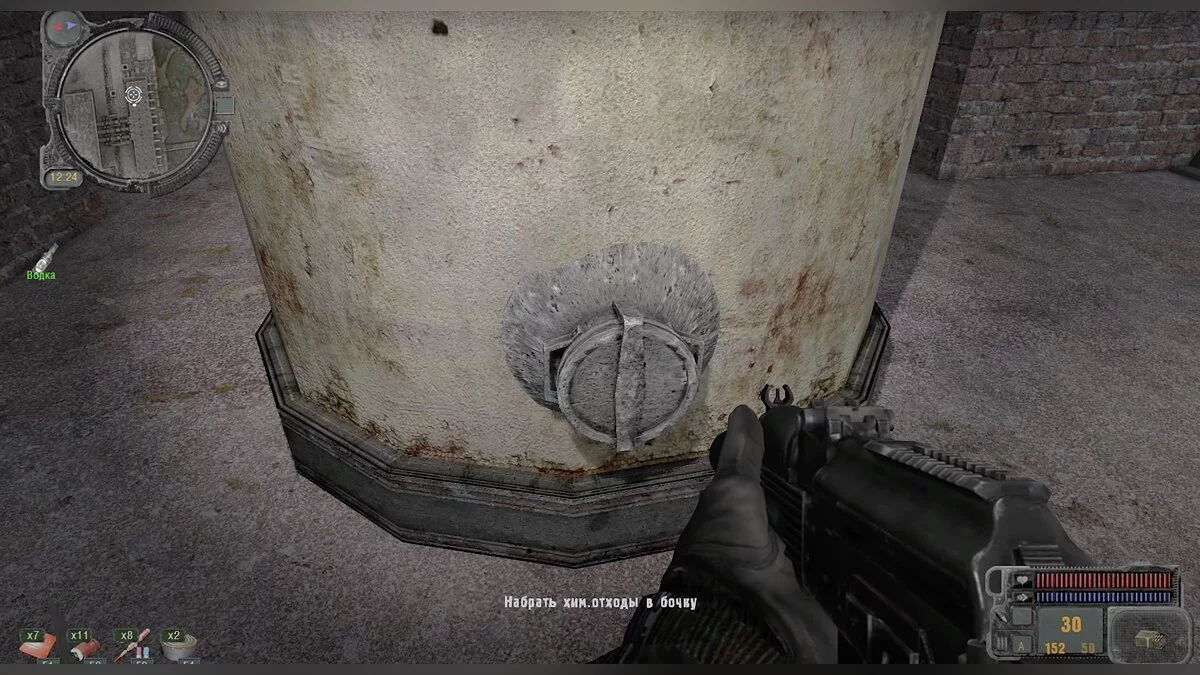 Следуя меткам, загрузите реагенты в трубу, запустите генератор, а затем включите рубильники на трех щитках. Теперь нужно найти три бочки, куда загрузить полученные отходы. Выходите туда, где нашли третий мешок. Одна бочка в кузове грузовика, вторая под лестницей слева. Третью можно найти в подземном переходе, который находится со стороны болота с зеленым свечением аномалий.