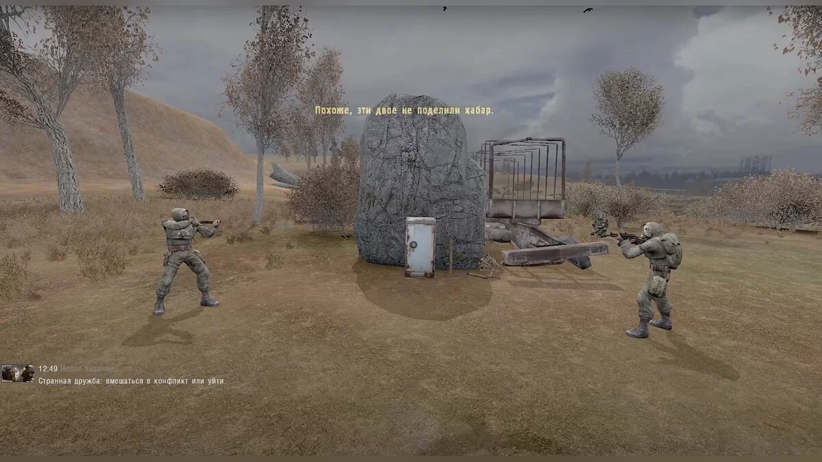 В самой верхней части локации еще одно дополнительное задание. Прибыв на место, вы увидите двух сталкеров, нацеливших оружие друг на друга. Вмешайтесь и поговорите с обоими — Климом и Халявой. Конфликт из-за сейфа в центре. Пообщайтесь повторно и выберите вариант, где предлагаете забить на сейф, однако сталкеры вас не послушают.