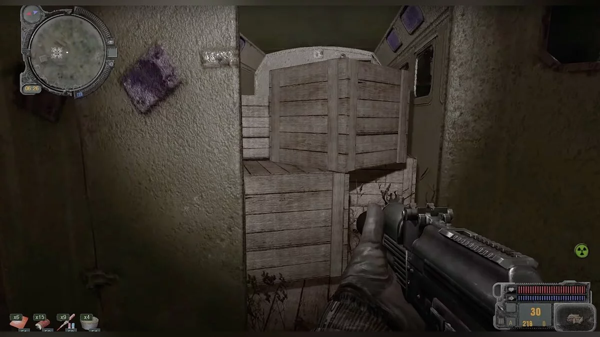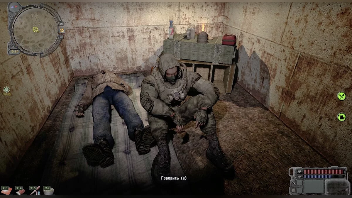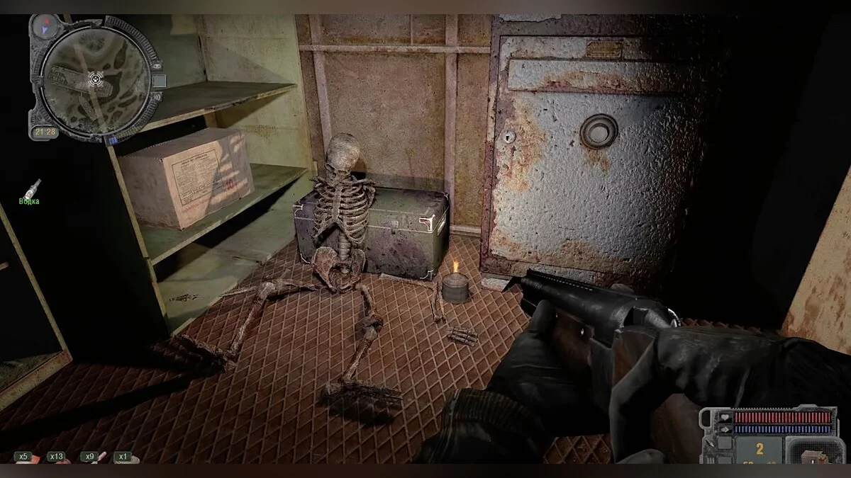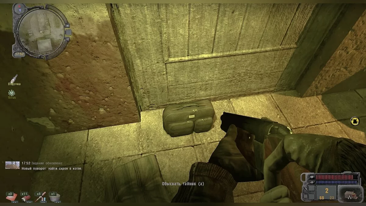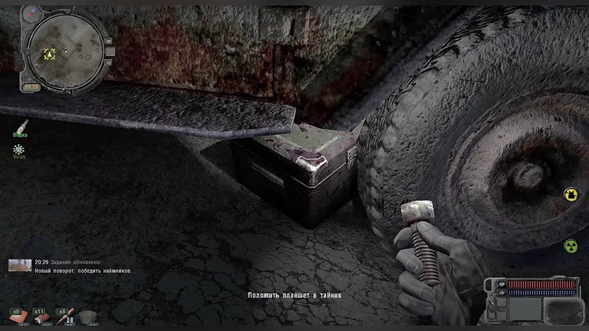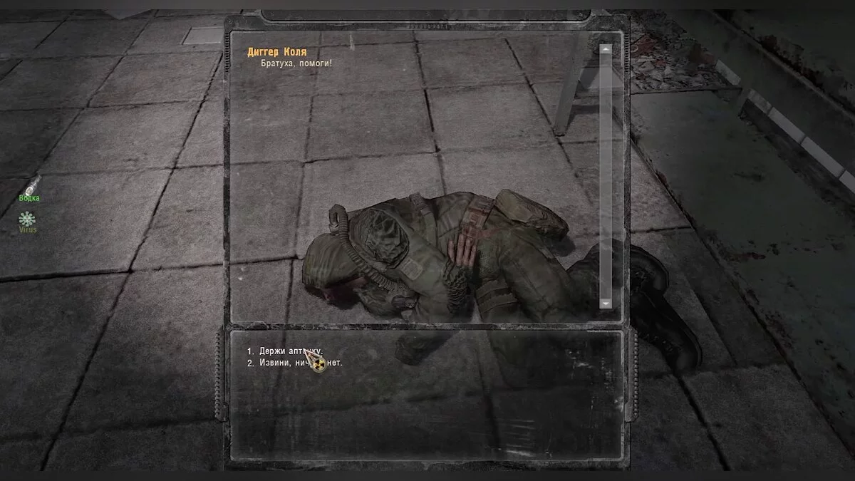 В ходе исследования локации вы будете встречать больных сталкеров, которые дают координаты тайников за водку. Если будете с ними общаться, то в итоге заболеете вирусом, который бушует в этой местности. Не говорите о болезни доктору Арбузову на Шевченко, иначе не сможете больше туда попасть. Заразу получится излечить по сюжету далее. Если вы заболели и рассказали доктору раньше, чем доделали все дела на Шевченко, придется искать обходные пути. Из места, где вы придете в себя после антибиотиков, по трубам можно забраться на корабль. Так получится обходным путем продолжить сюжетный квест.
