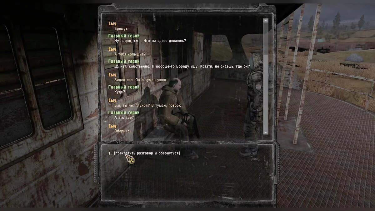 Окажется, что это Борода. Поговорите с ним и решите его судьбу. Если предложить ему остаться в Зоне, получите доступ к бесконечным заданиям. Туман рассеется.