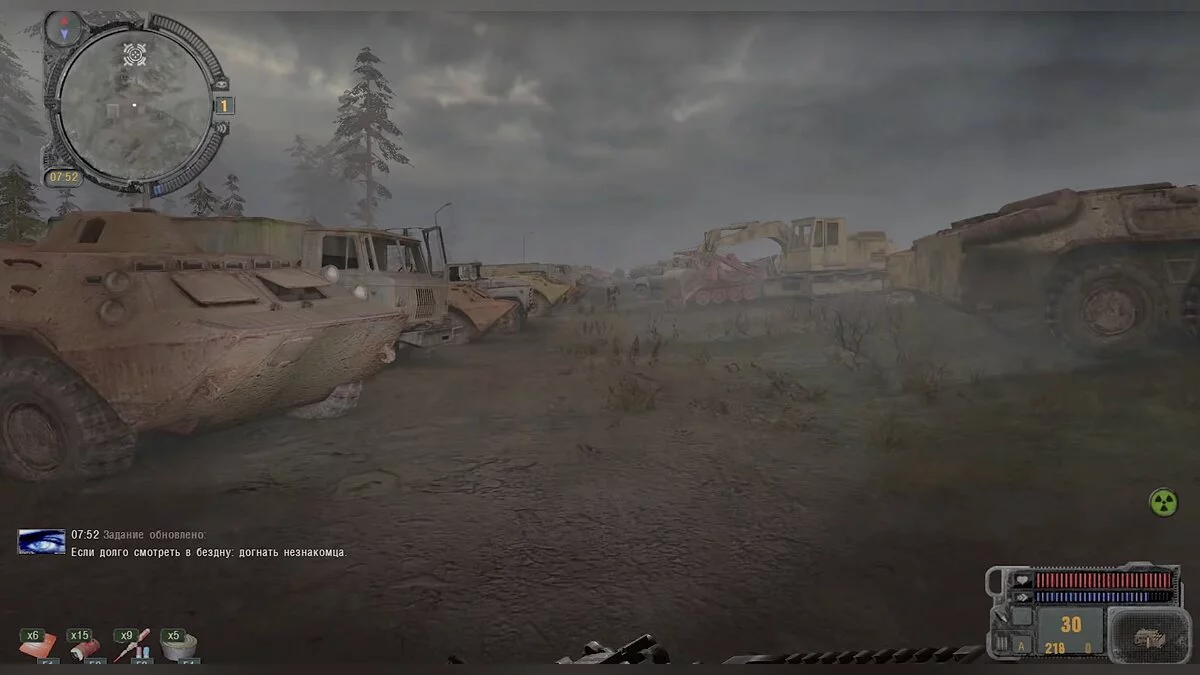 Двигайтесь к маркеру, уничтожая снорков и кровососов. Добравшись до холма, посмотрите кат-сцену. Когда получите управление, пройдите немного вперед и подберите ПДА. После этого нужно осмотреть грузовики ЗИЛ. На карте появится множество отметок, все грузовики — это минизадания и обойти придется сразу 11 штук. Однако независимо от автомобиля, последовательность сцен будет одинаковой.