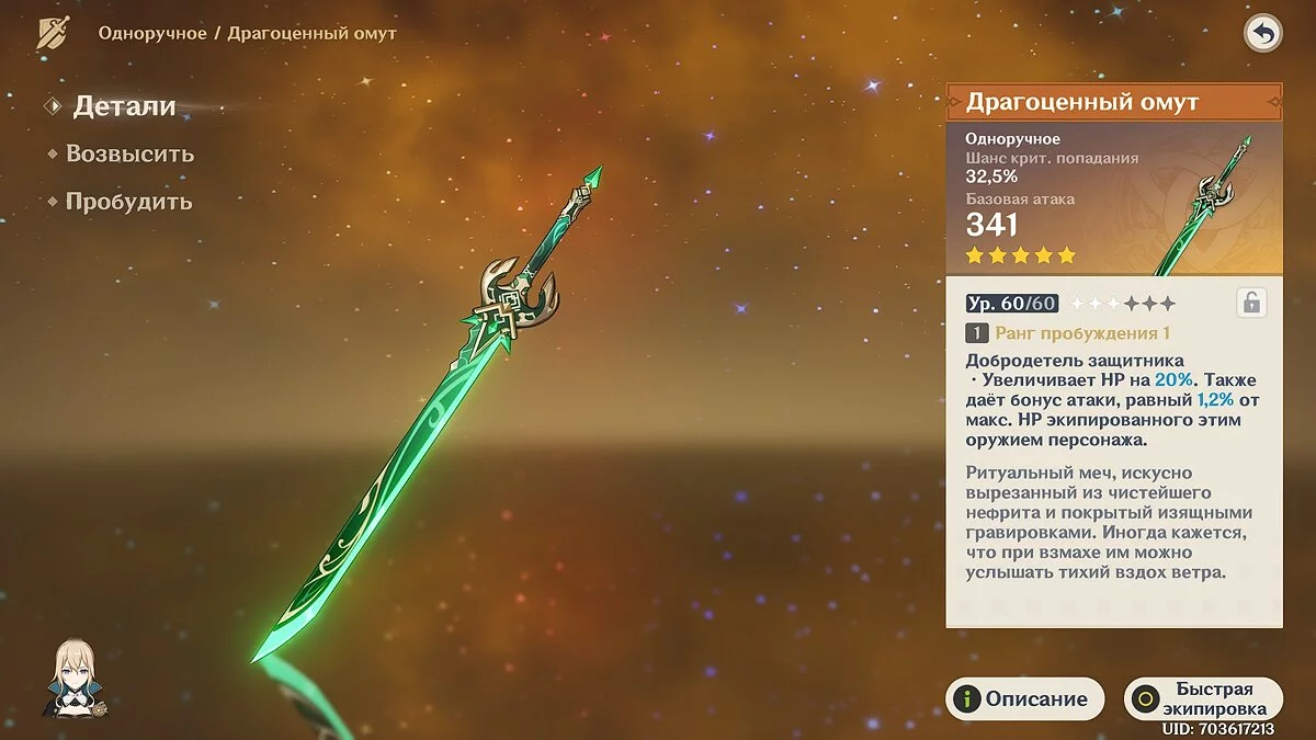 Драгоценный омут. Ещё один пятизвёздочный меч, который отлично подойдёт героине. Его атака — 44-539 единиц, а шанс критического попадания — 9,6-44,1%. Помимо этого, он увеличивает здоровье на 20-40%, и героиня получает бонус к урону 1,2-2,4% от максимальной жизненной силы. Этот меч можно получить при помощи молитвы «Воплощение божества».