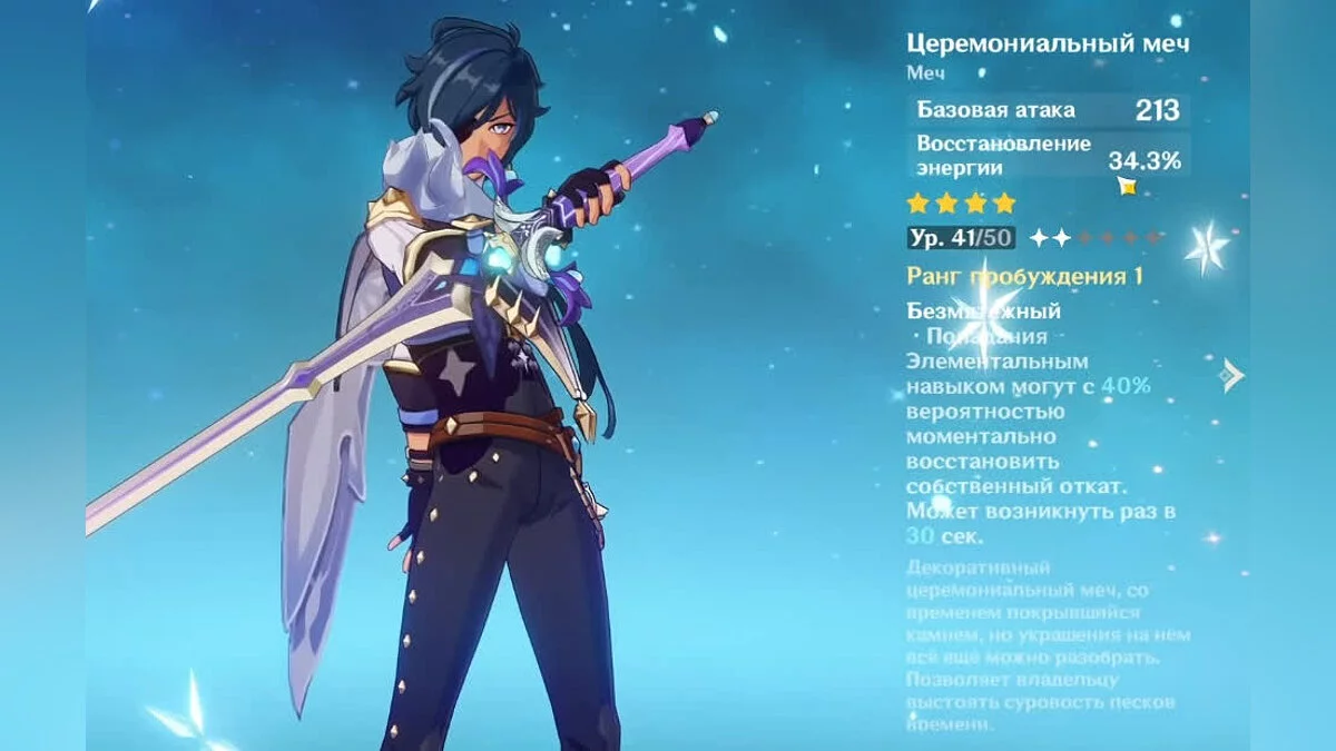 Церемониальный меч. Это оружие обладает атакой 41-574 единицы и увеличивает скорость восстановления энергии на 13,3-61,1%. Помимо этого, попадание элементальным навыком по противнику может с вероятностью 40-80% мгновенно перезарядить умение. Эффект возникает 1 раз в 30-16 секунд. Данныый меч можно получить при помощи молитвы «Воплощение божества».