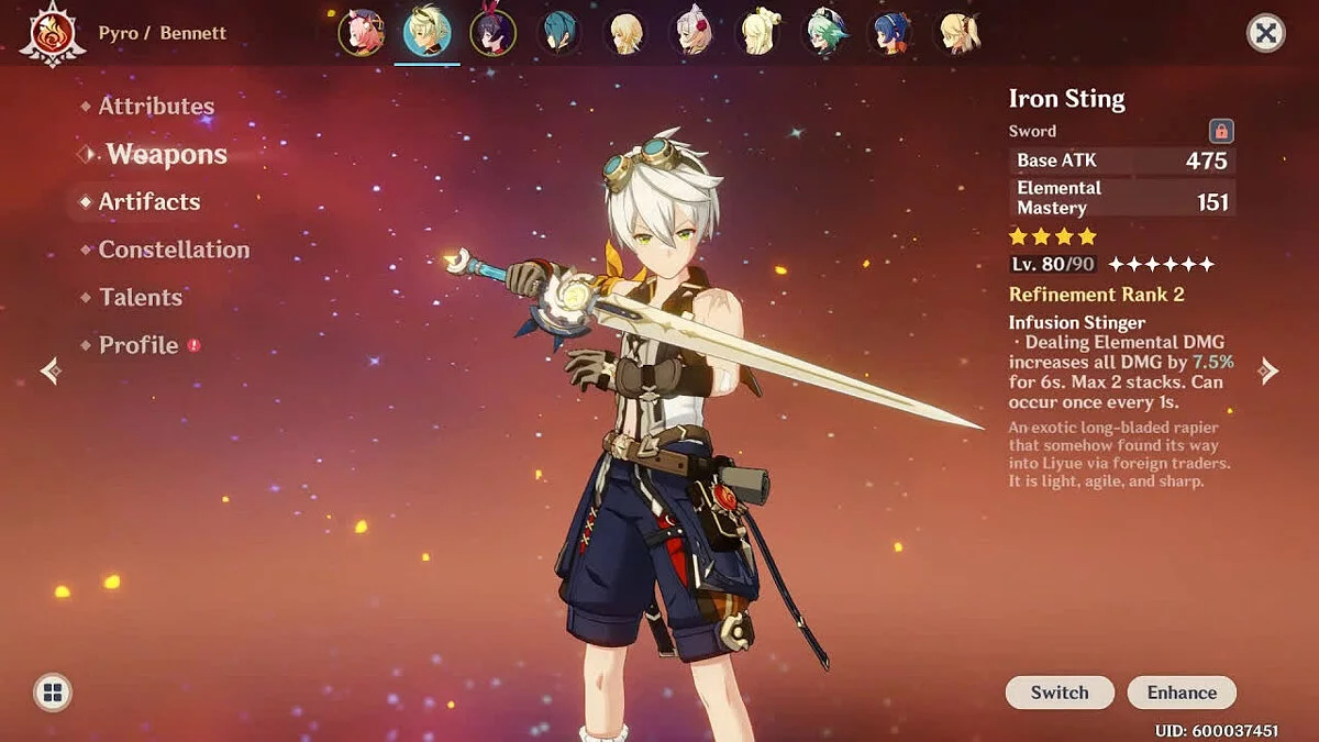 Стальное жало. Неплохой четырёхзвёздочный меч, который можно получить совершенно бесплатно. Он обладает атакой 42-510 единиц и повышает мастерство стихий героини на 36-165 единиц. Попадение элементальным навыком по противнику увеличивает весь урон персонажа на 6-12% в течение 6 секунд. Эффект может складываться до двух раз.