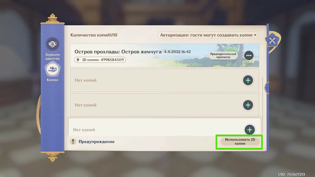 Каждая реплика будет иметь уникальный ID. Вы можете делиться этим идентификатором с друзьями и другими игроками, а также переносить интерьер со сторонних Чайников. Для этого нажмите на кнопку «Использовать ID копии» и вставьте полученный номер в строку ввода.