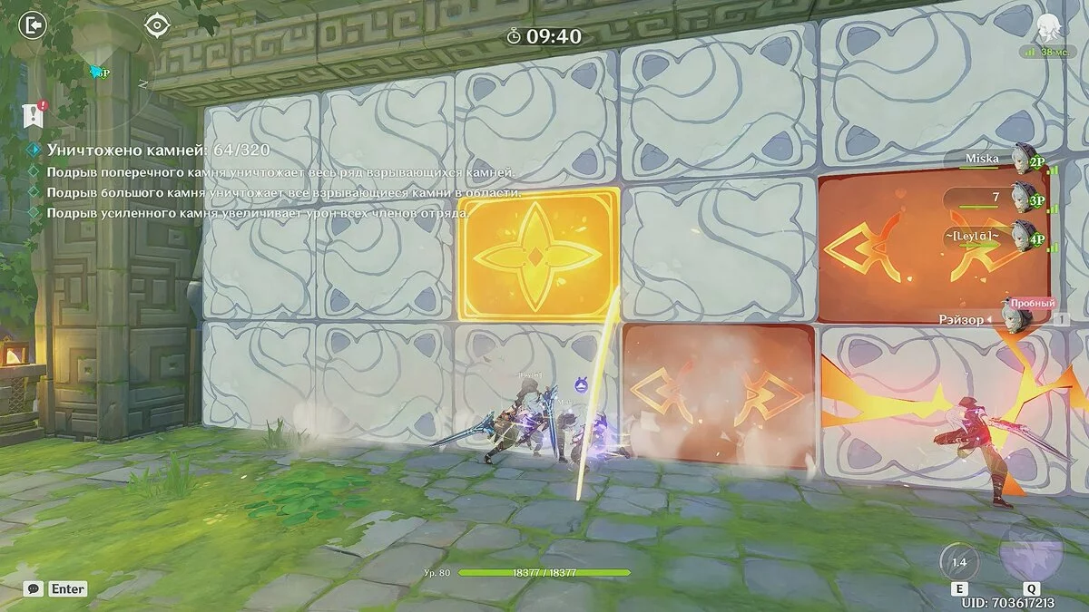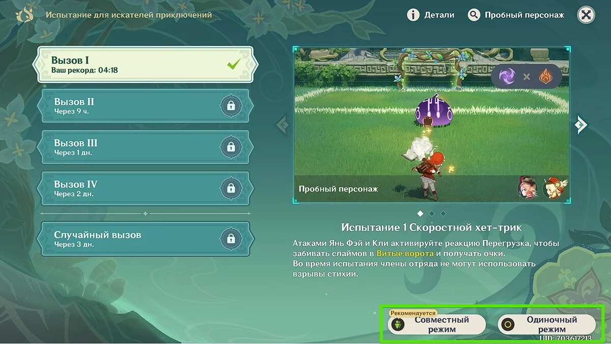 В одиночном режиме вам будут доступны два героя стихии Пиро — Янь Фэй и Кли. В совместном режиме эти герои распределяются по 2 на отряд. Со временем на карте появятся блоки, напоминающие цветы. При попадании в них слаймы будут отброшены назад. Когда игроки наберут необходимое количество очков, испытание будет завершено.