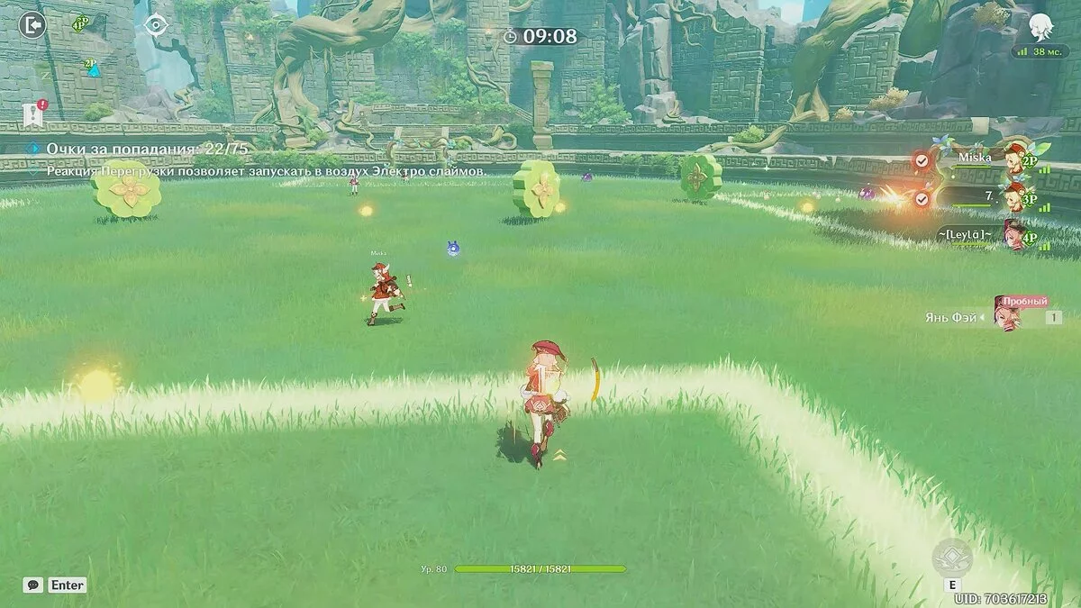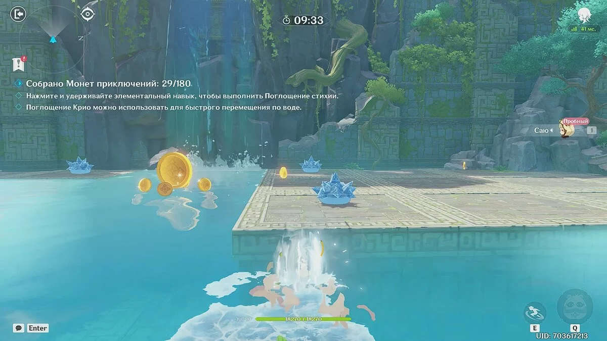 При помощи элементального умения Сяю вы можете поглощать различные стихии. Например, используйте навык рядом с крио слаймом, чтобы поглотить стихию и быстро перемещаться по воде. При помощи этого способа соберите все разбросанные по арене монетки.