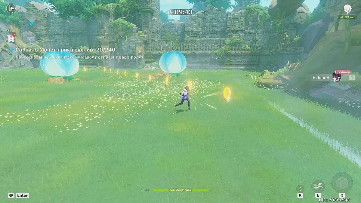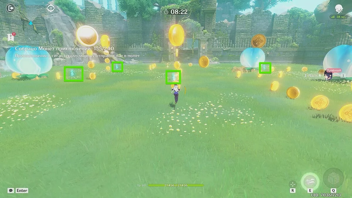 Используйте элементальный навык Е Лань, чтобы ускориться и проходить сквозь летающие пузыри. Чуть позже на поле также появятся символы высокого прыжка. Собирайте их, чтобы добраться до монет, расположенных довольно высоко.