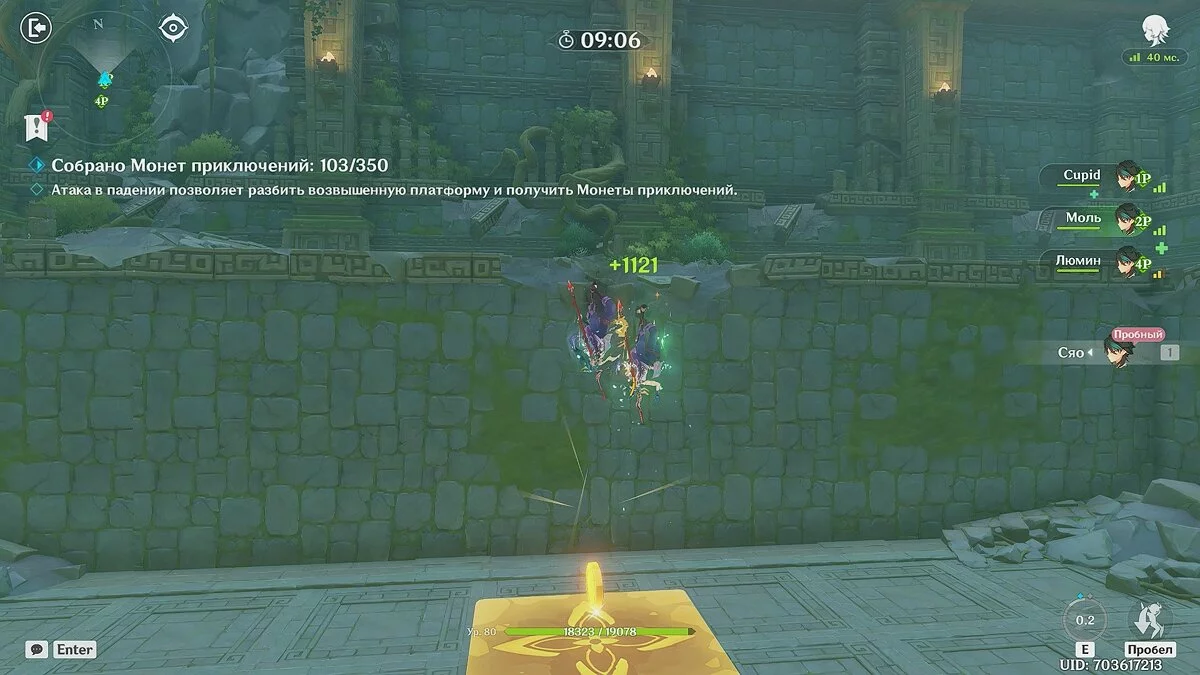 Все игроки берут под управление Сяо. Используйте прыжок, чтобы атаковать светящиеся платформы в падении. Достаточно выполнить три-четыре удара и платформа исчезнет. На её месте появятся монеты — соберите их как можно больше.