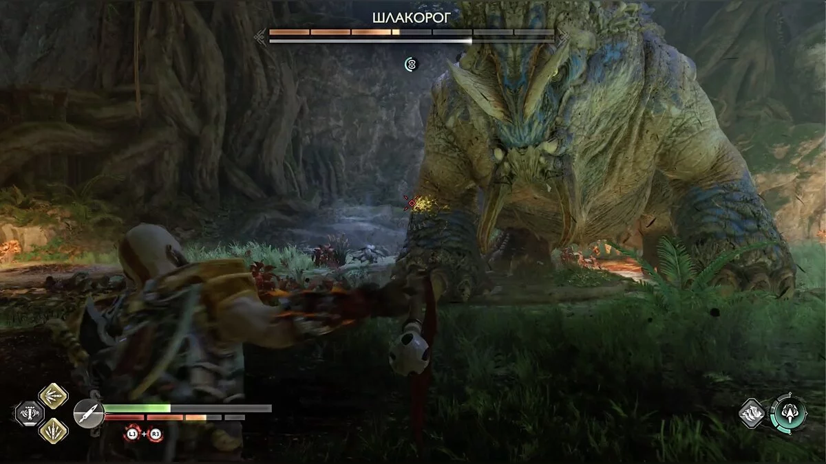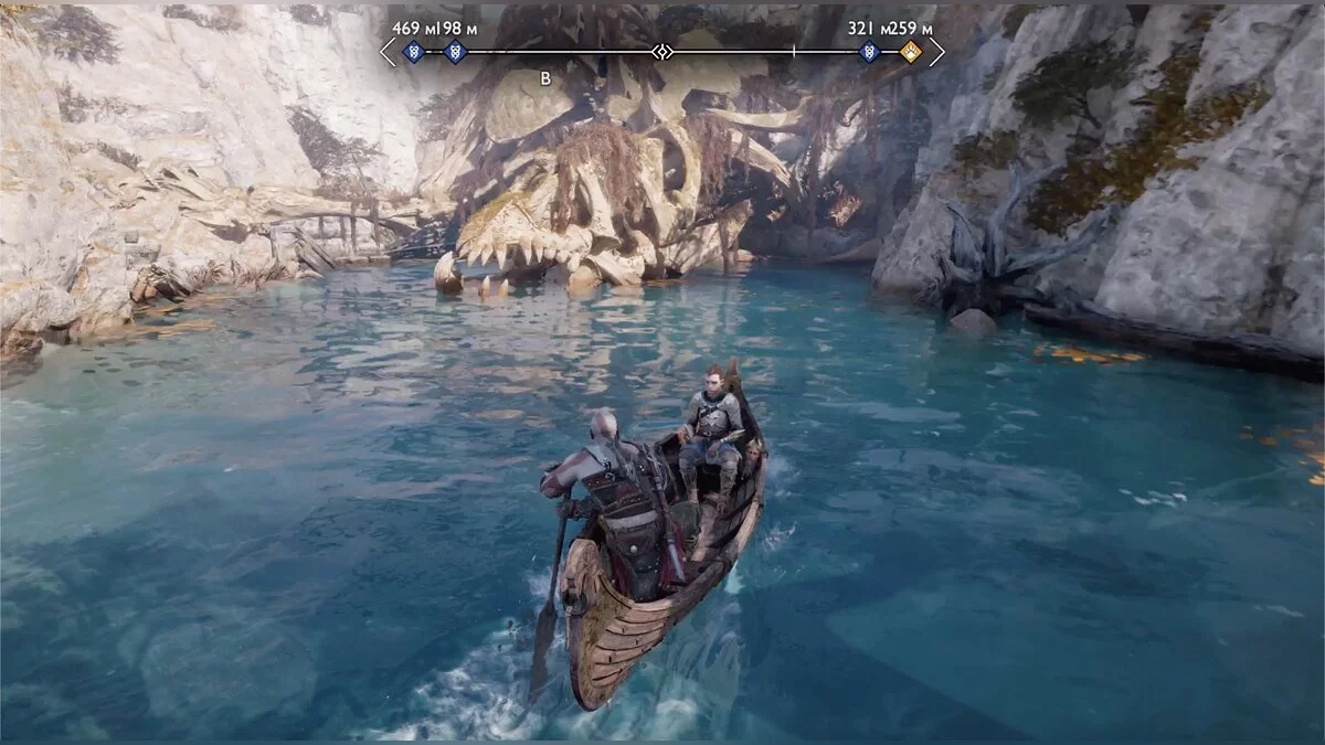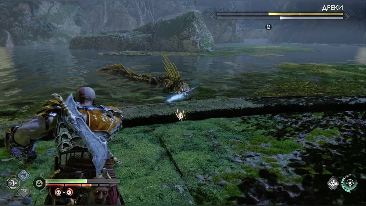Держитесь правой стороны и причальте к первому доступному берегу рядом со скелетом огромного существа, похожего на дракона. Хорошим ориентиром будет статуя дракона, о которой скажет сам Атрей. Вам предстоит продолжительный бой с уже знакомыми жабами и новыми врагами — безногими ящерами, зарывающимися в землю.