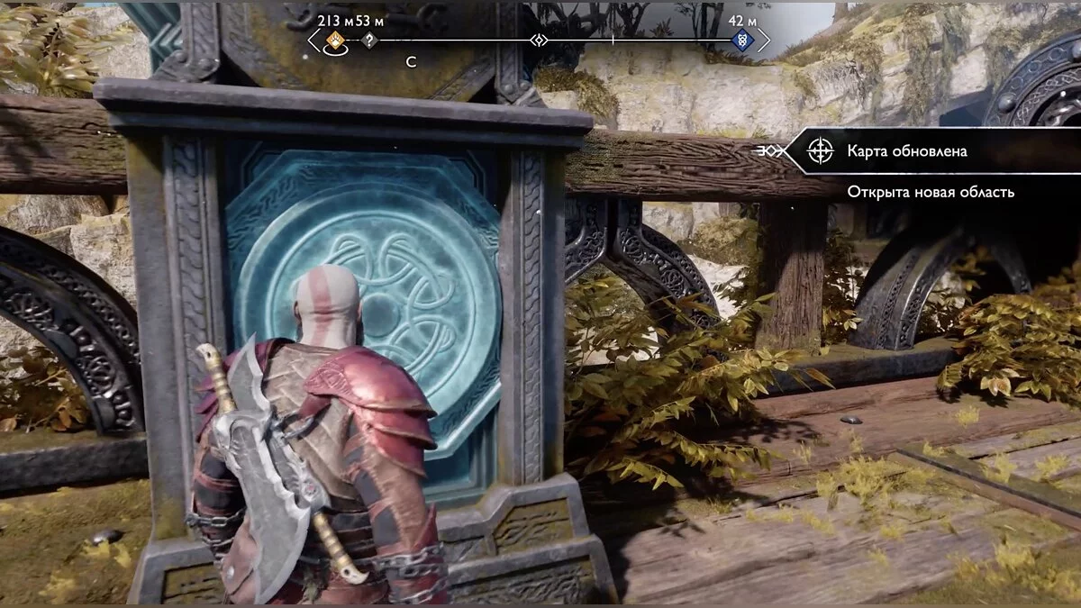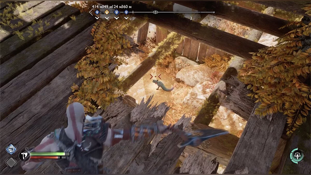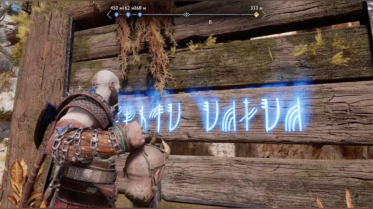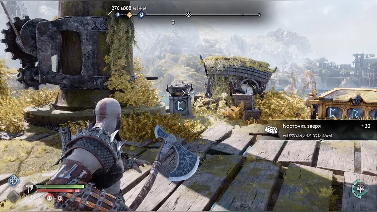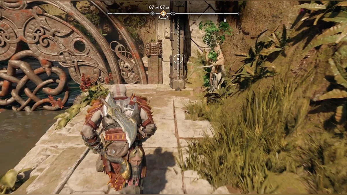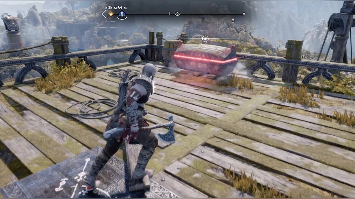После победы изучите синие руны и поднимитесь по цепи на деревянную платформу, чтобы убить пугливую ящерицу с ресурсам. С этой же платформы можно уничтожить одну из рунических печатей для сундука норн — ориентируйтесь на гейзеры. По такому же принципу разыщите остальные две печати. Второй гейзер слева от статуи дракона. Разбить печать не выйдет из-за металлической решетки, поэтому киньте топор справа от статуи. Третий гейзер будет в отдалении, ближе к центру локации.