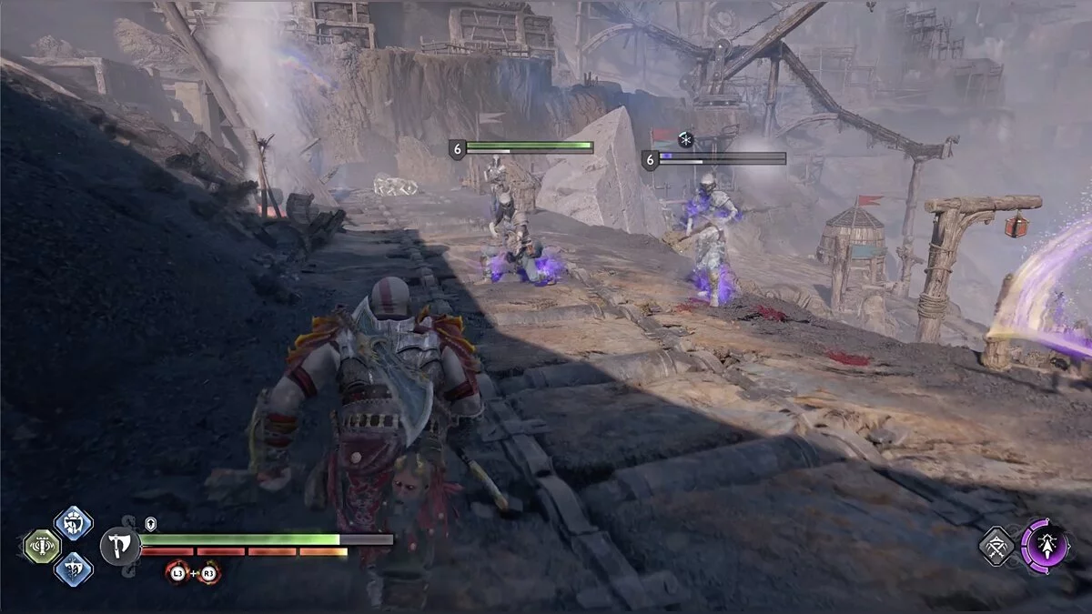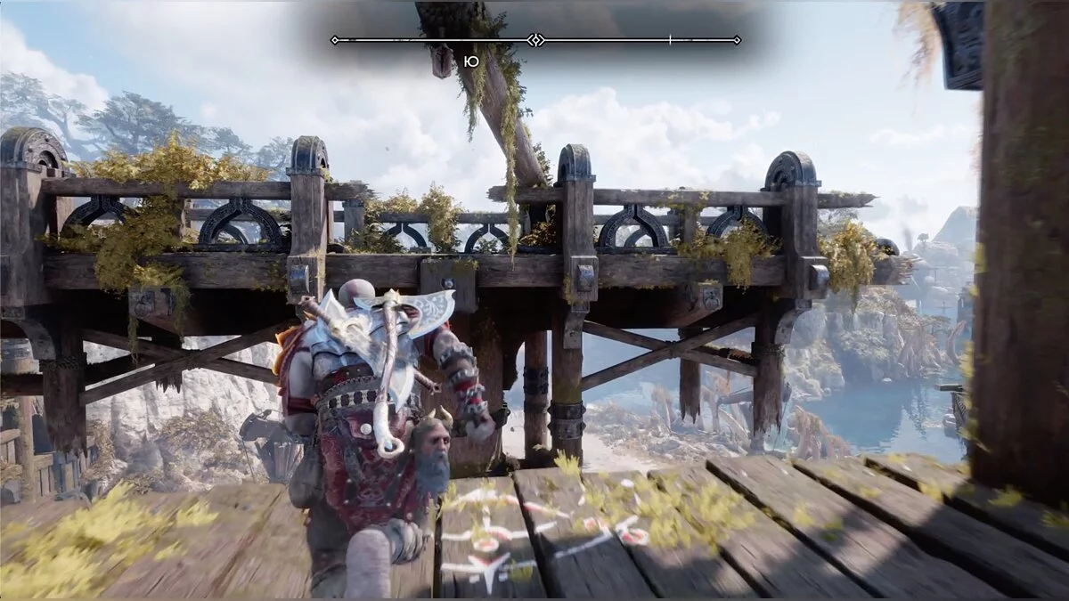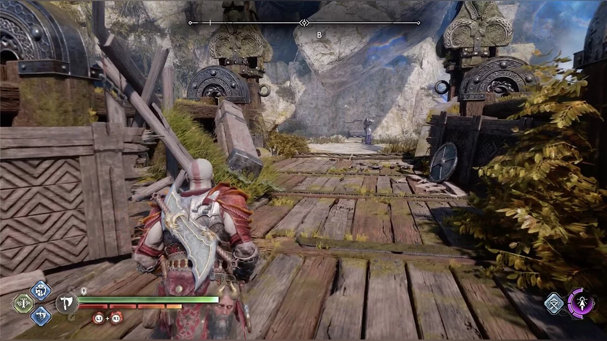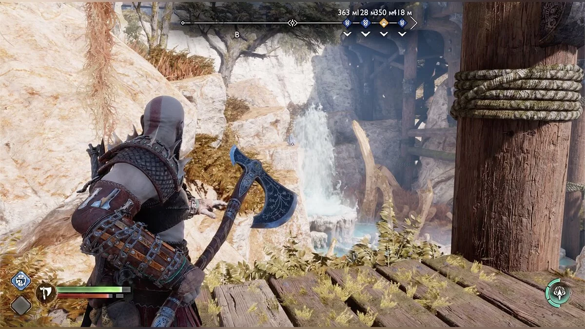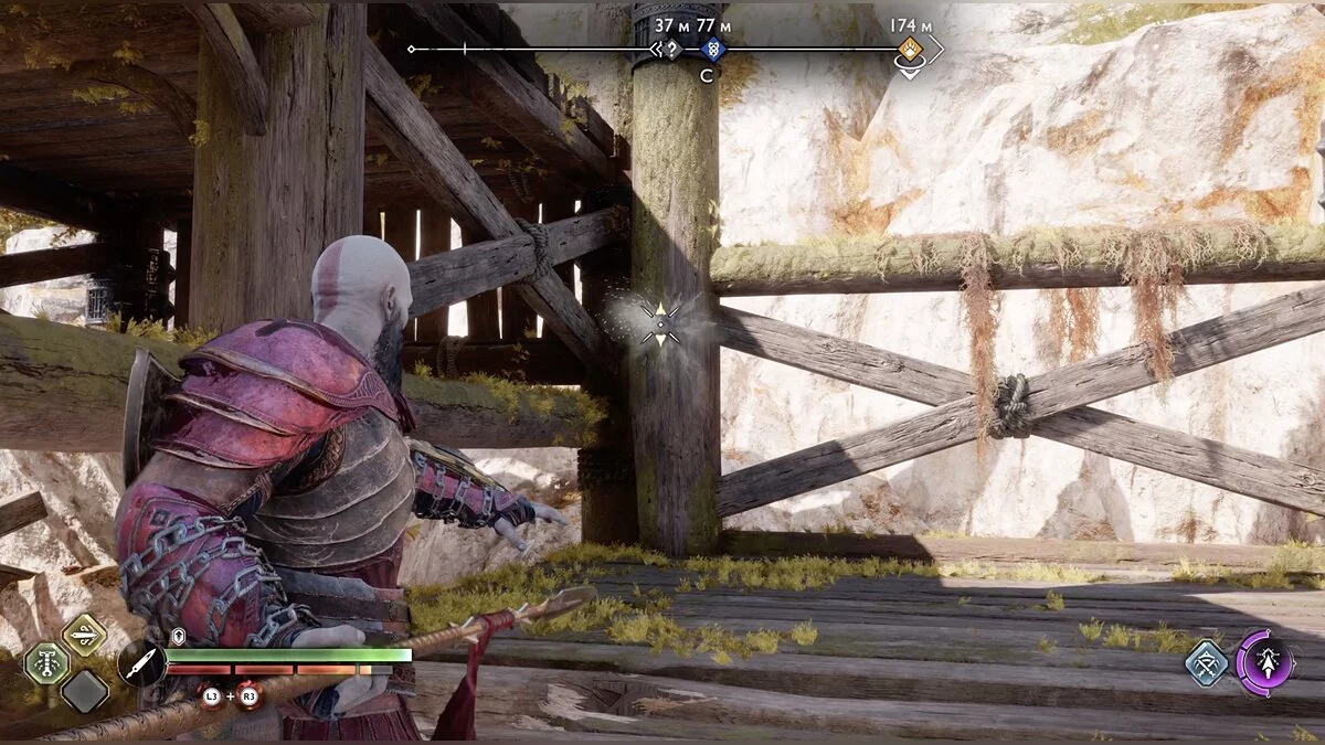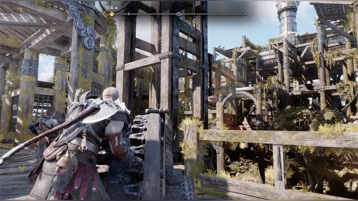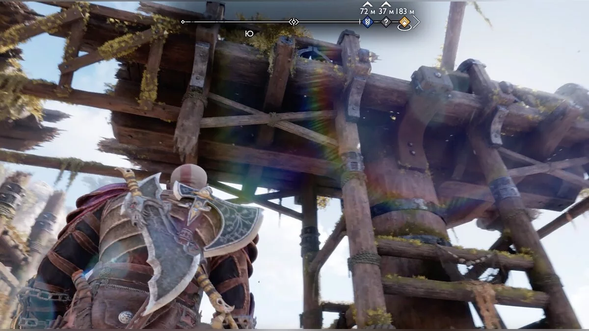 Теперь заберитесь наверх к колесу, и используйте его, чтобы поднять сцепку для клинков. Перепрыгните на другую сторону и лезьте по доскам наверх к буровой установке. После боя вы выполните просьбу «На службе Асгарду», однако это не все доступные побочные миссии в этой локации.