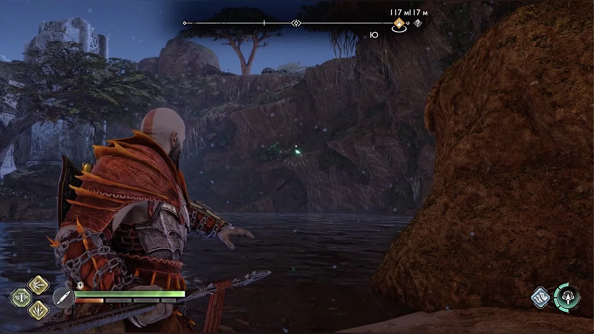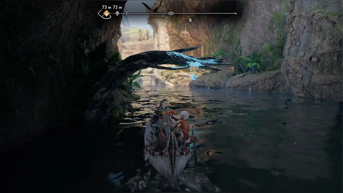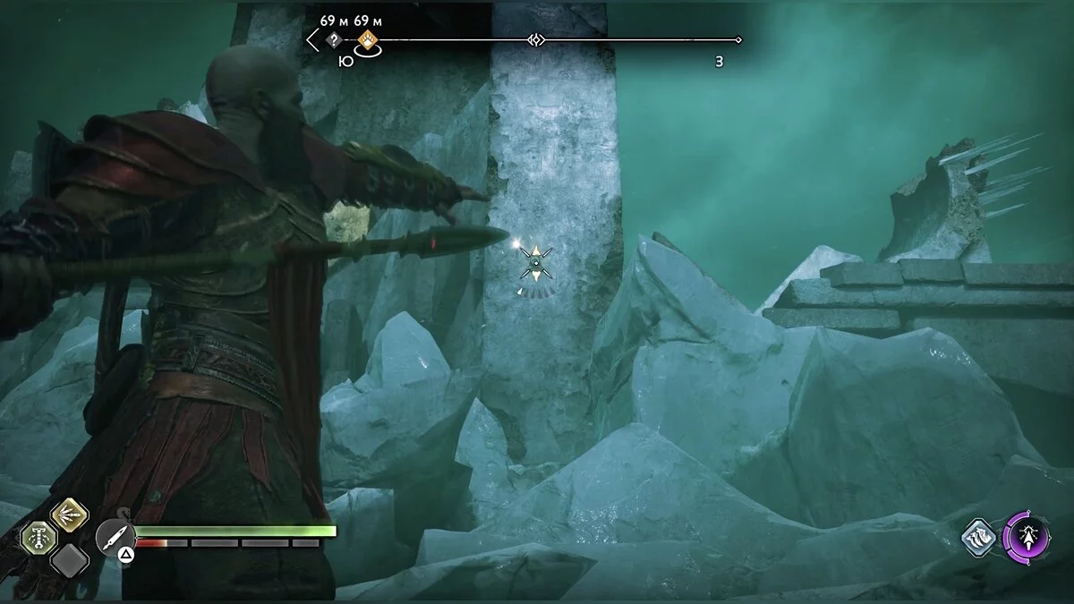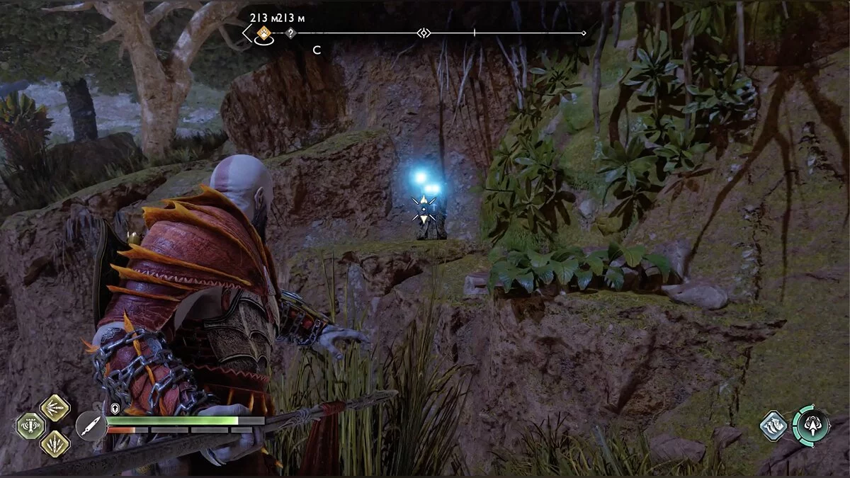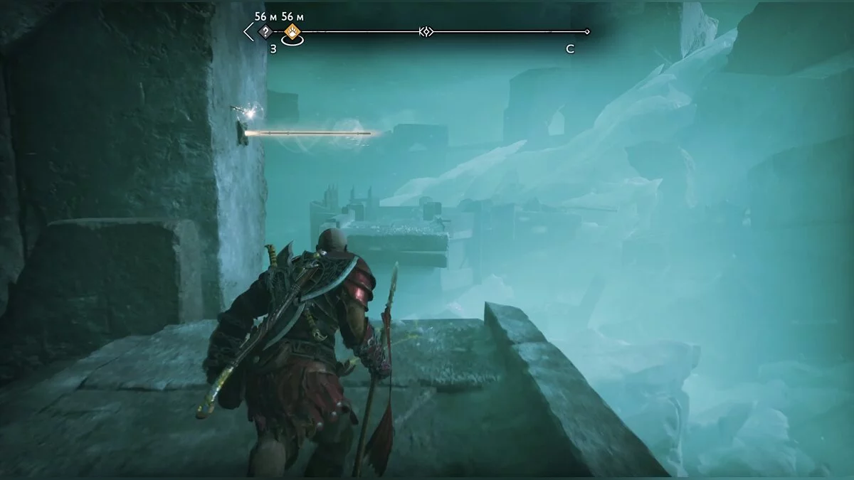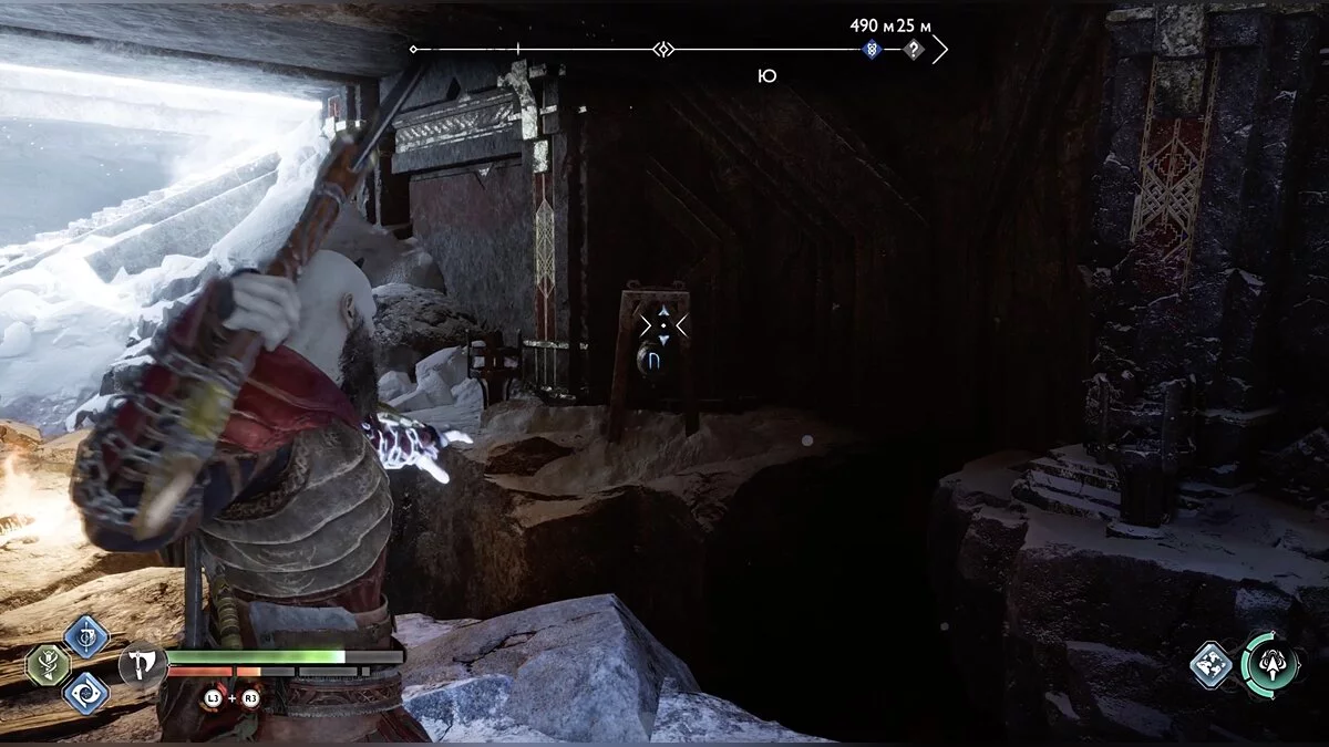 Здесь вы ранее открывали сундук норн, теперь же тут место для броска копья. Заберитесь по нему на уступ и найдете призрака сына. Теперь нужно найти оставшееся сокровище. Идите вперед, слева преграда для зеленой стрелы. Разбейте ее и дойдите до конца — ворон Одина.
