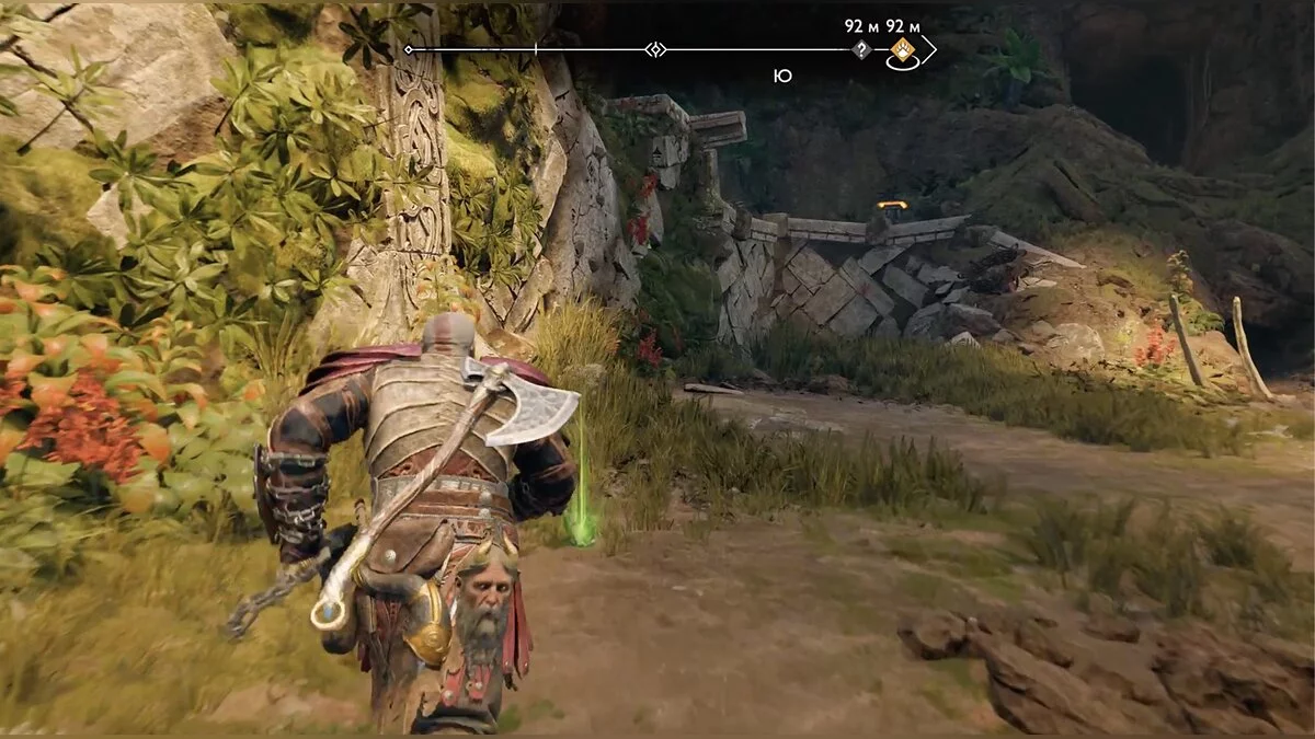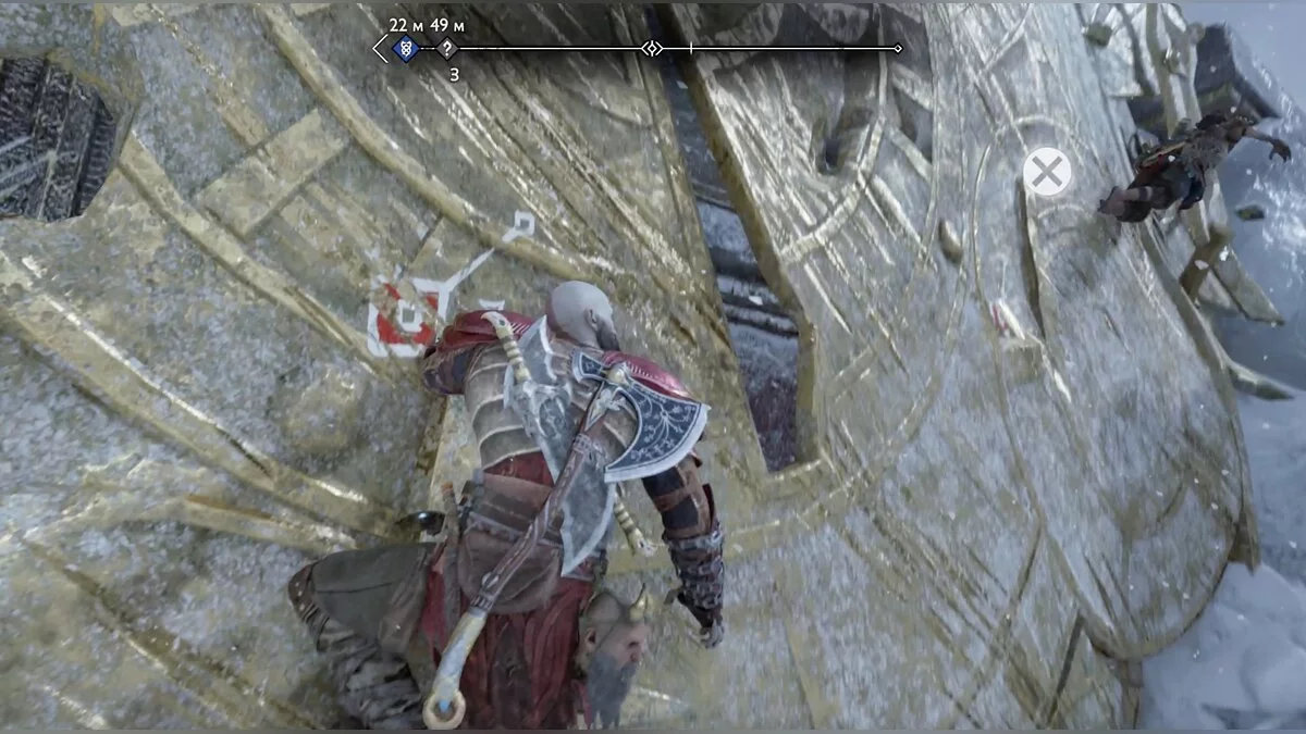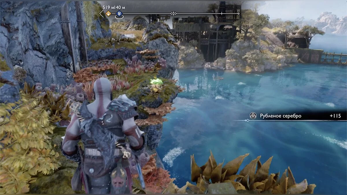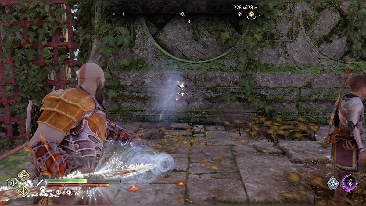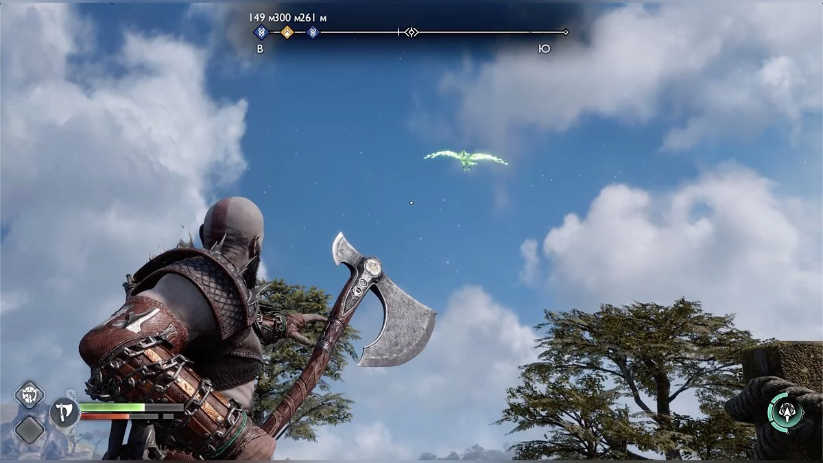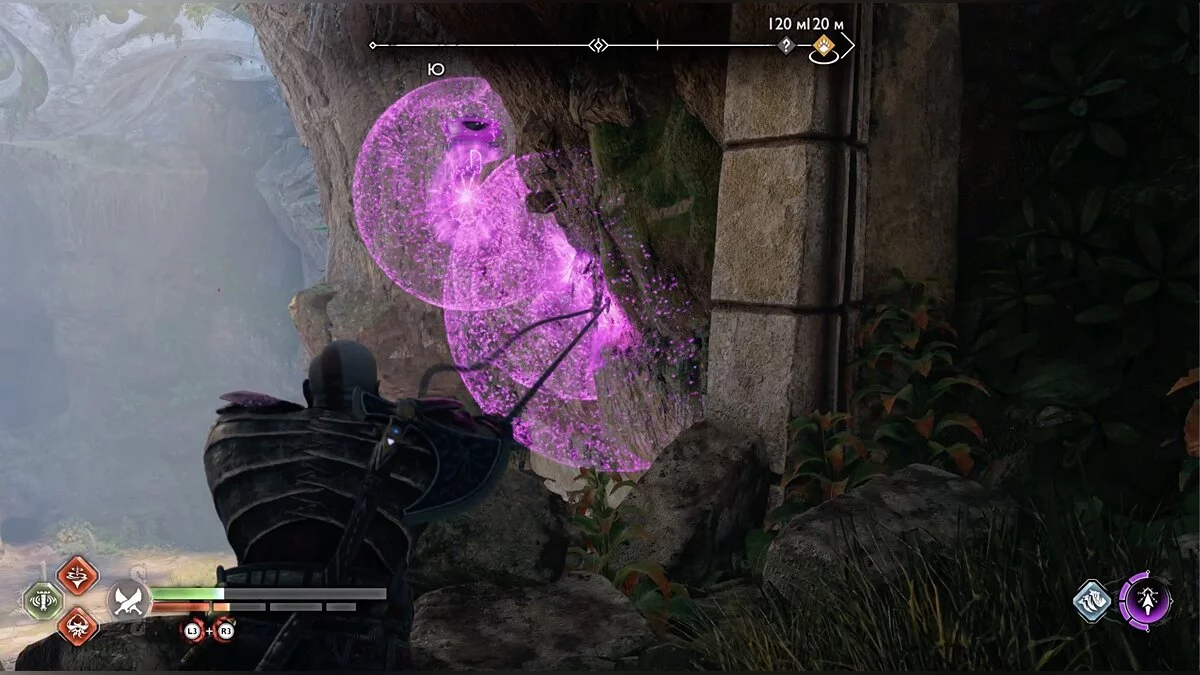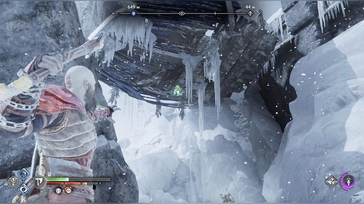 Здесь вы ранее открывали сундук норн, теперь же тут место для броска копья. Заберитесь по нему на уступ и найдете призрака сына. Теперь нужно найти оставшееся сокровище. Идите вперед, слева преграда для зеленой стрелы. Разбейте ее и дойдите до конца — ворон Одина.