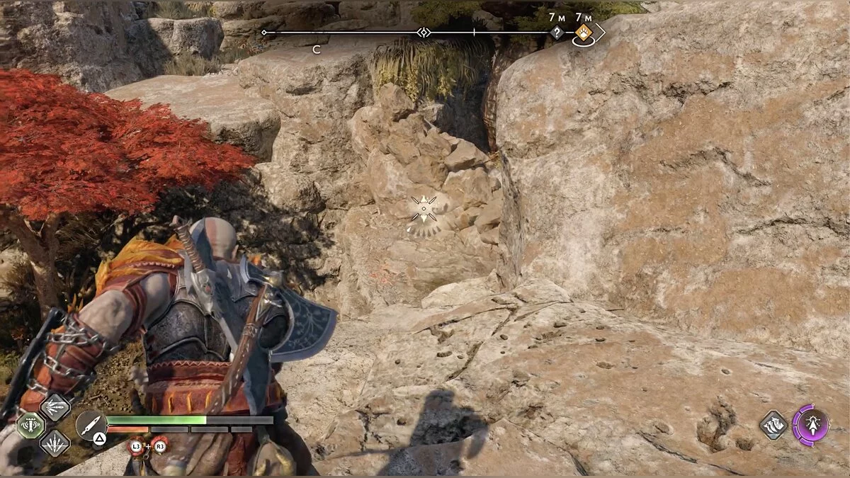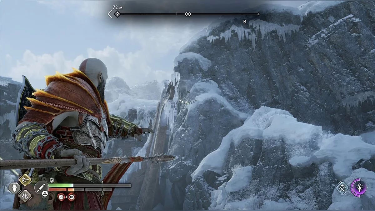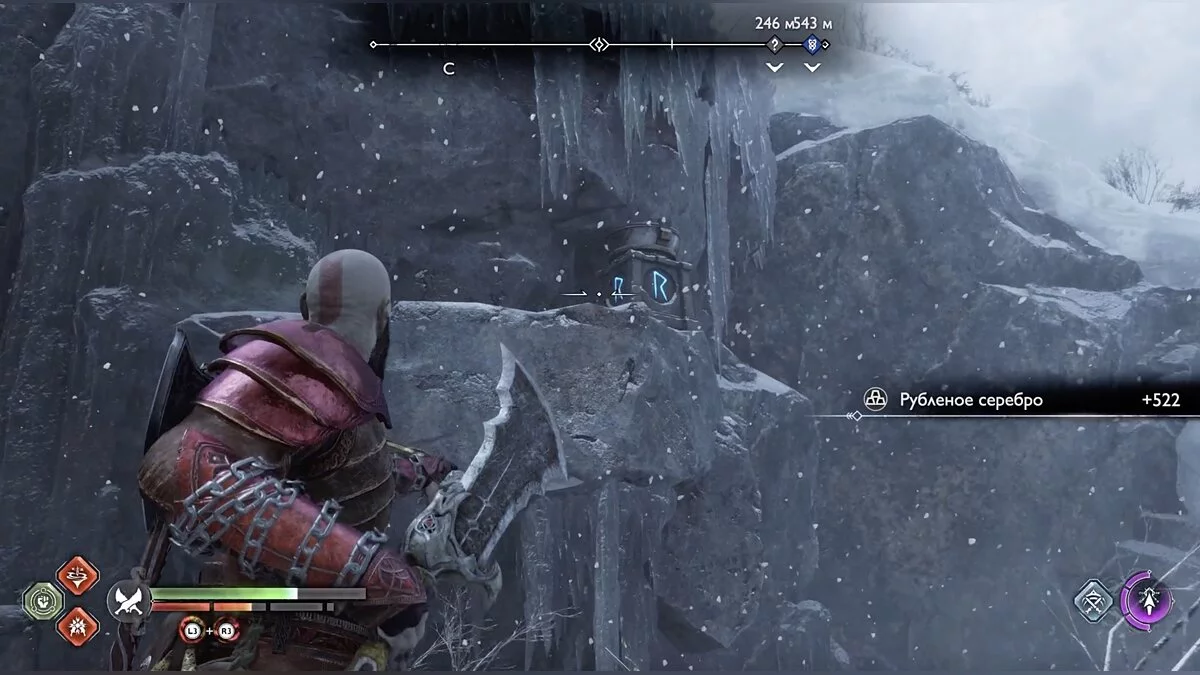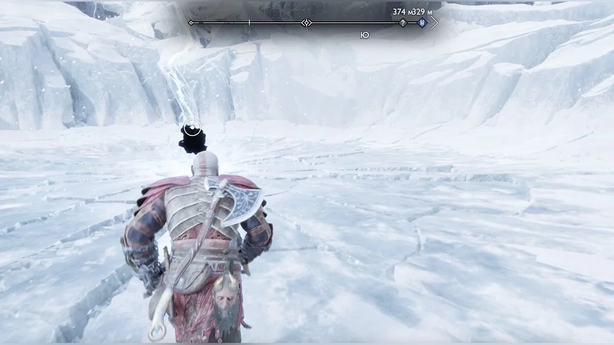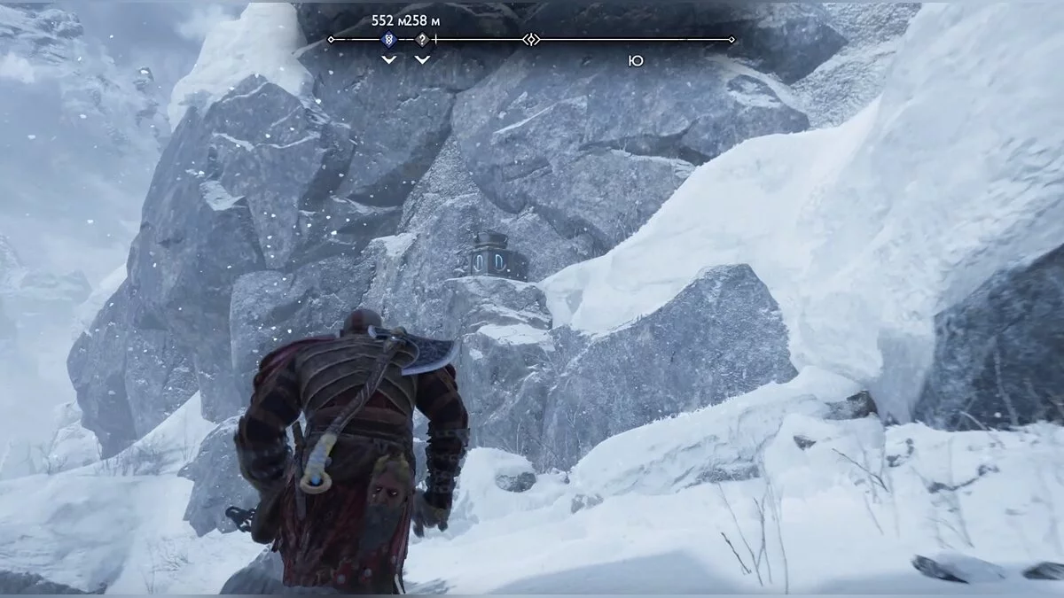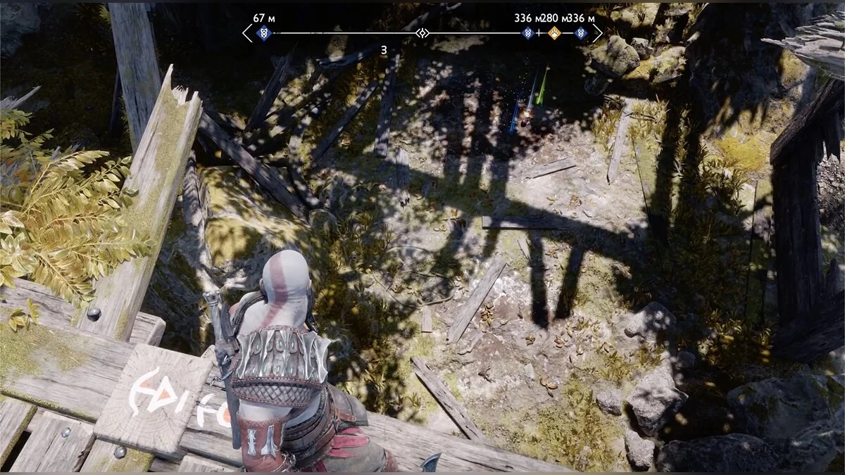 Здесь вы ранее открывали сундук норн, теперь же тут место для броска копья. Заберитесь по нему на уступ и найдете призрака сына. Теперь нужно найти оставшееся сокровище. Идите вперед, слева преграда для зеленой стрелы. Разбейте ее и дойдите до конца — ворон Одина.