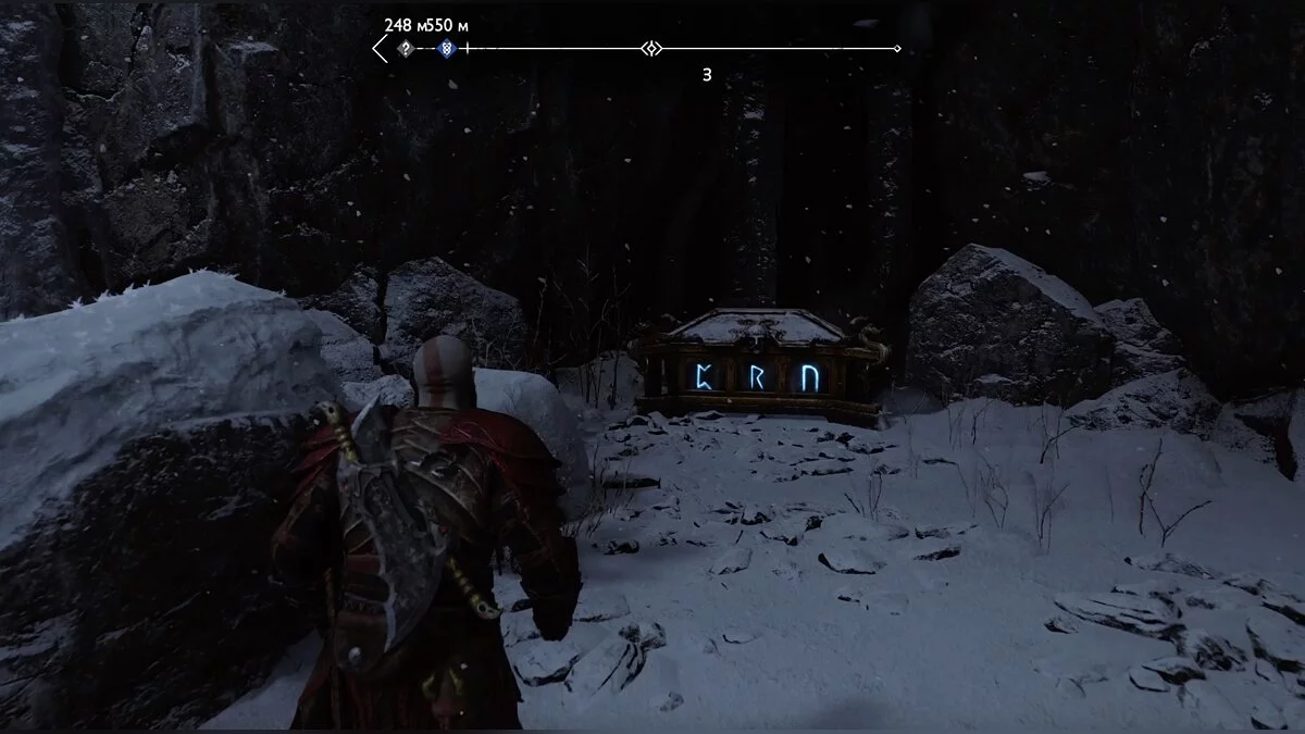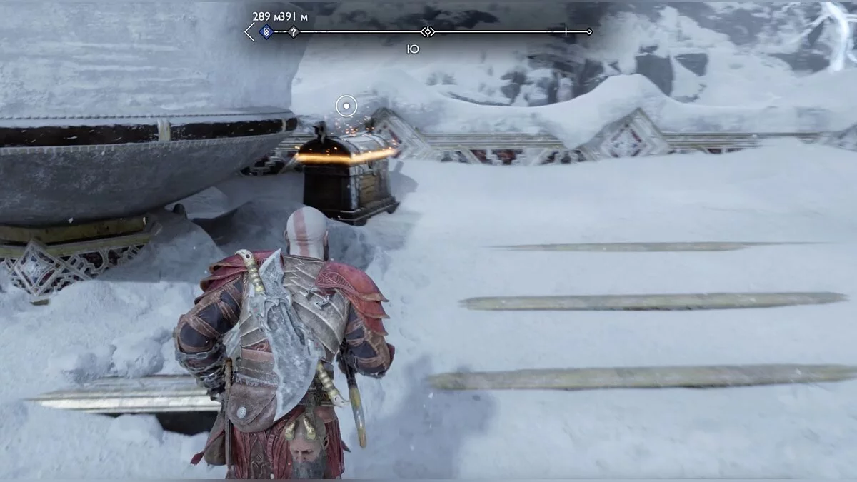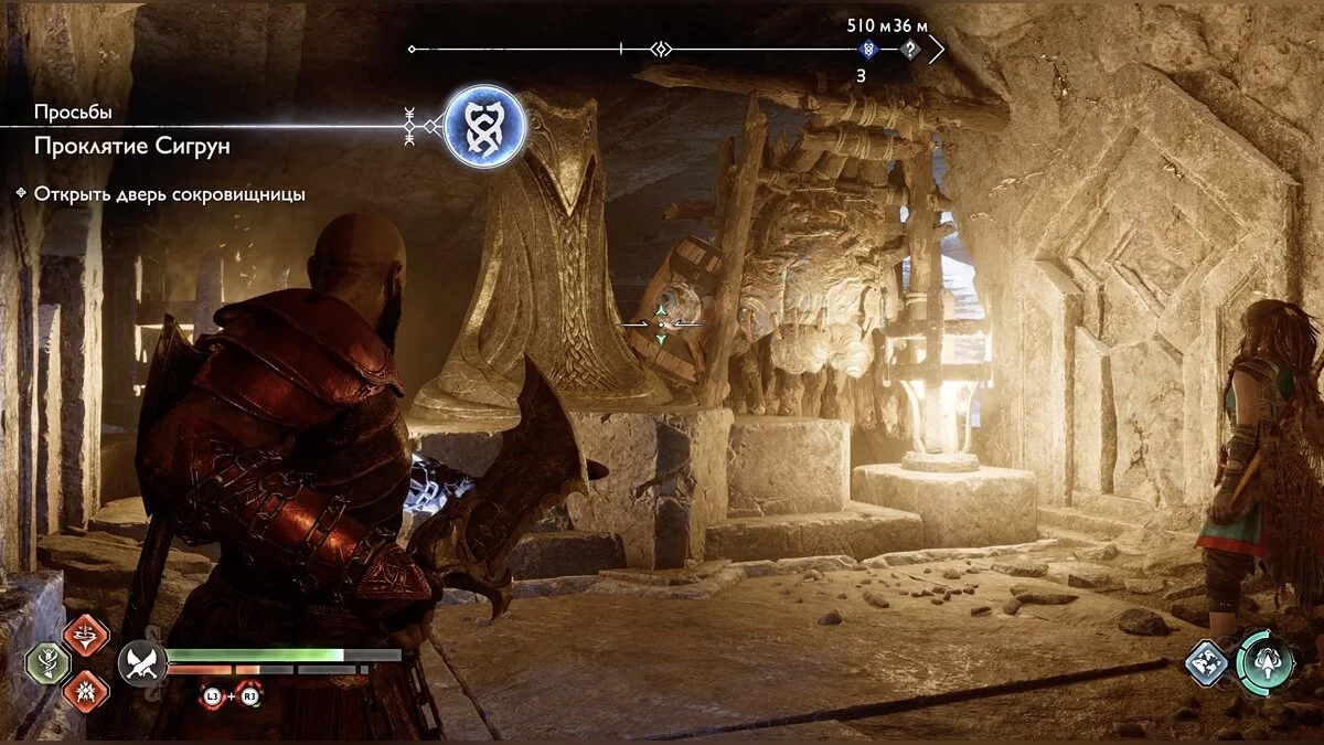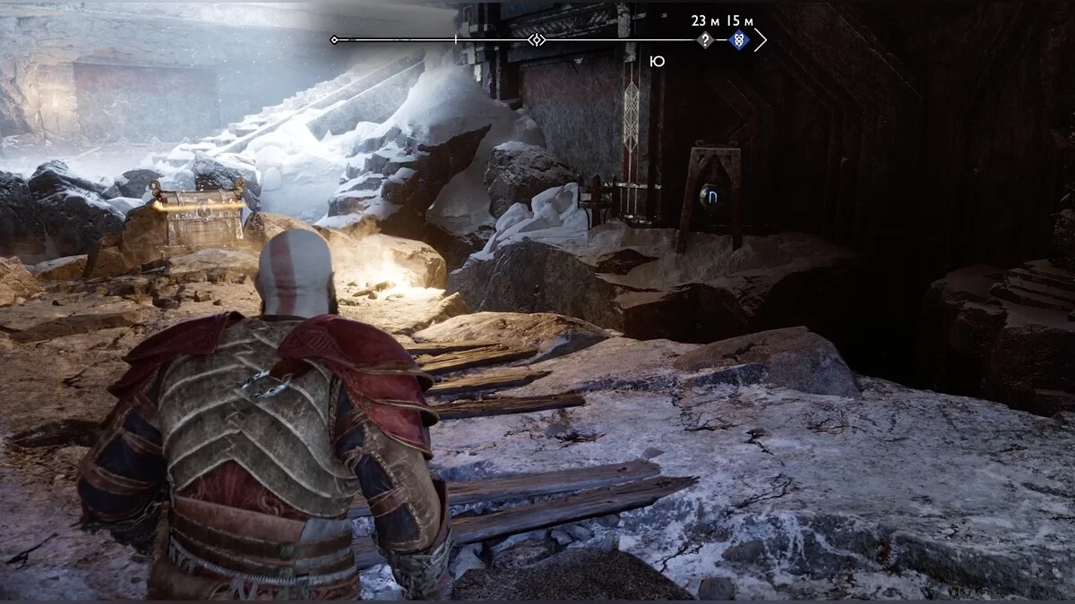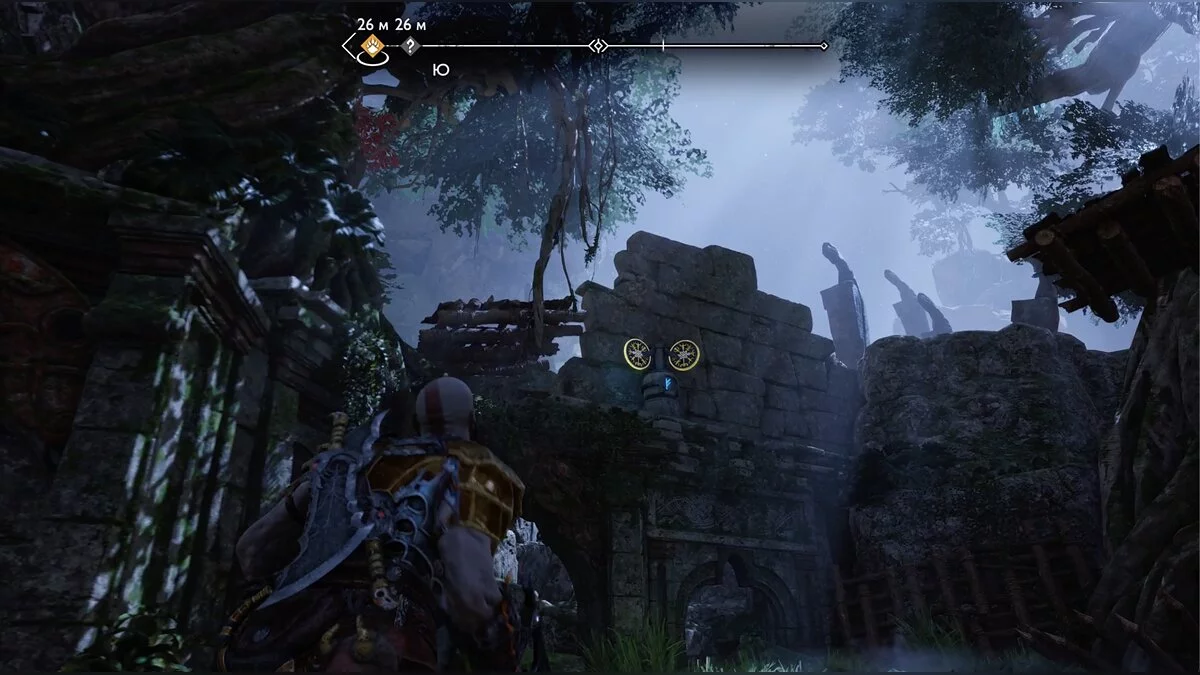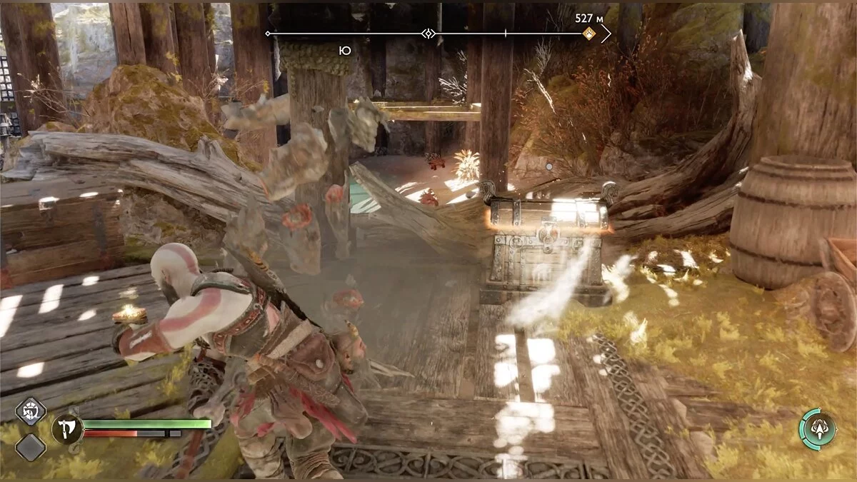 Забравшись по доскам, Кратос сможет проломить пол на нижний уровень. Победите врагов, откройте малый сундук и прочитайте синие руны. Благодаря тому, что вы заранее опустили колесом механизм, можно перепрыгнуть к большому сундуку. Возвращайтесь туда, где сражались с драугами и читали руны, опущенный подъемник можно поднять клинками.