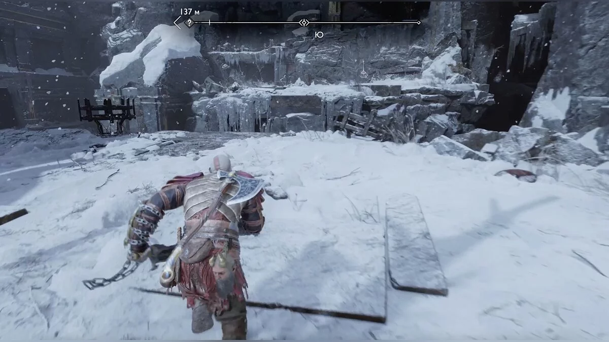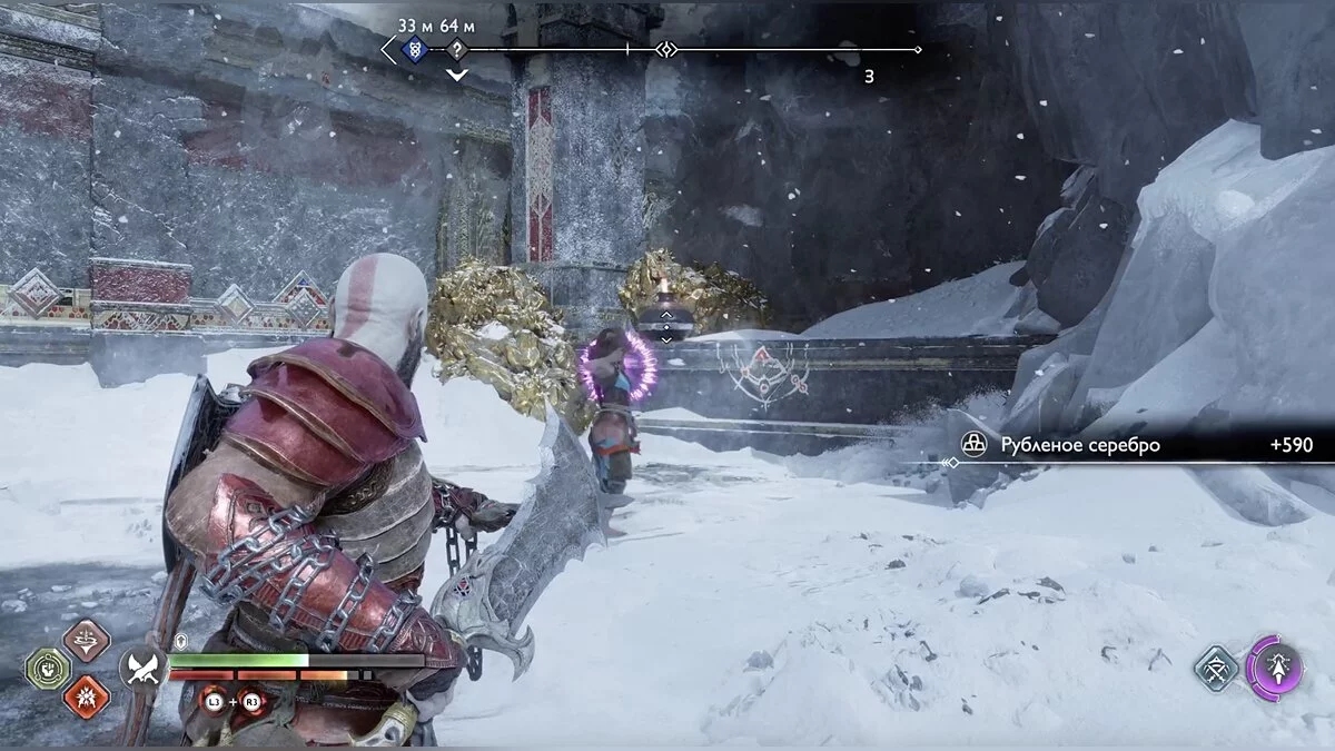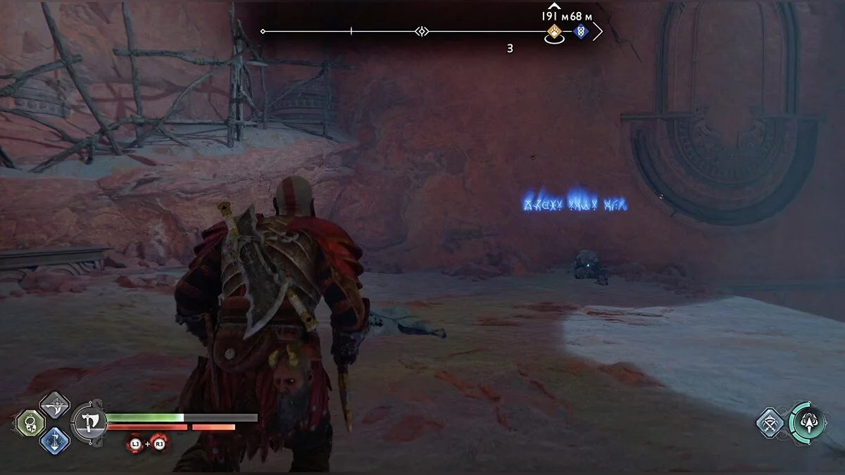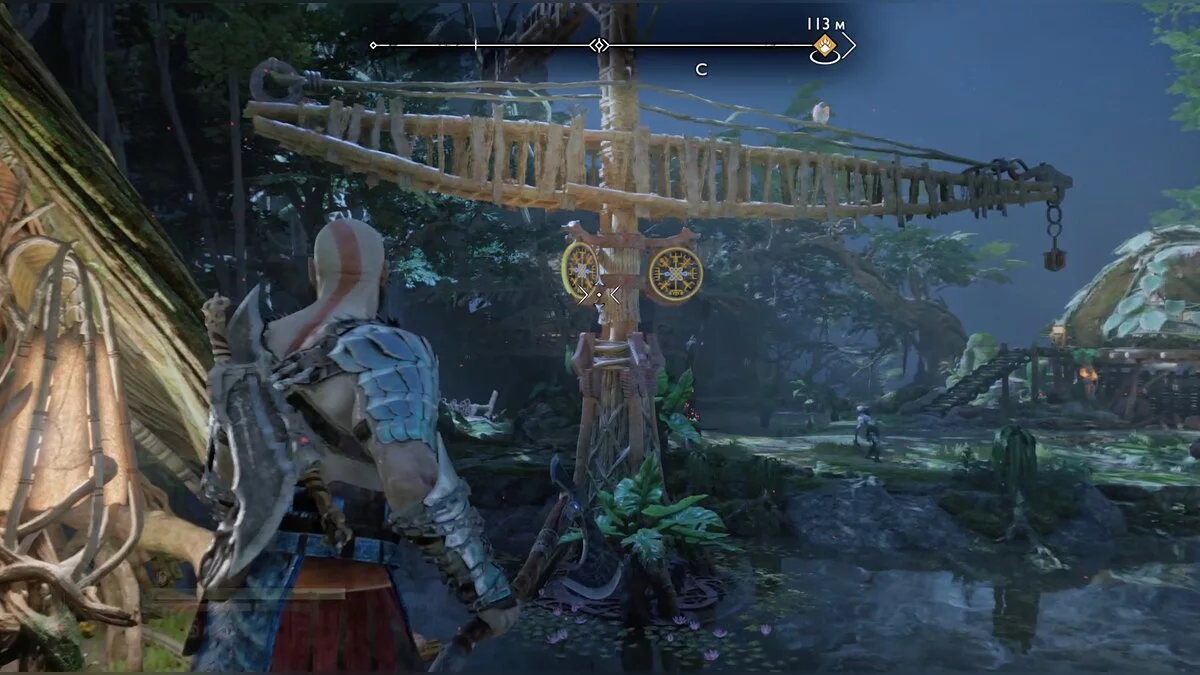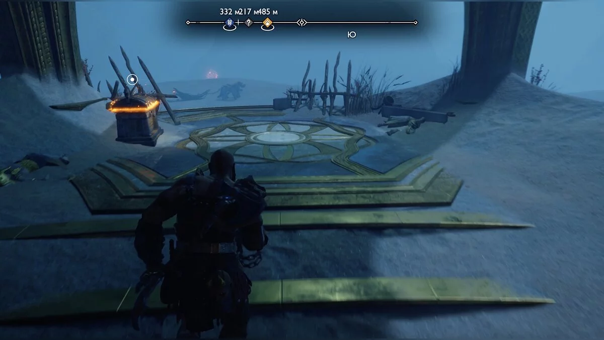 Забравшись по доскам, Кратос сможет проломить пол на нижний уровень. Победите врагов, откройте малый сундук и прочитайте синие руны. Благодаря тому, что вы заранее опустили колесом механизм, можно перепрыгнуть к большому сундуку. Возвращайтесь туда, где сражались с драугами и читали руны, опущенный подъемник можно поднять клинками.
