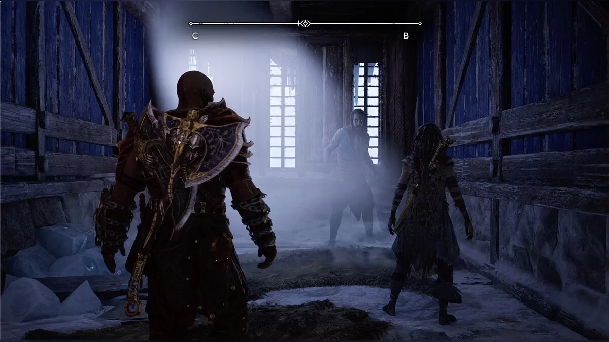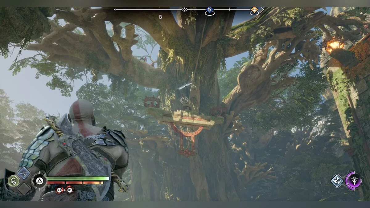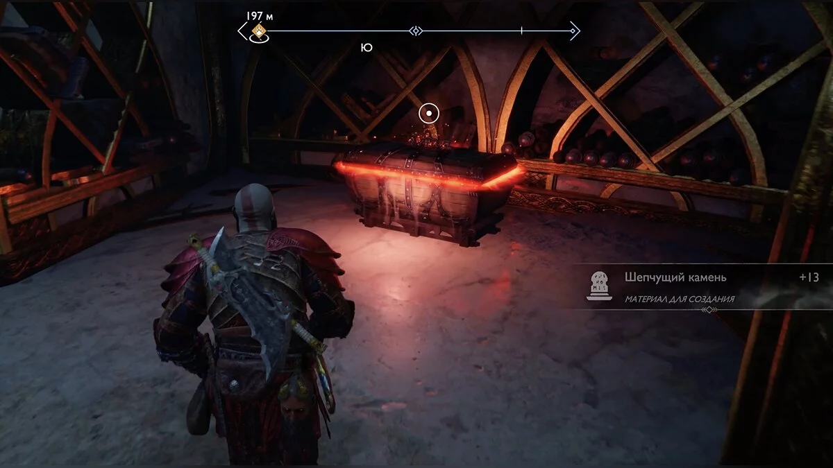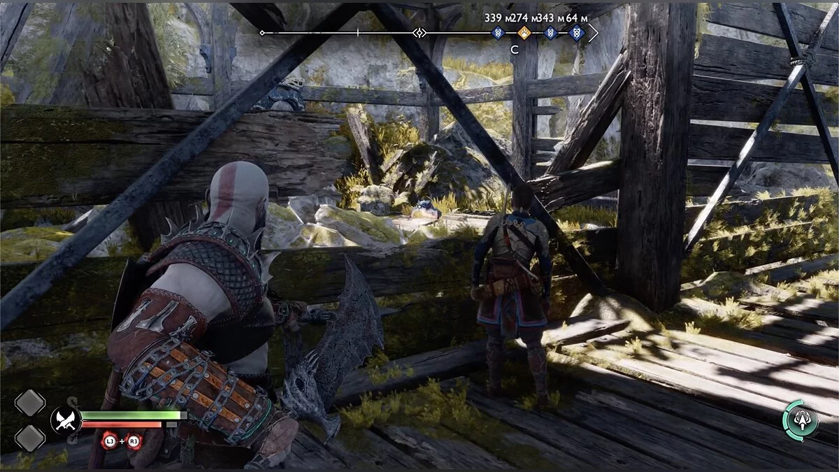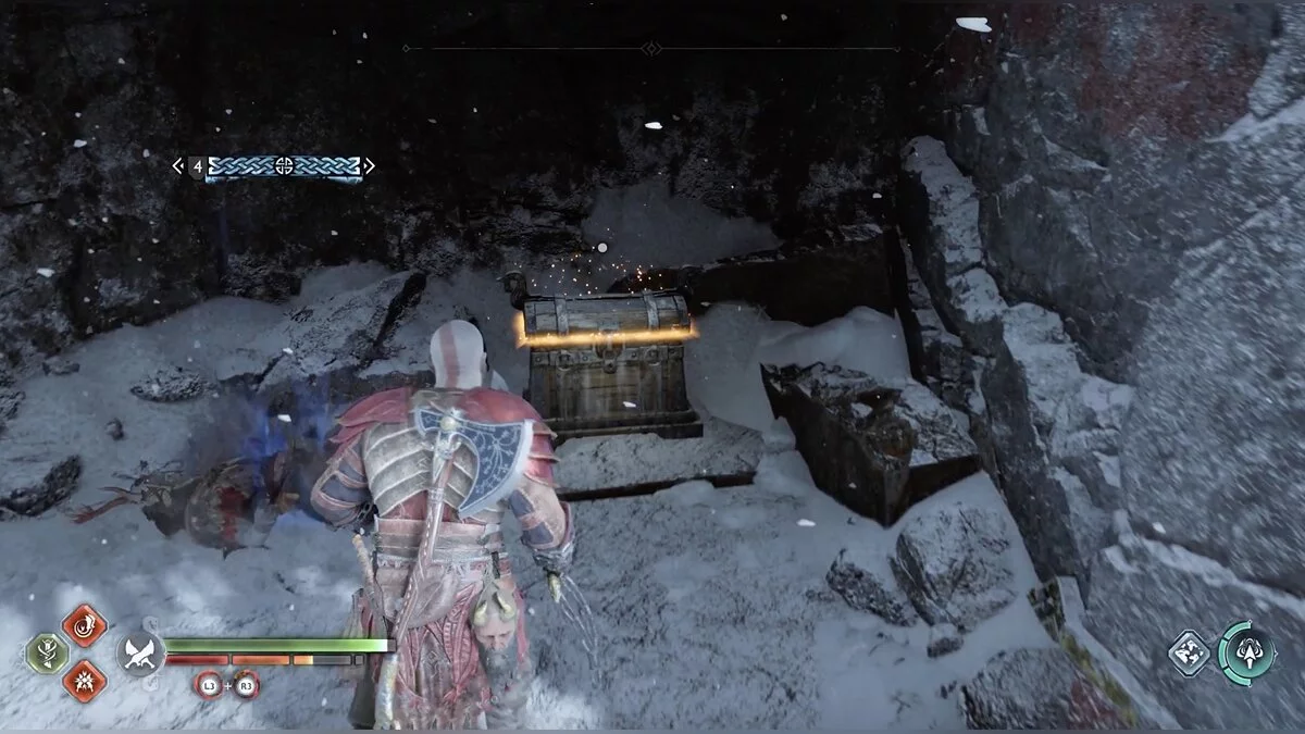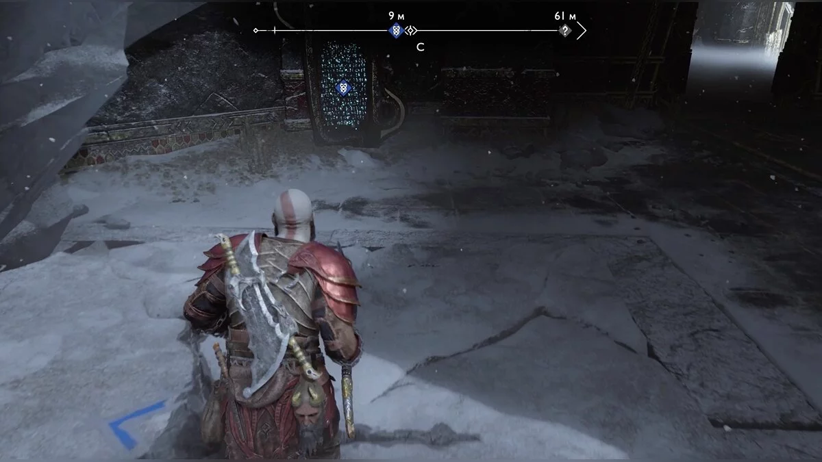 Забравшись по доскам, Кратос сможет проломить пол на нижний уровень. Победите врагов, откройте малый сундук и прочитайте синие руны. Благодаря тому, что вы заранее опустили колесом механизм, можно перепрыгнуть к большому сундуку. Возвращайтесь туда, где сражались с драугами и читали руны, опущенный подъемник можно поднять клинками.