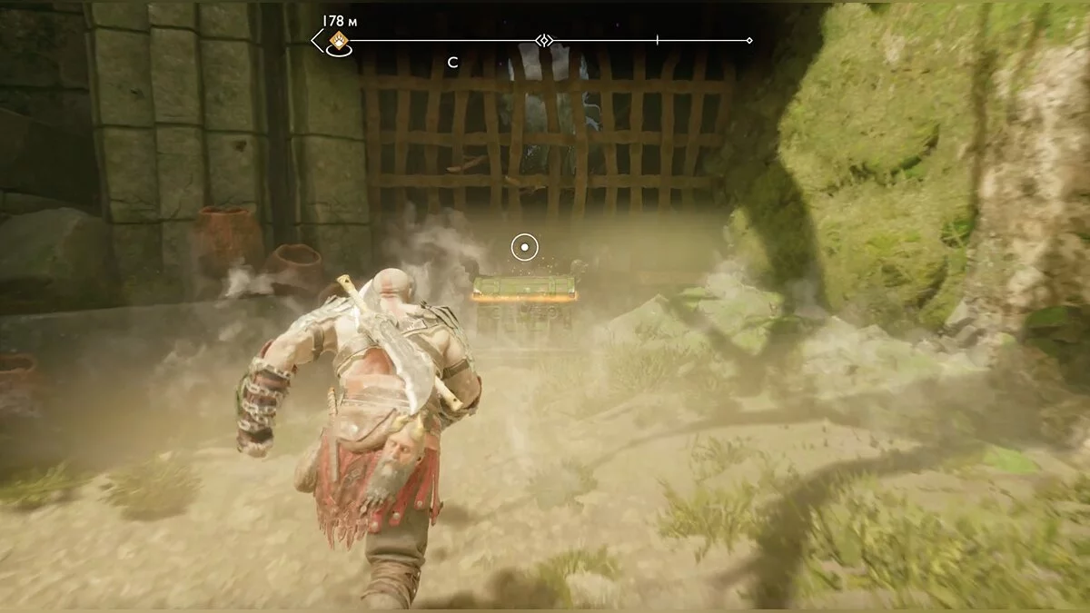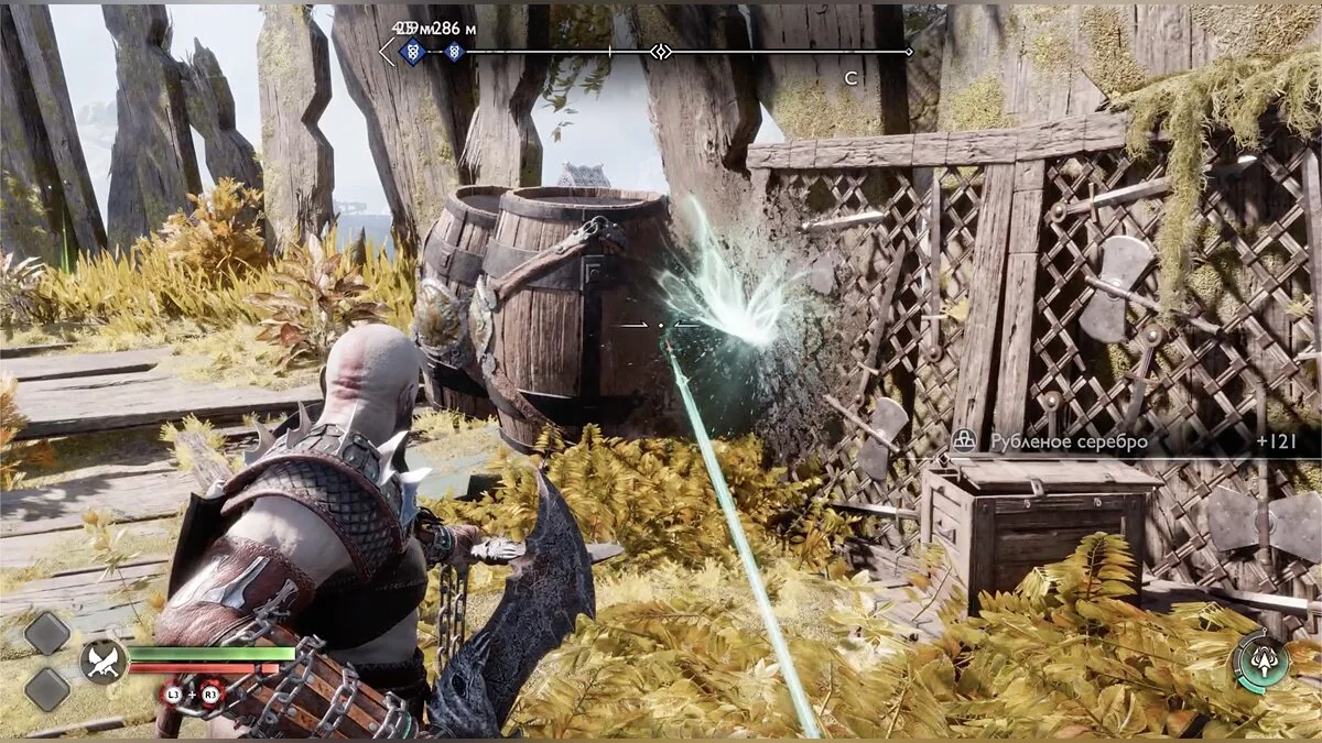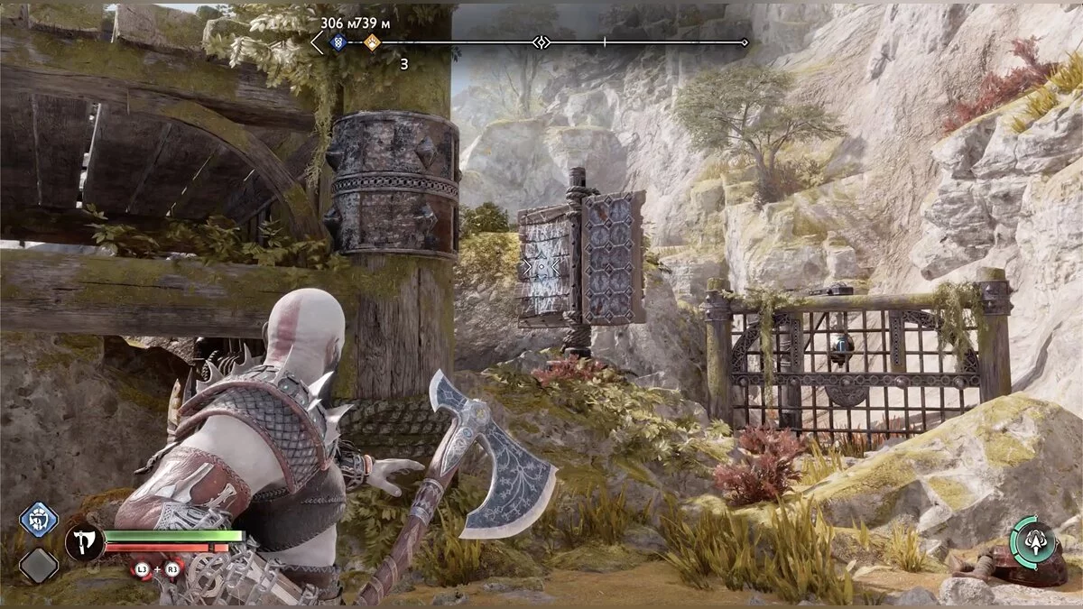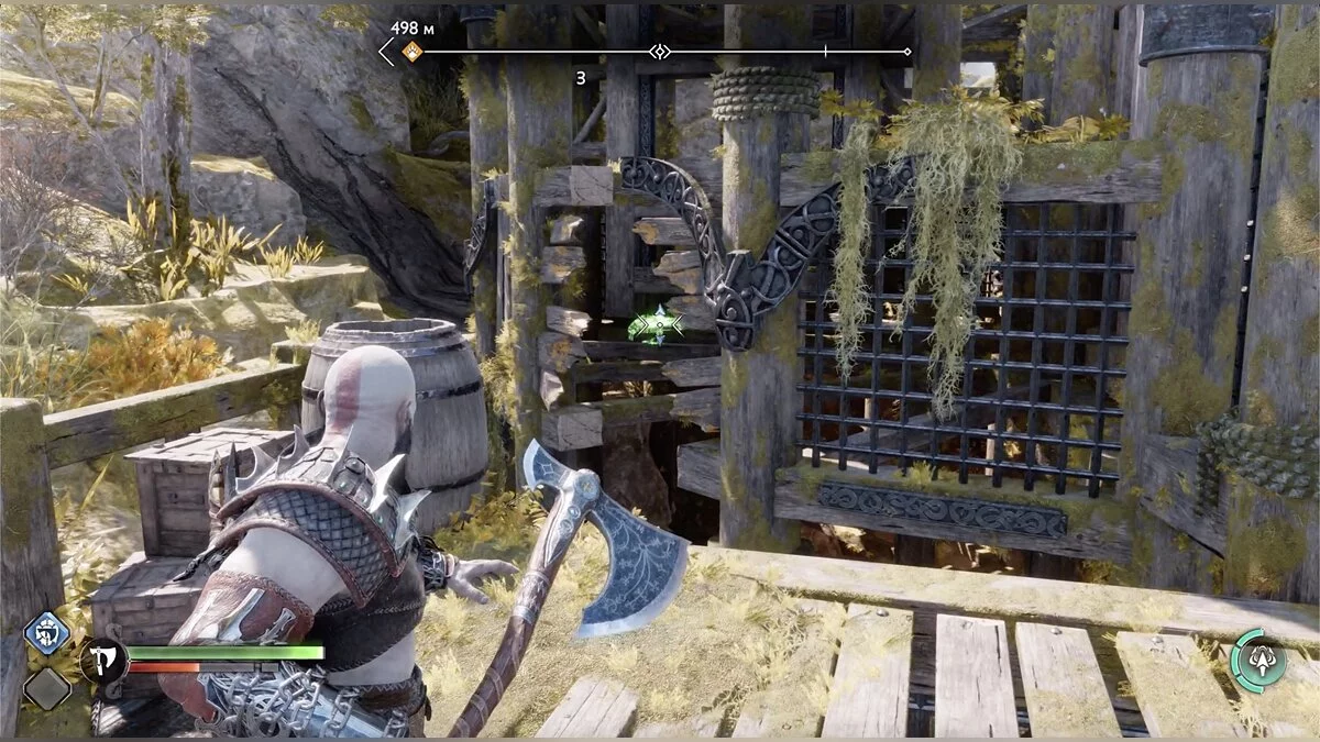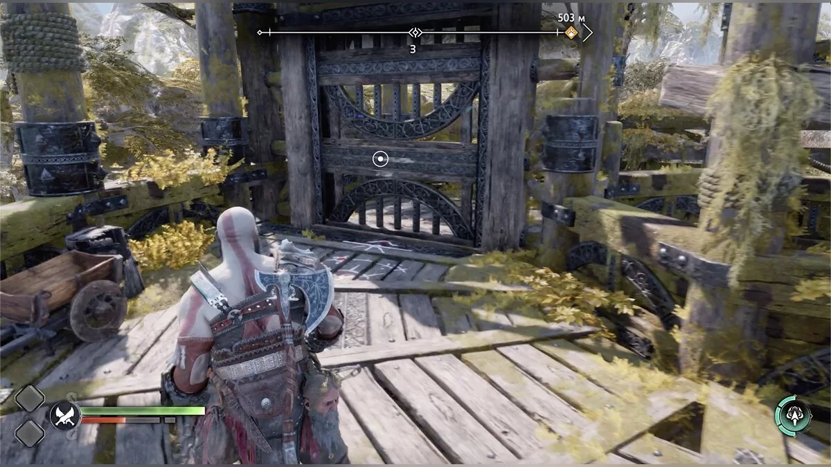 Идите в образовавшийся после взрыва проход, поднимитесь выше и поверните налево — можно сбросить щит, чтобы открыть быстрый подъем. Справа стоят закрытые ворота. К счастью, Кратос легко их откроет. Внизу будет еще одна взрывающаяся бочка и рубленое серебро. Вы разблокируете еще один быстрый переход, а также сможете подняться по доскам. Прежде чем сделать это, вернитесь к колесу и опустите устройство в самый низ.