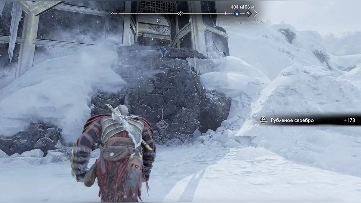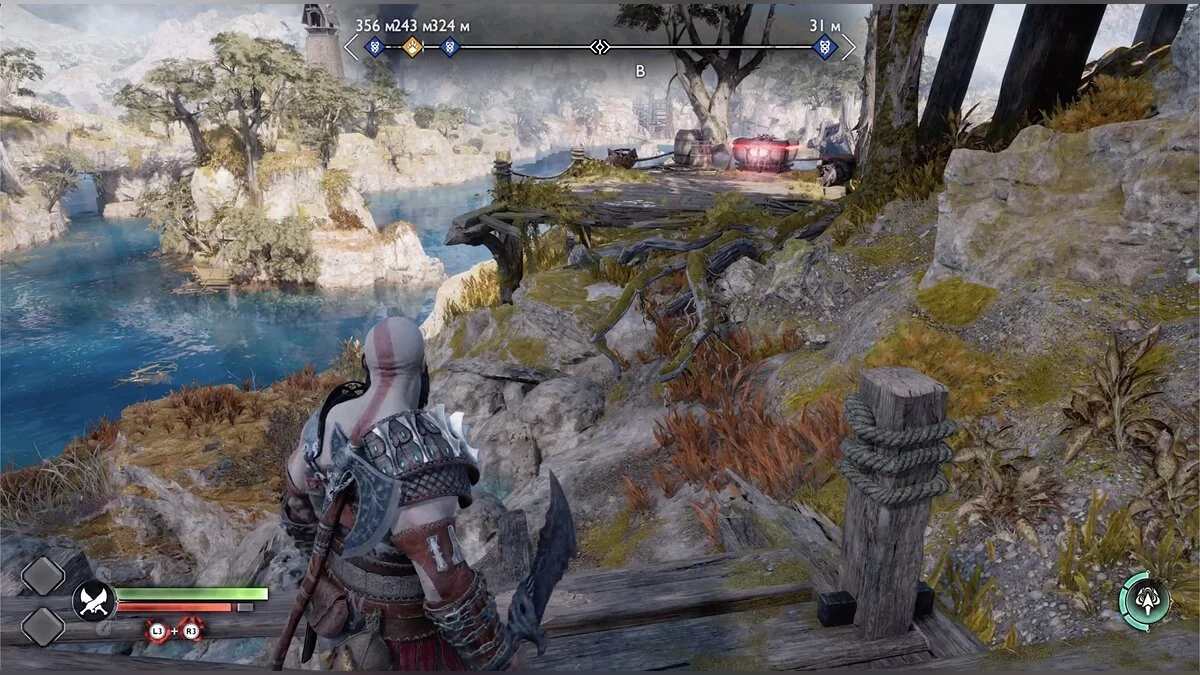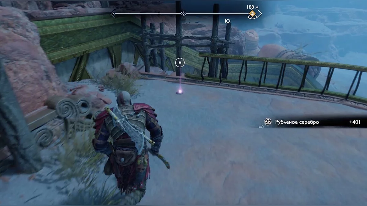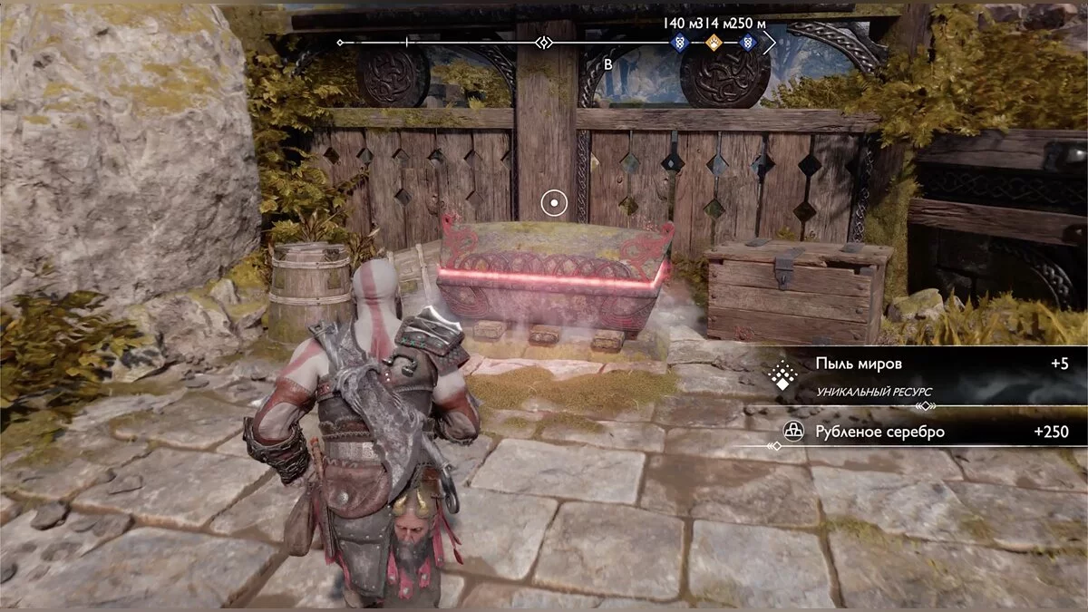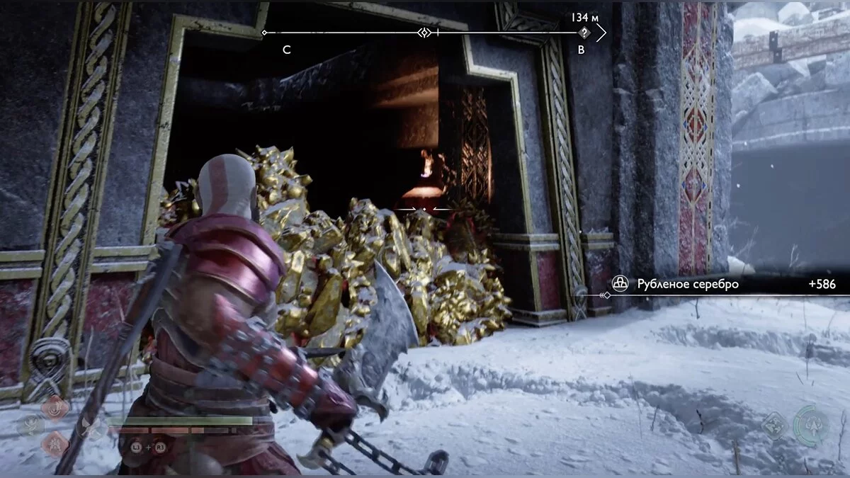 Идите в образовавшийся после взрыва проход, поднимитесь выше и поверните налево — можно сбросить щит, чтобы открыть быстрый подъем. Справа стоят закрытые ворота. К счастью, Кратос легко их откроет. Внизу будет еще одна взрывающаяся бочка и рубленое серебро. Вы разблокируете еще один быстрый переход, а также сможете подняться по доскам. Прежде чем сделать это, вернитесь к колесу и опустите устройство в самый низ.
