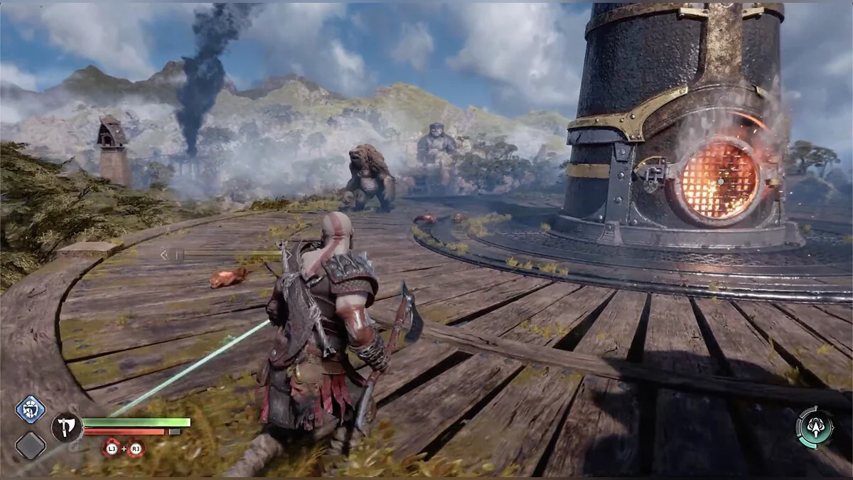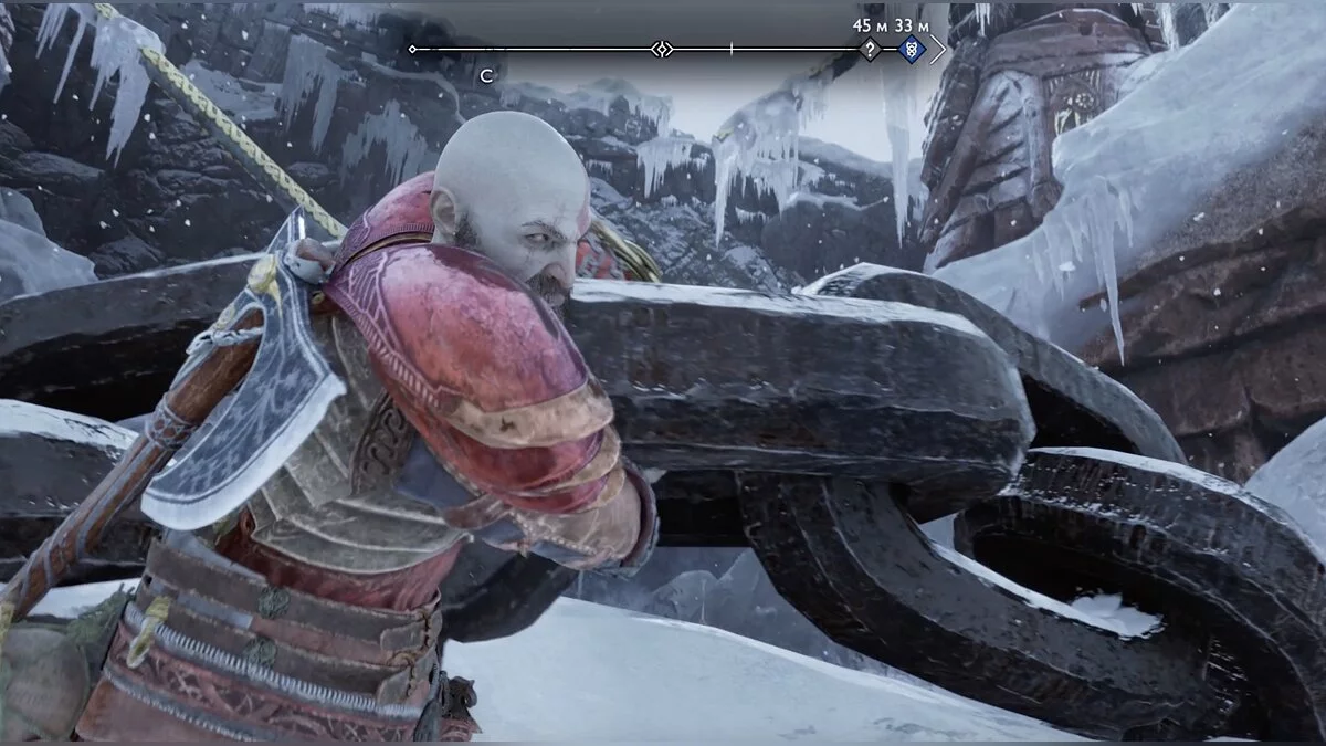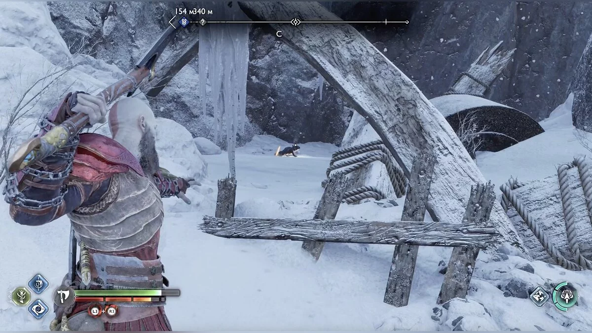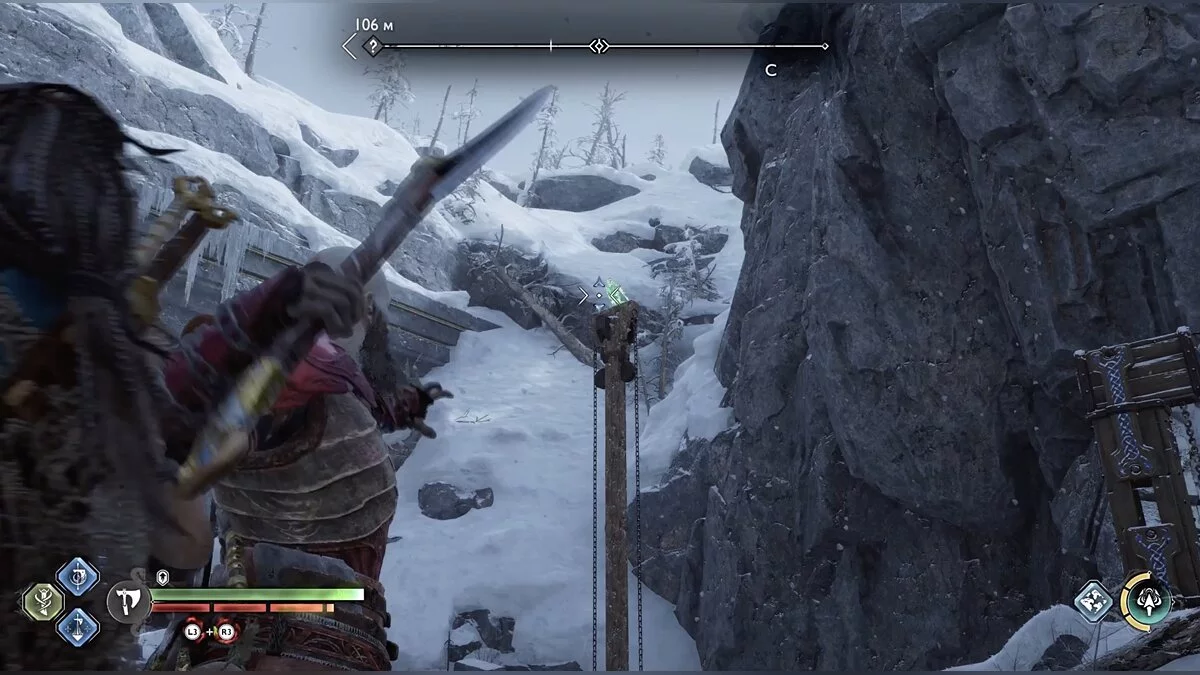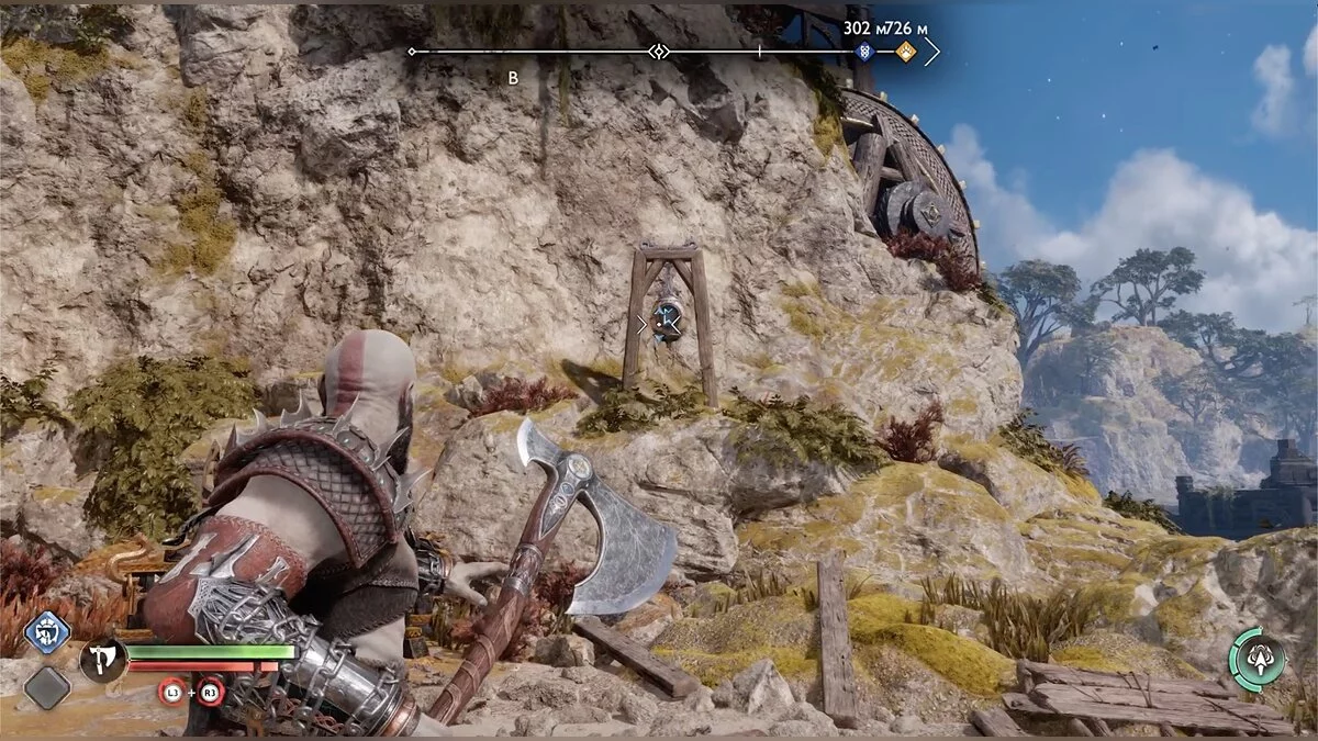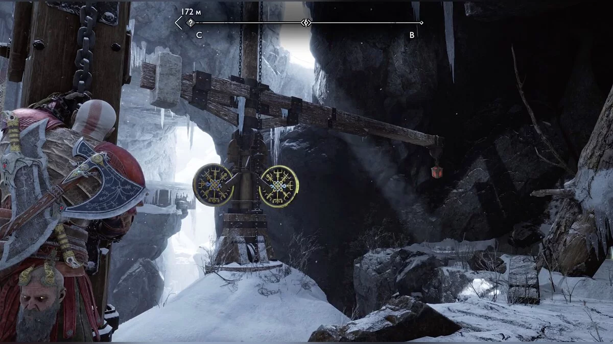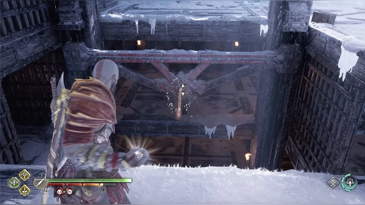 Обратите внимание, что на арене, где стоит буровая машина есть две бочки для выстрела Атрея. Разбейте их и пройдите по балке, чтобы опустить цепь и вернуться к колесу. Поднимите сцепку для клинков на самый верх, а затем вернитесь к месту, где вы только что сбросили цепь.