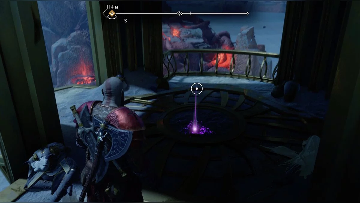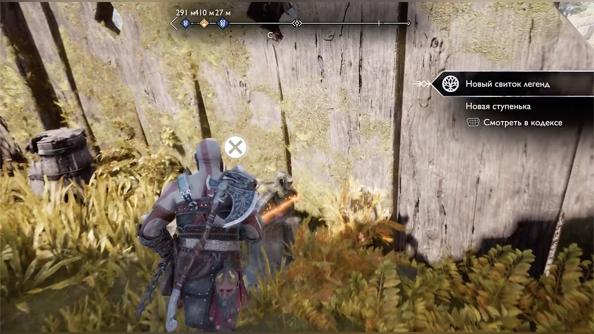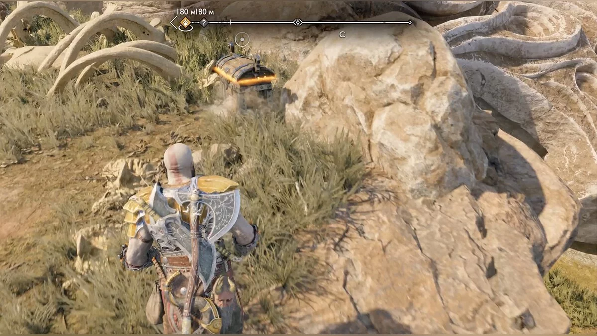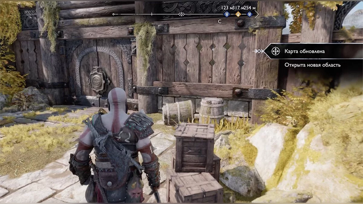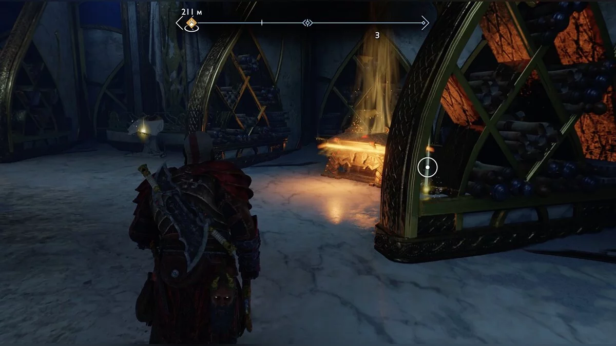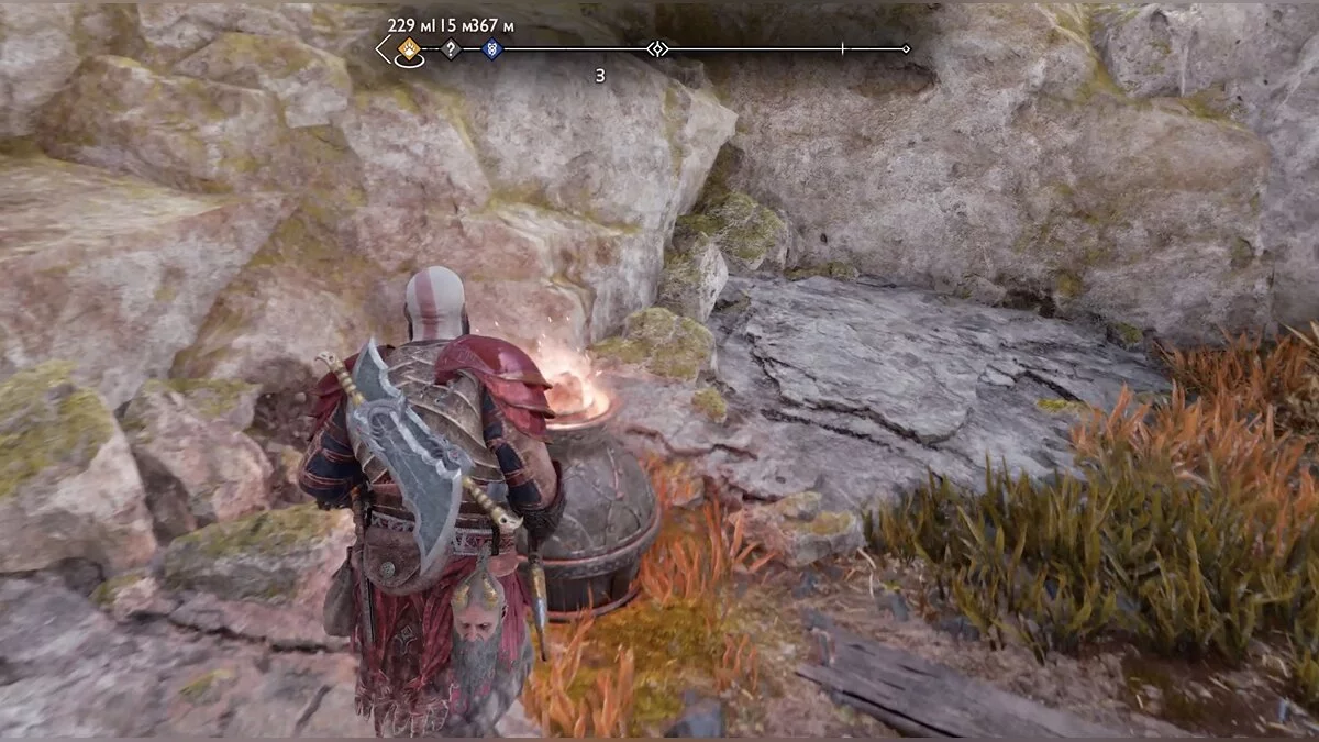 Вторая стоит рядом с сундуком, зажгите ее клинками. Идите в дальний конец арены, поднимите на полу свиток легенд и откройте малый сундук. Вдоль забора есть пара бочек, которые можно разбить специальными стрелами Атрея. В открывшейся дыре можно найти третью чашу. Заберите содержимое сундука норн и сломайте буровую установку. Тут же можно найти ворона Одина.
