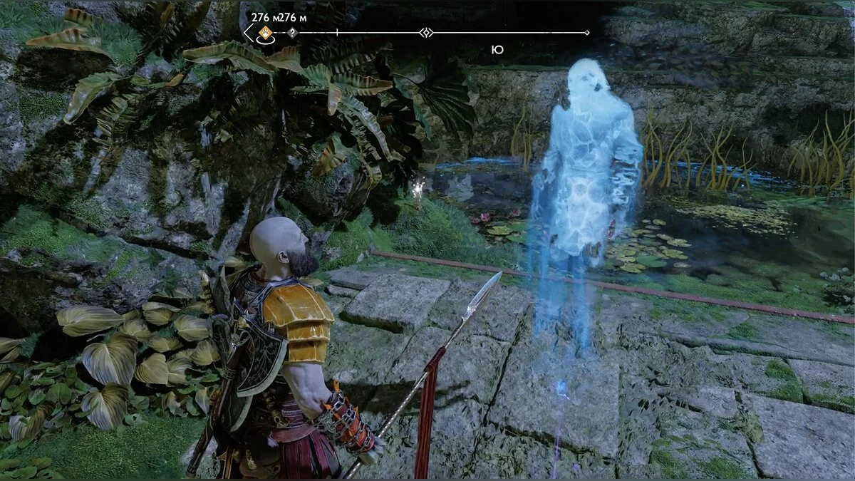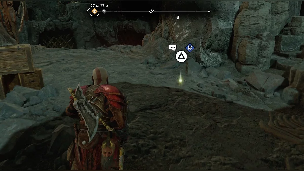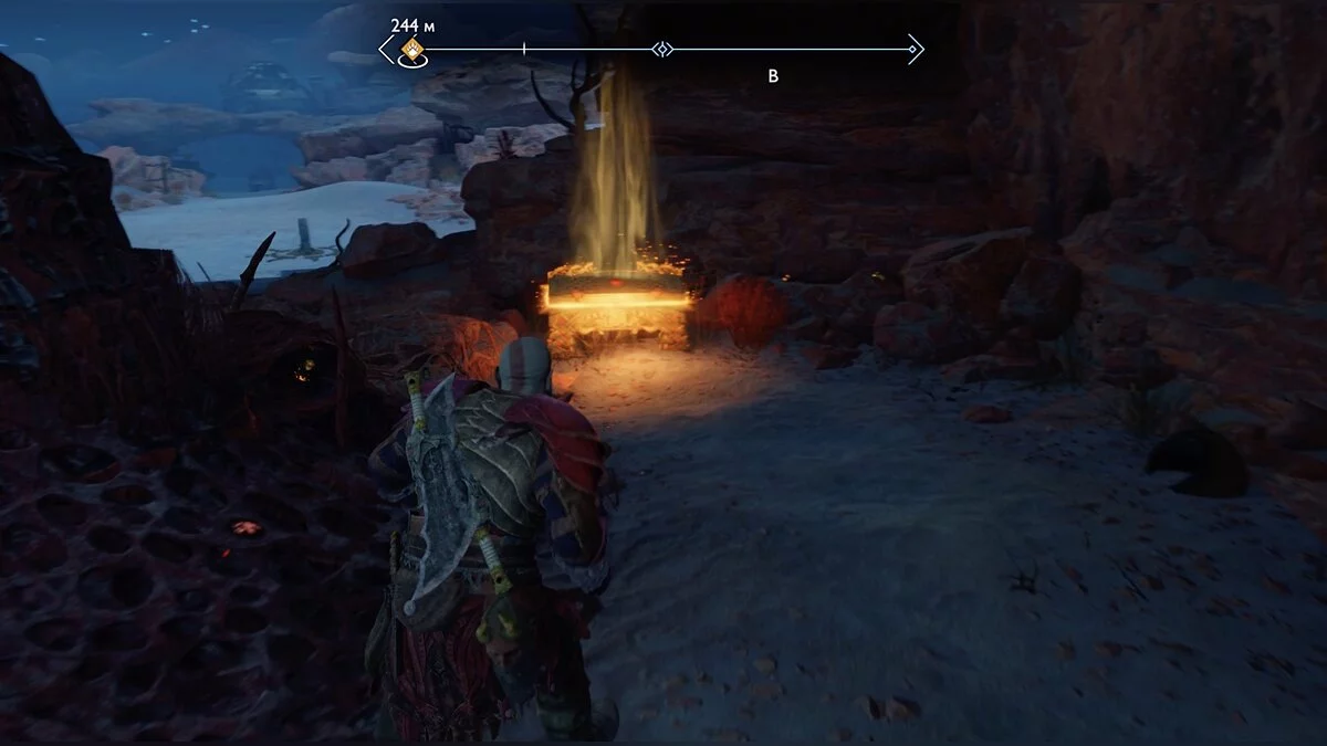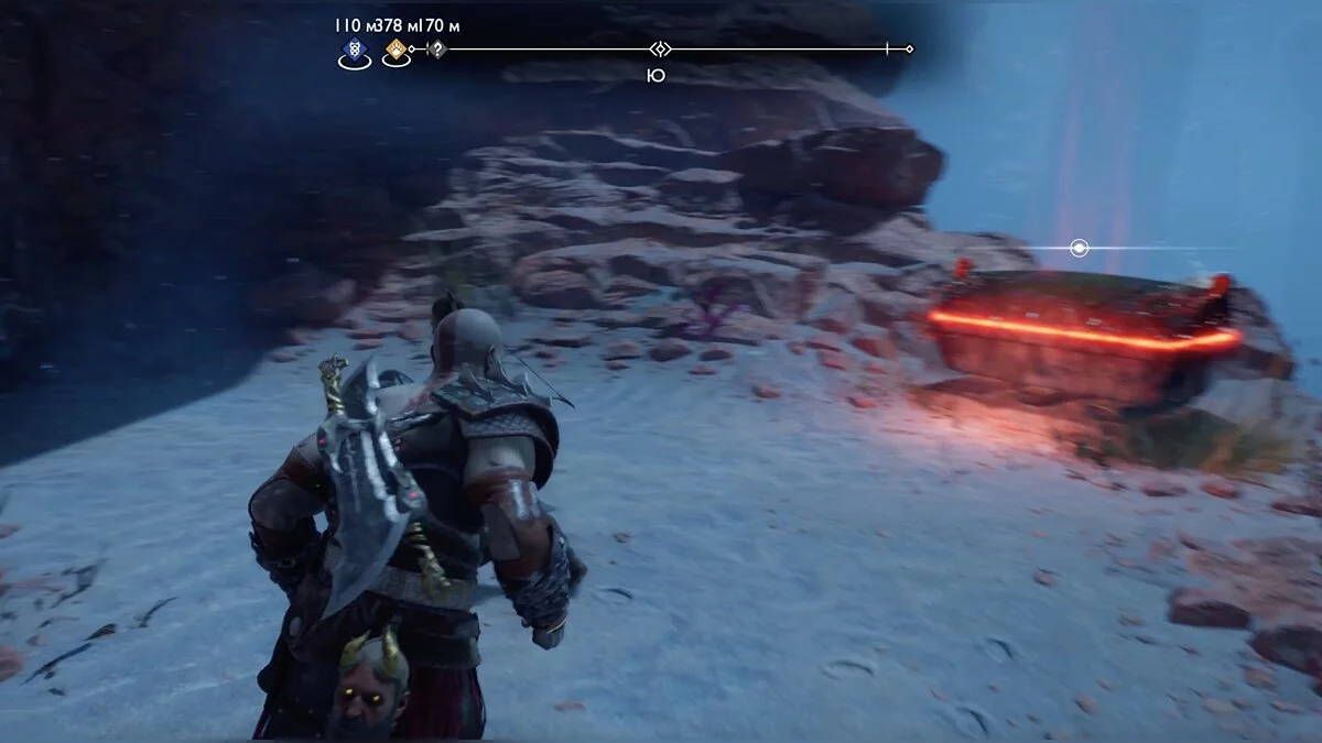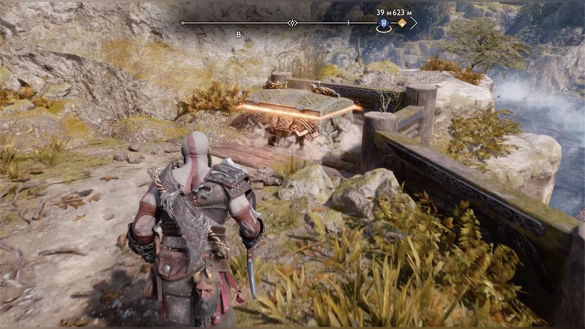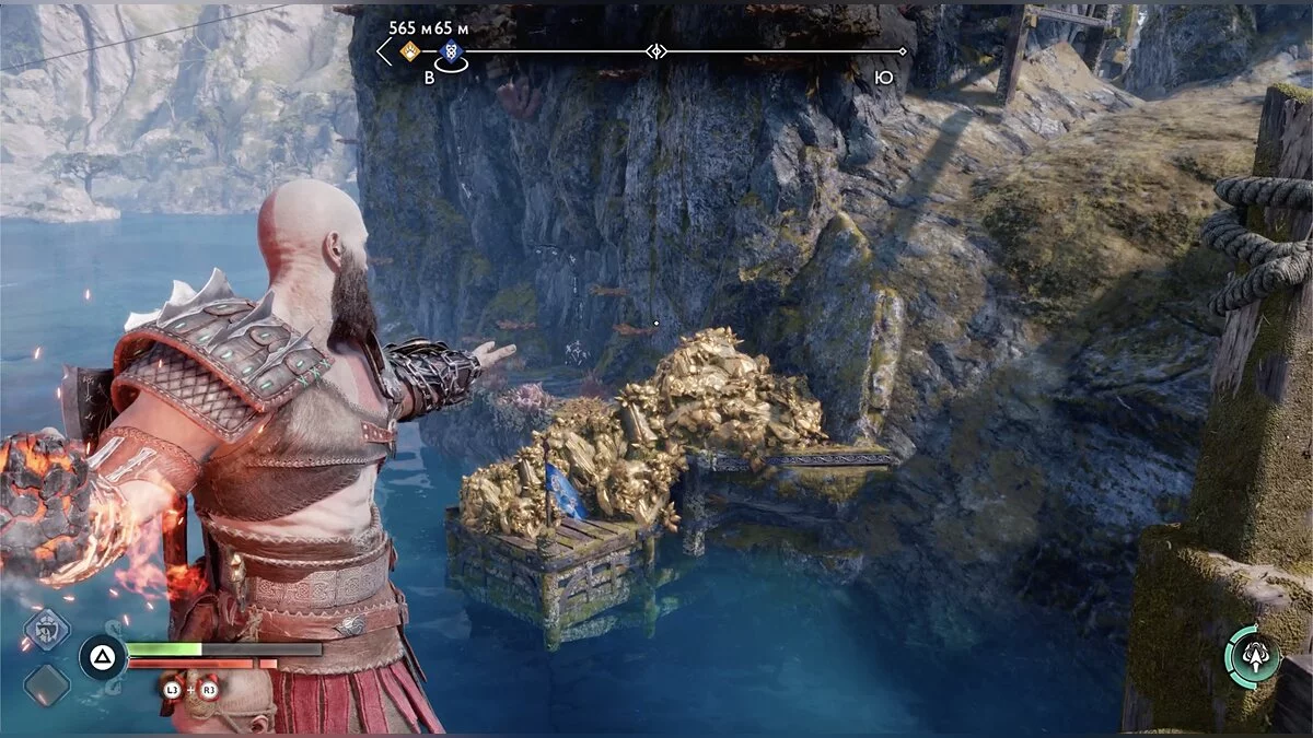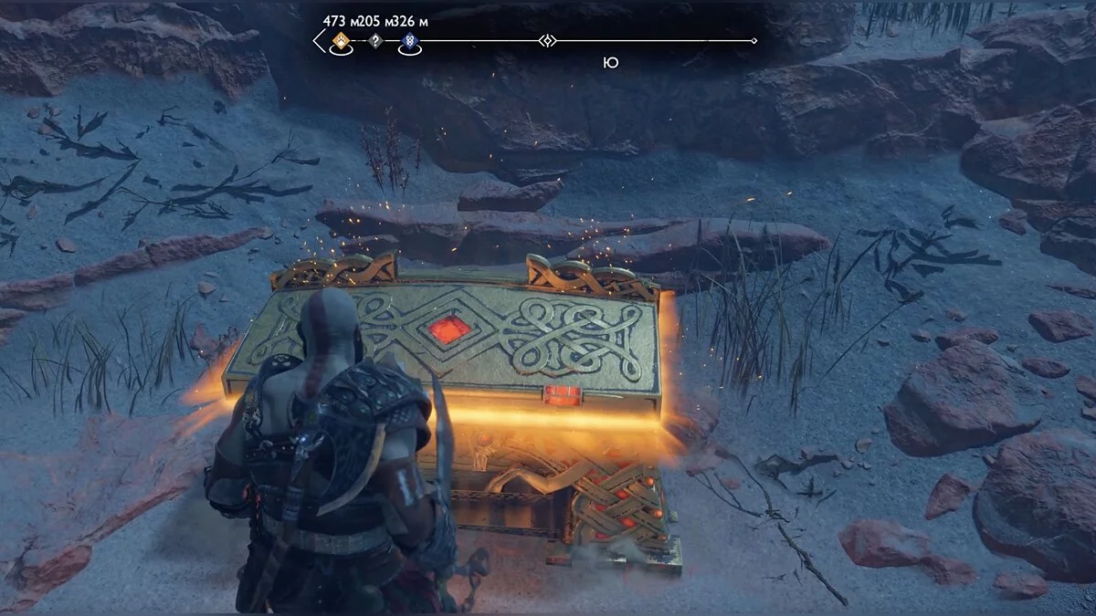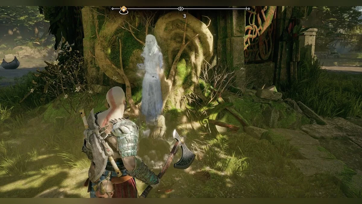 Когда вы будете искать молот Дурлина на берегу с драконьей статуей, то поднимитесь по деревянной конструкции, чтобы перепрыгнуть на большой мост. Кратос встретит призрака, который расскажет, что вместе с сыном искал сокровище, но в итоге они разделились. Вам нужно найти и сокровище, и сына.