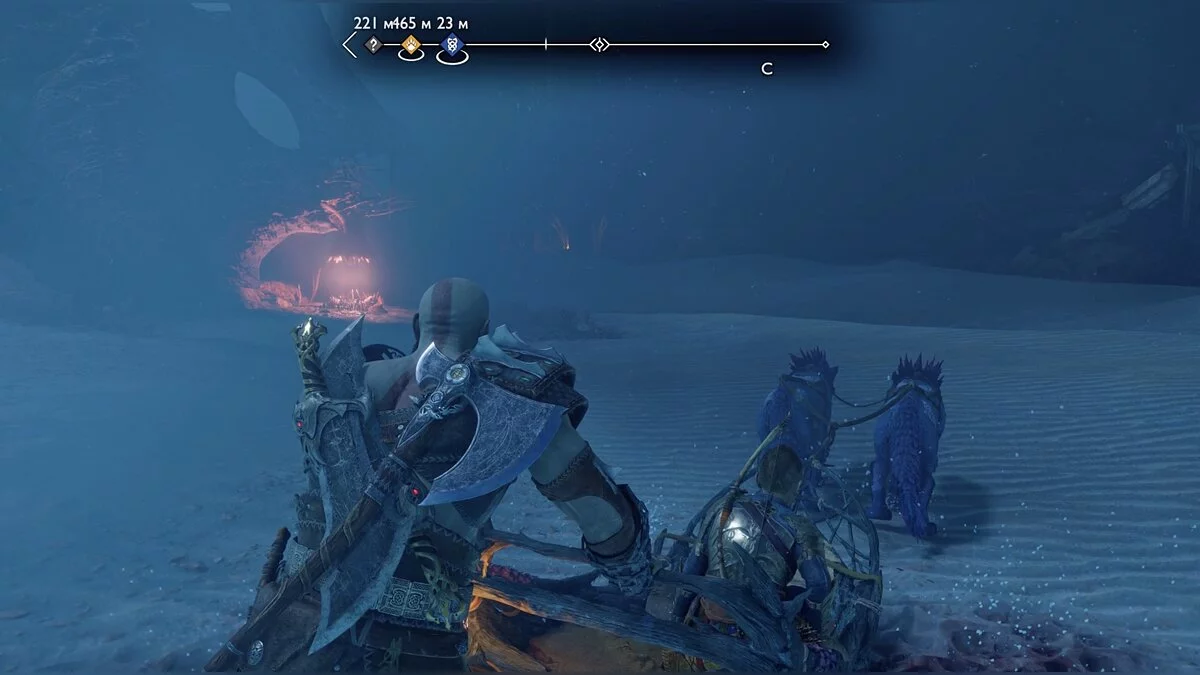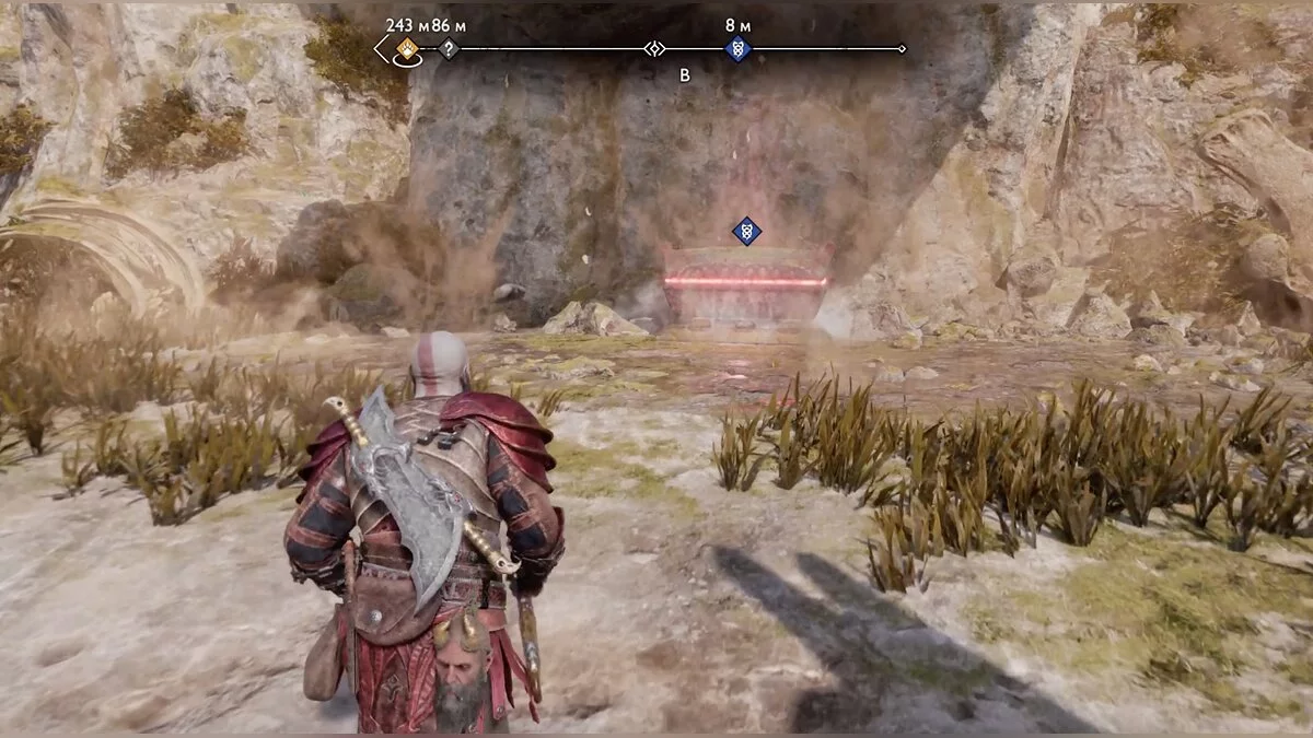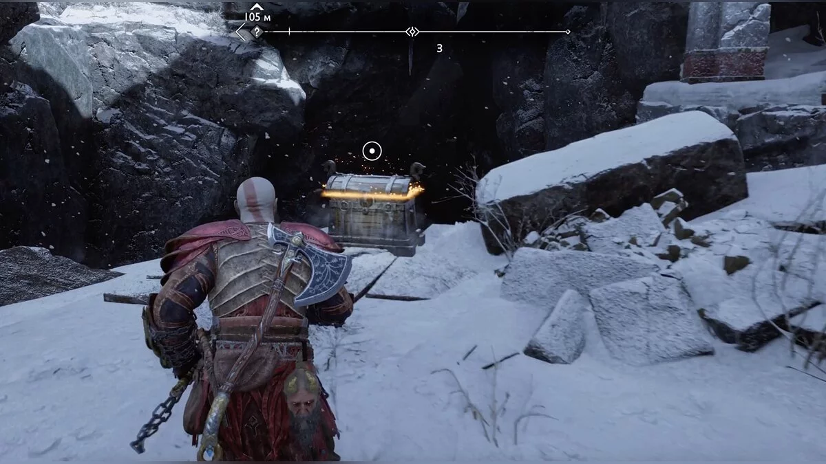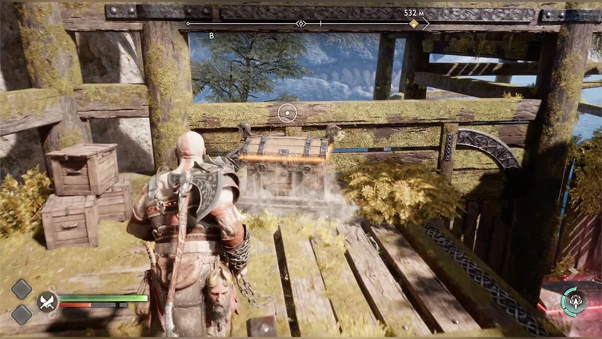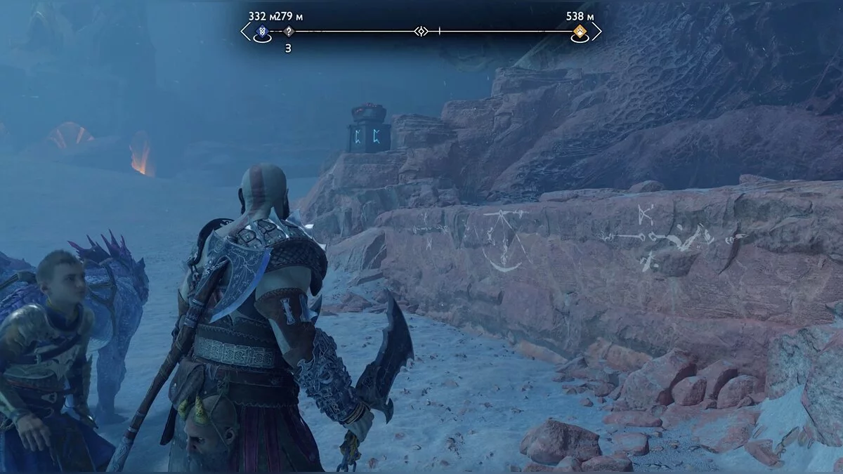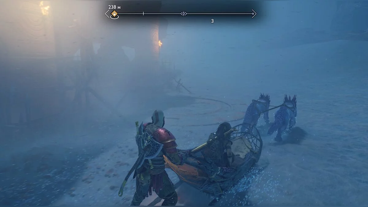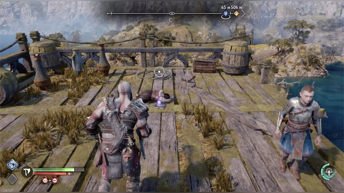 Когда вы будете искать молот Дурлина на берегу с драконьей статуей, то поднимитесь по деревянной конструкции, чтобы перепрыгнуть на большой мост. Кратос встретит призрака, который расскажет, что вместе с сыном искал сокровище, но в итоге они разделились. Вам нужно найти и сокровище, и сына.