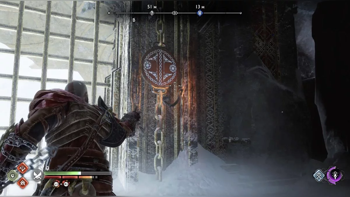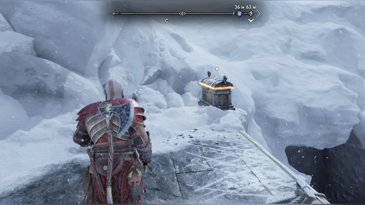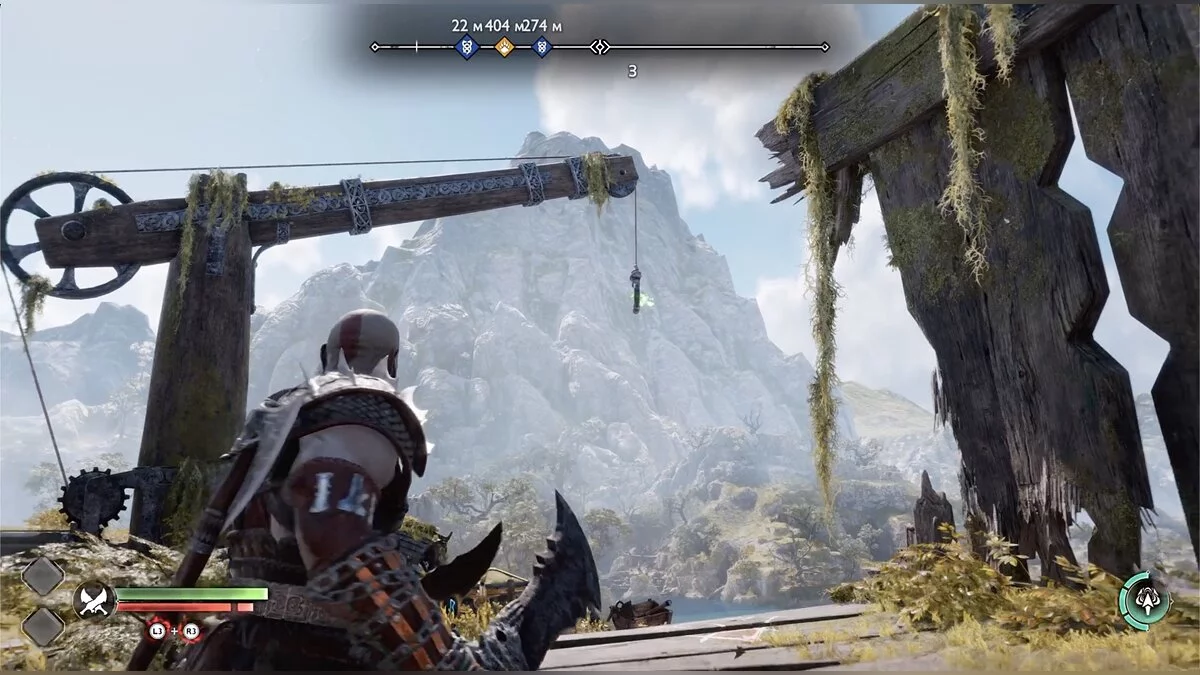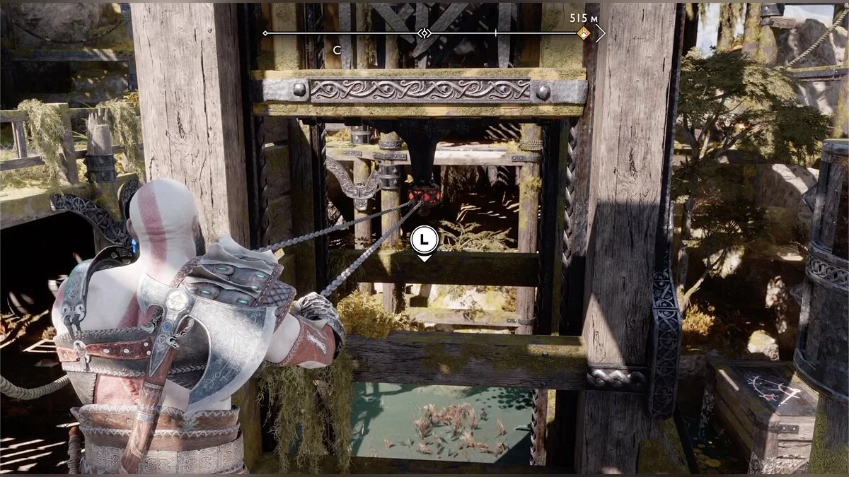 Плывите к третьей буровой машине. Поднимайтесь наверх по цепи, прямо перед вами ворон Одина. Подойдите к провалившемуся мосту и опустите клинками подъемник. Теперь взаимодействуйте с колесом так, чтобы место для сцепки с клинками было чуть выше Кратоса. Перепрыгните на другую сторону и взорвите красную бочку. Тут же откройте малый сундук.