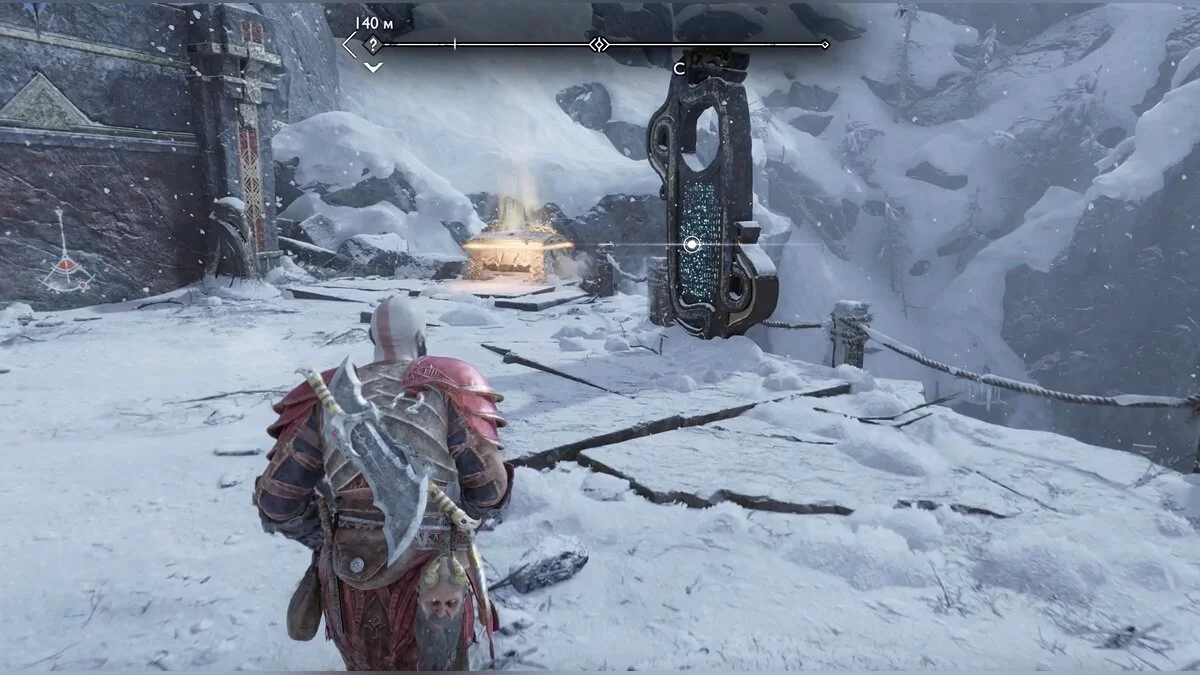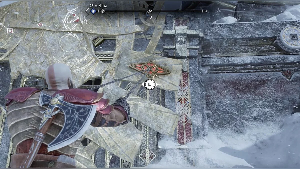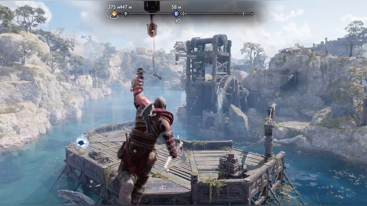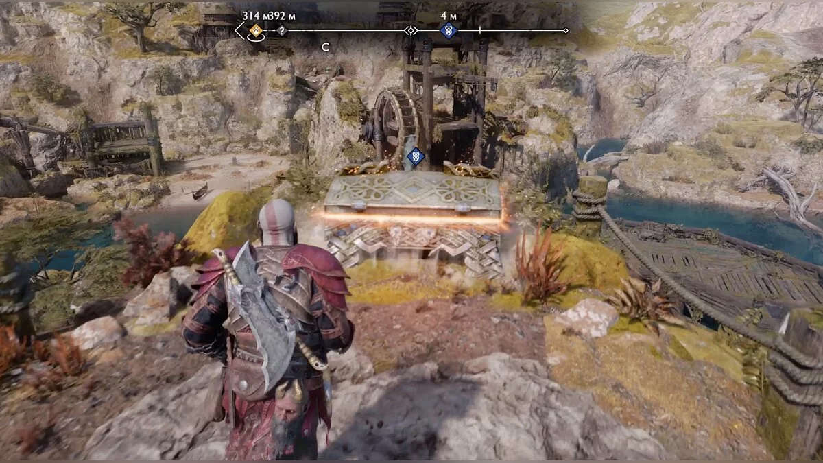 Плывите к третьей буровой машине. Поднимайтесь наверх по цепи, прямо перед вами ворон Одина. Подойдите к провалившемуся мосту и опустите клинками подъемник. Теперь взаимодействуйте с колесом так, чтобы место для сцепки с клинками было чуть выше Кратоса. Перепрыгните на другую сторону и взорвите красную бочку. Тут же откройте малый сундук.