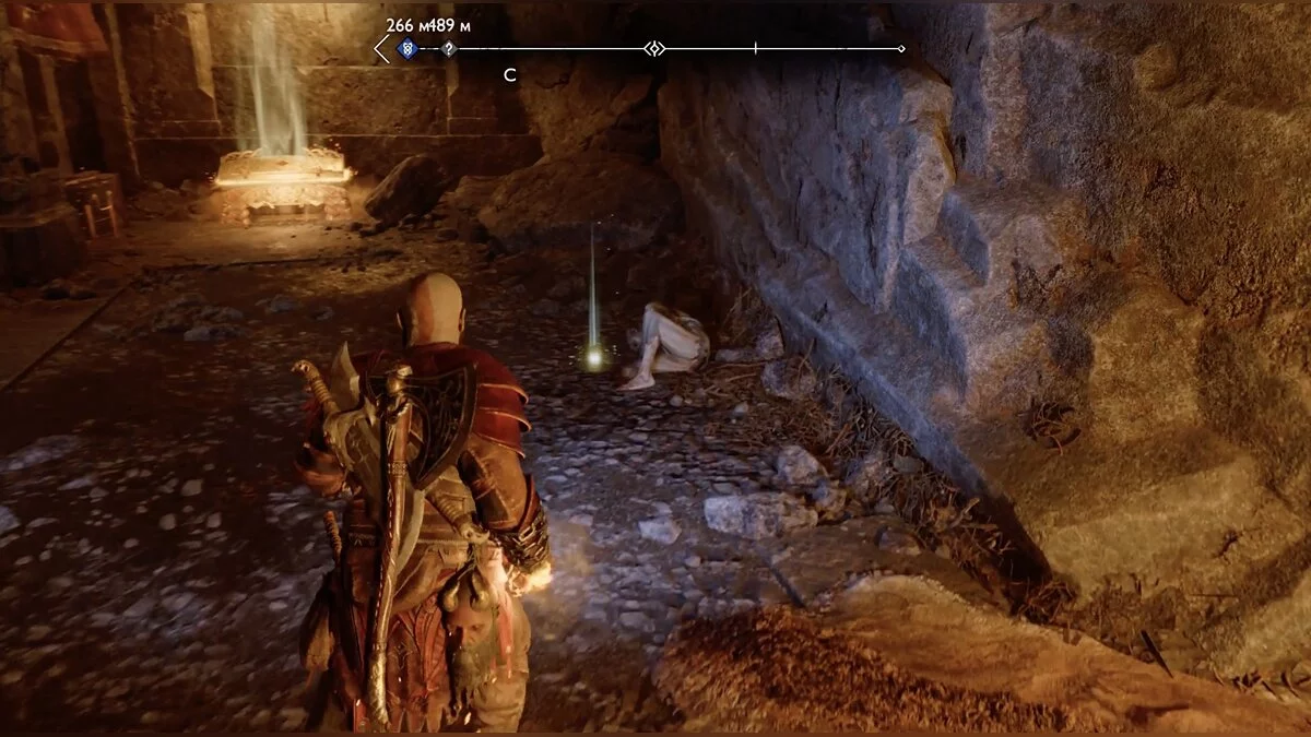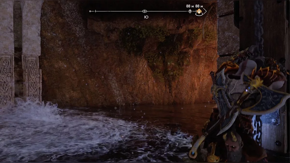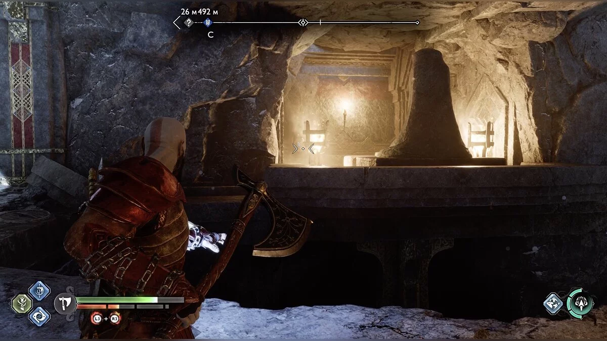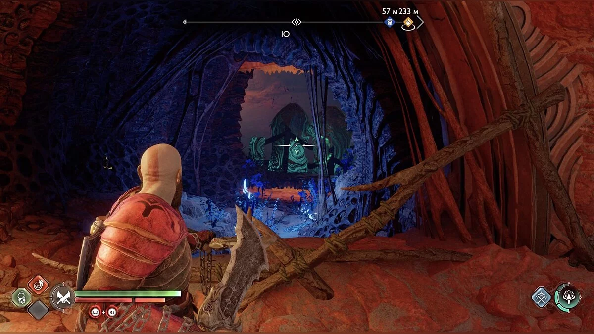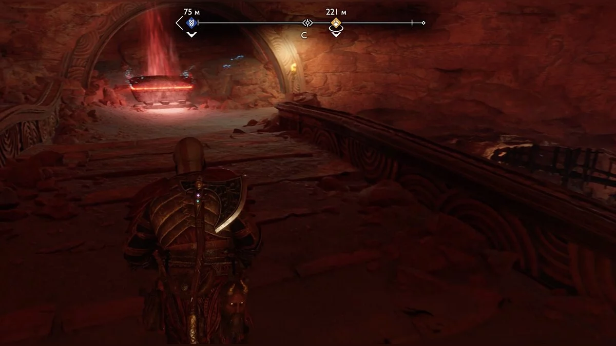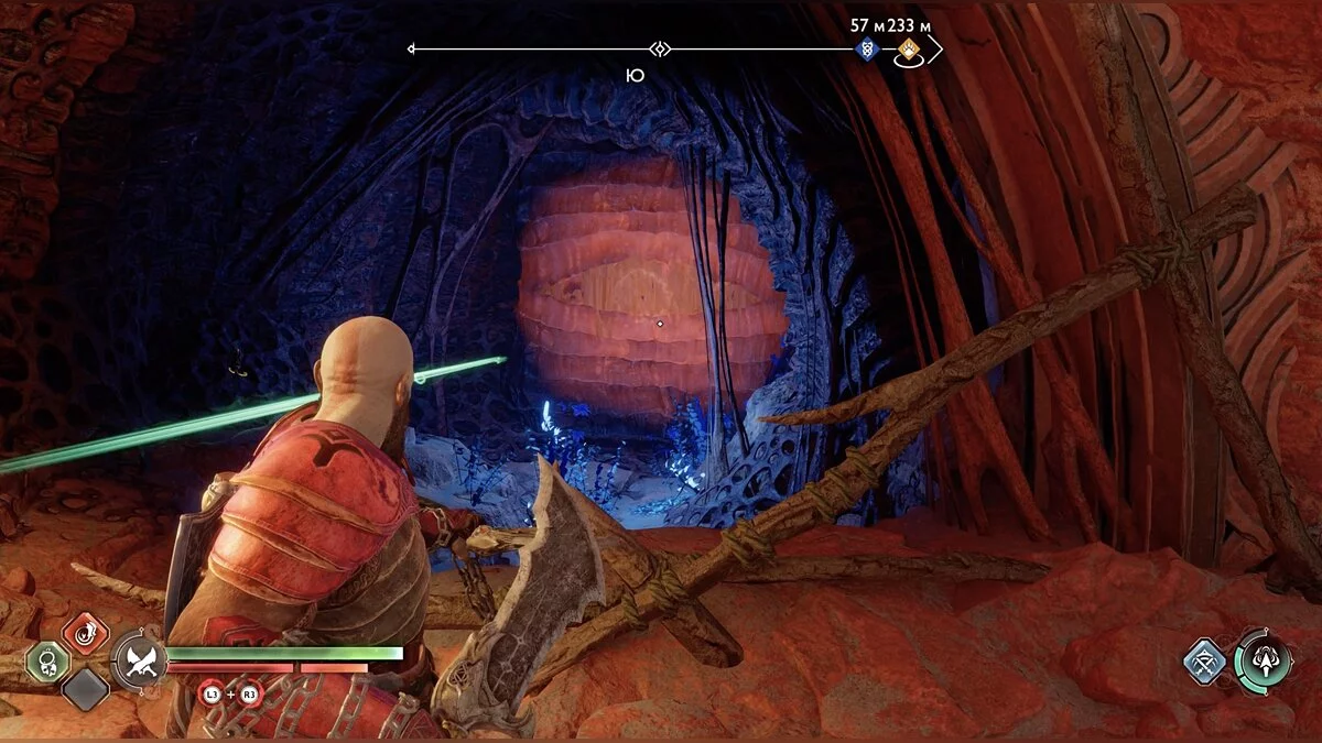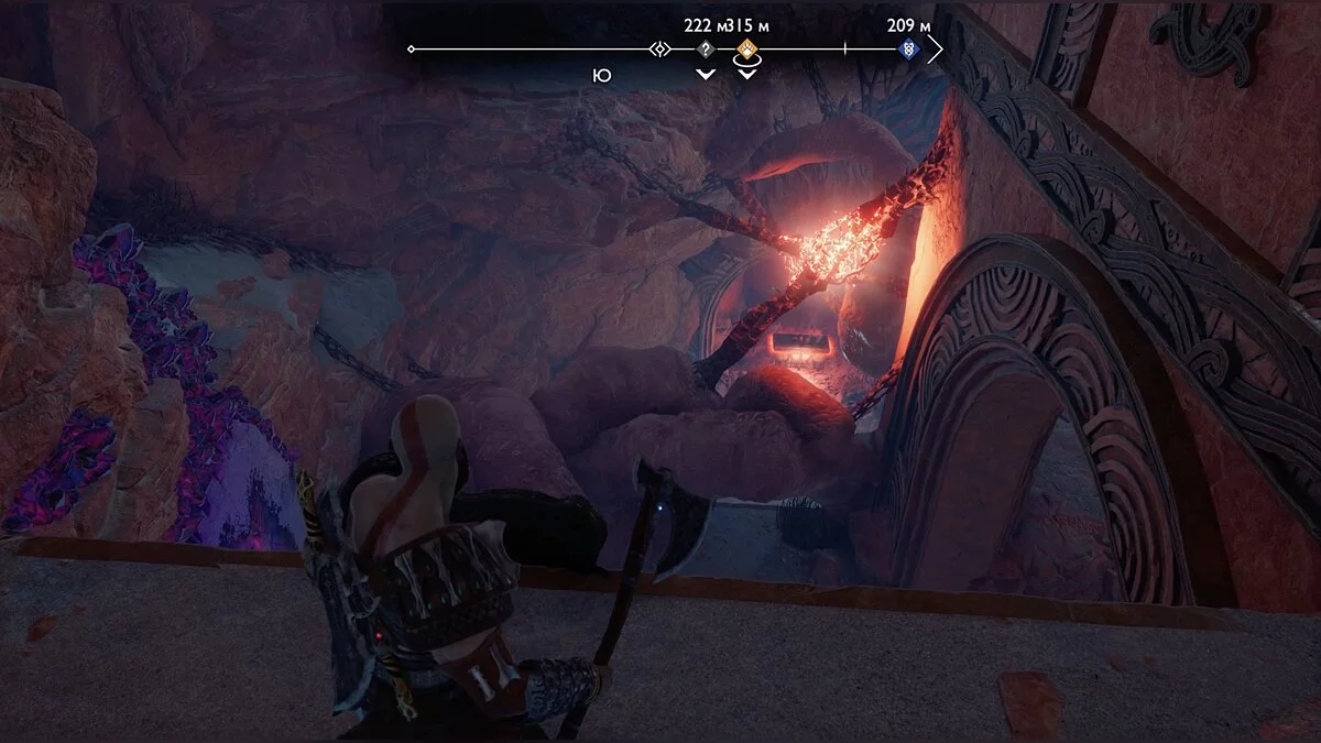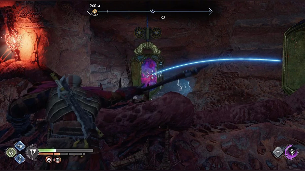 Путешествуя под землей, вы наткнетесь на укрепление для клинков Хаоса, которое обросло наростами. Разбейте их стрелами Атрея, чтобы получить доступ и перепрыгнуть на другую сторону. Основной путь ведет вас вперед, однако обратите внимание на левую сторону коридора. Первый поворот позволит открыть быстрый переход в место, где вы уже были — он нам не нужен. Во втором повороте можно перепрыгнуть небольшой водопад и спуститься вниз. Там Кратос найдет артефакт, а также ворота, которые можно открыть.