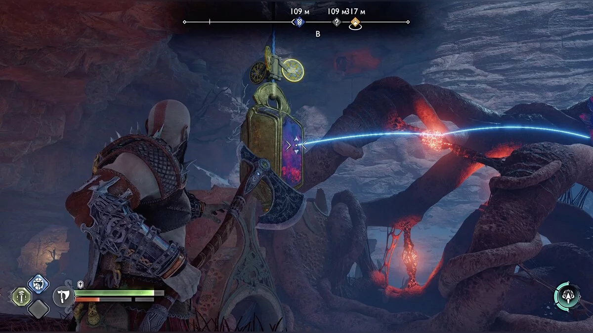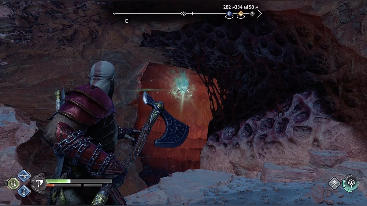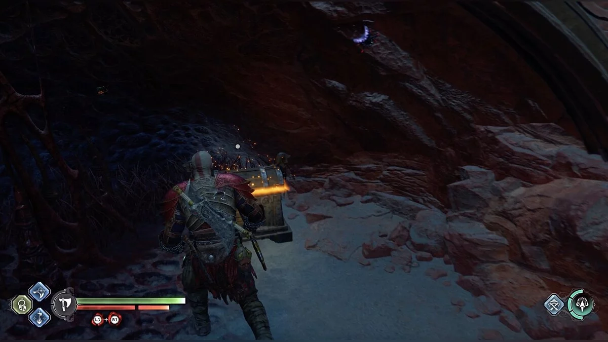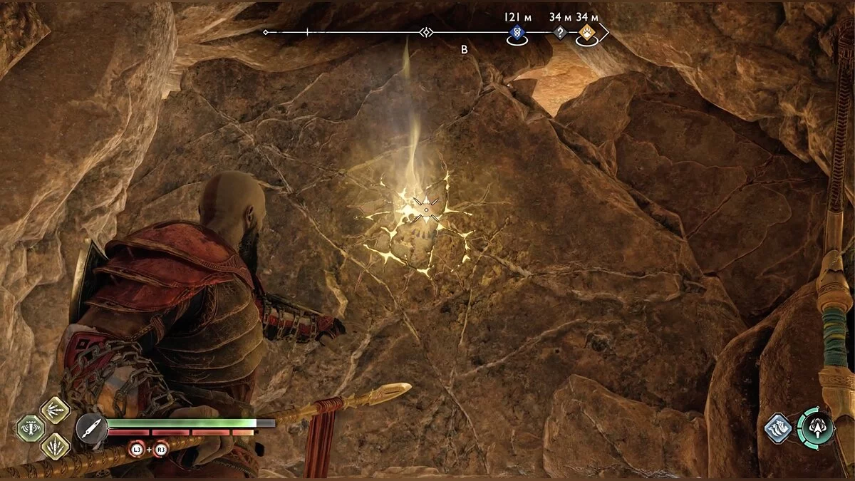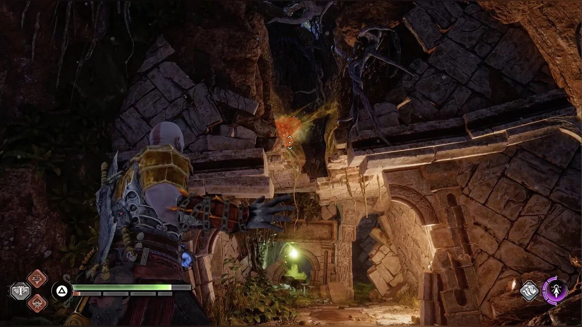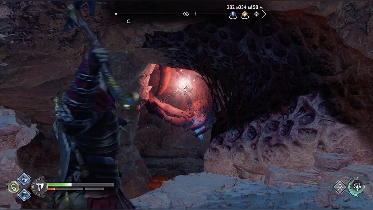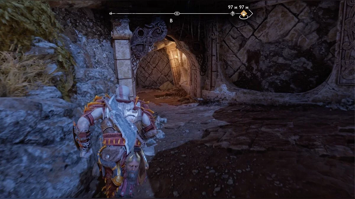 Путешествуя под землей, вы наткнетесь на укрепление для клинков Хаоса, которое обросло наростами. Разбейте их стрелами Атрея, чтобы получить доступ и перепрыгнуть на другую сторону. Основной путь ведет вас вперед, однако обратите внимание на левую сторону коридора. Первый поворот позволит открыть быстрый переход в место, где вы уже были — он нам не нужен. Во втором повороте можно перепрыгнуть небольшой водопад и спуститься вниз. Там Кратос найдет артефакт, а также ворота, которые можно открыть.