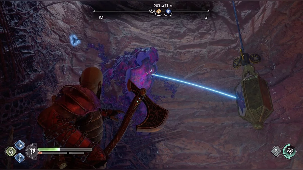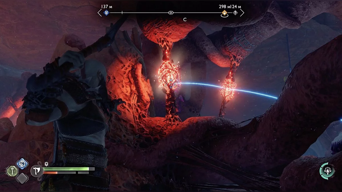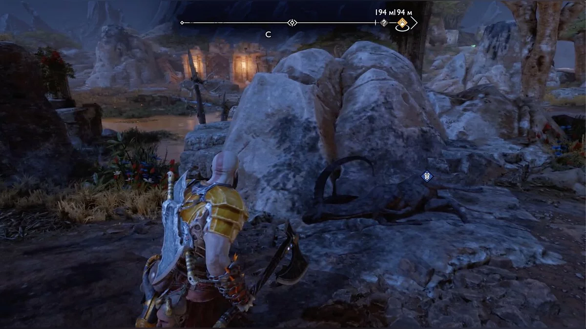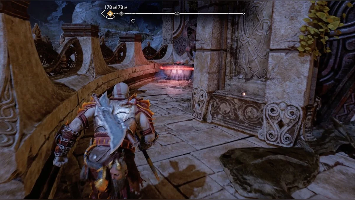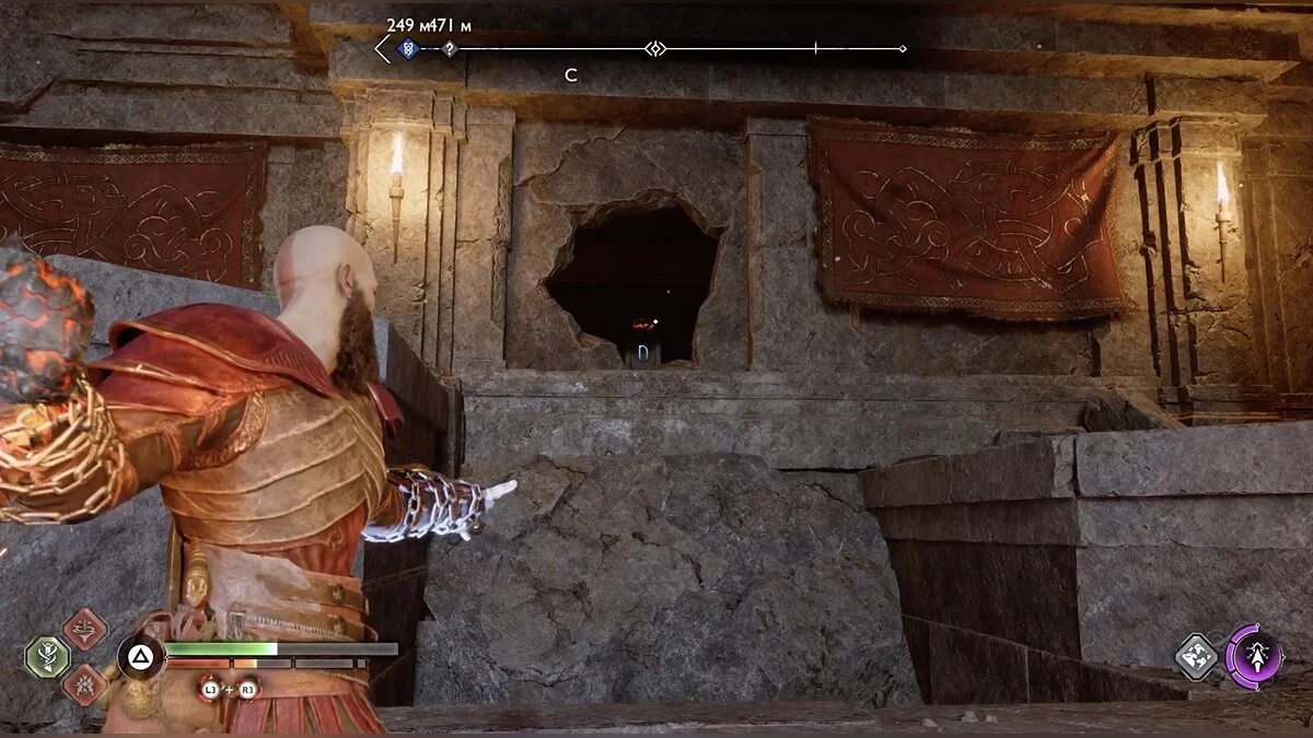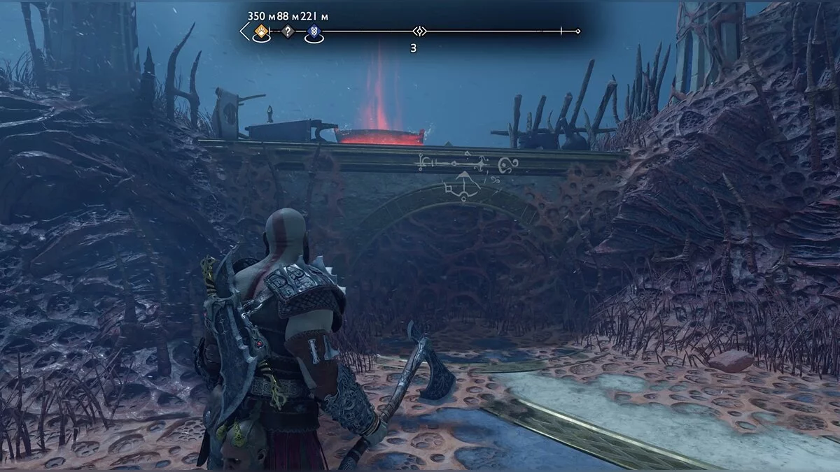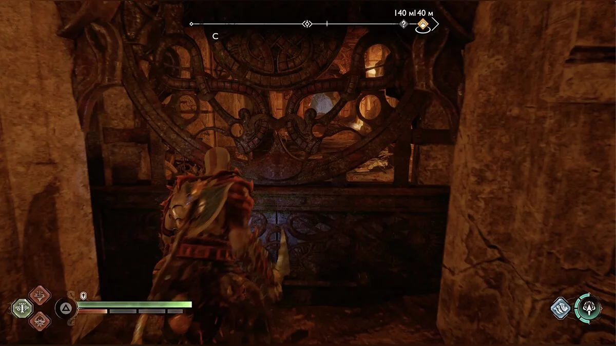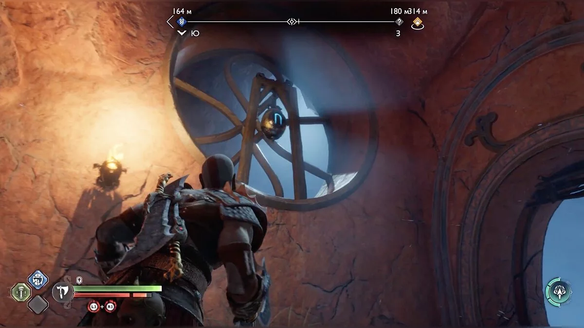 Путешествуя под землей, вы наткнетесь на укрепление для клинков Хаоса, которое обросло наростами. Разбейте их стрелами Атрея, чтобы получить доступ и перепрыгнуть на другую сторону. Основной путь ведет вас вперед, однако обратите внимание на левую сторону коридора. Первый поворот позволит открыть быстрый переход в место, где вы уже были — он нам не нужен. Во втором повороте можно перепрыгнуть небольшой водопад и спуститься вниз. Там Кратос найдет артефакт, а также ворота, которые можно открыть.