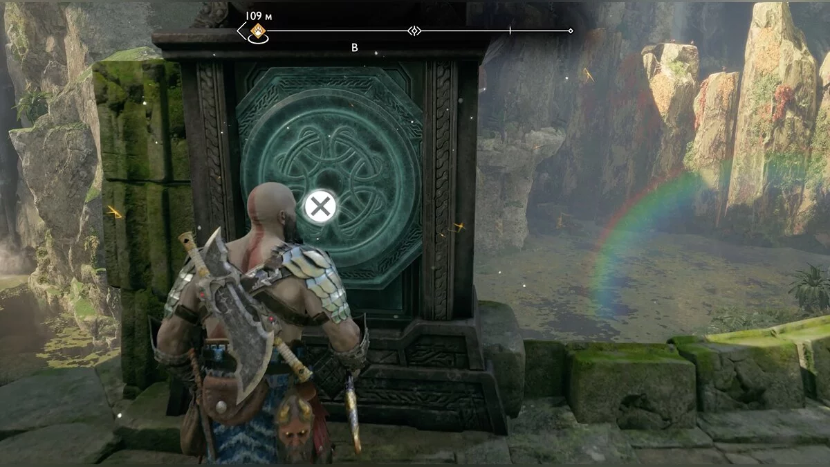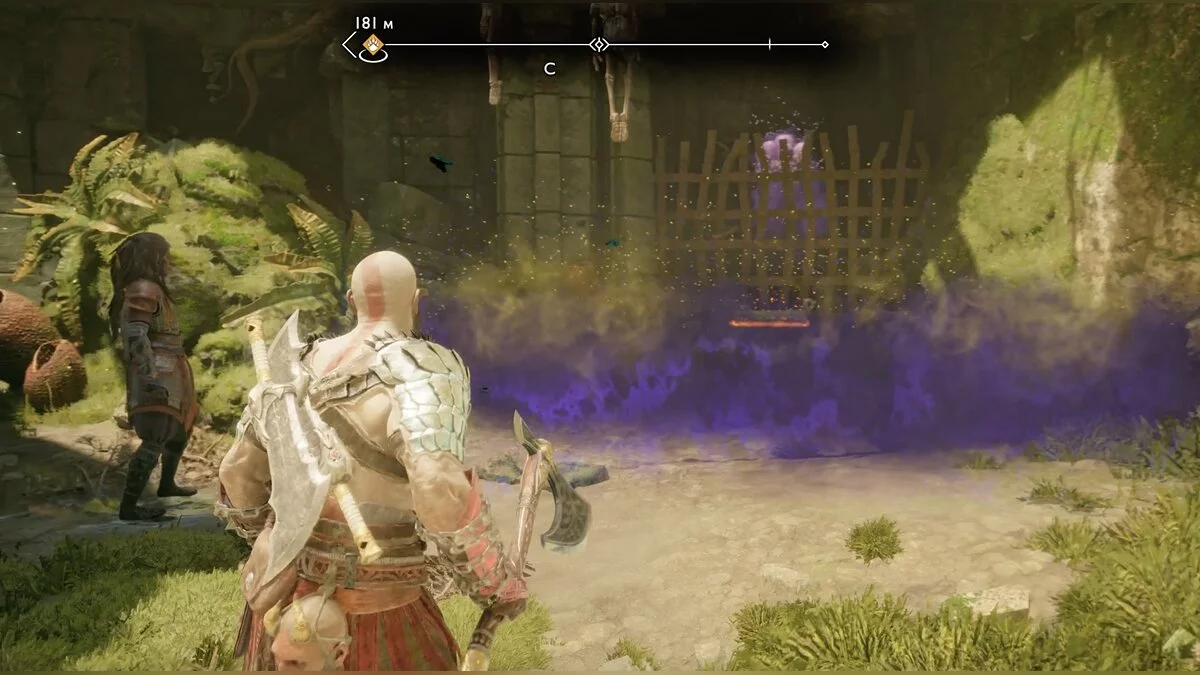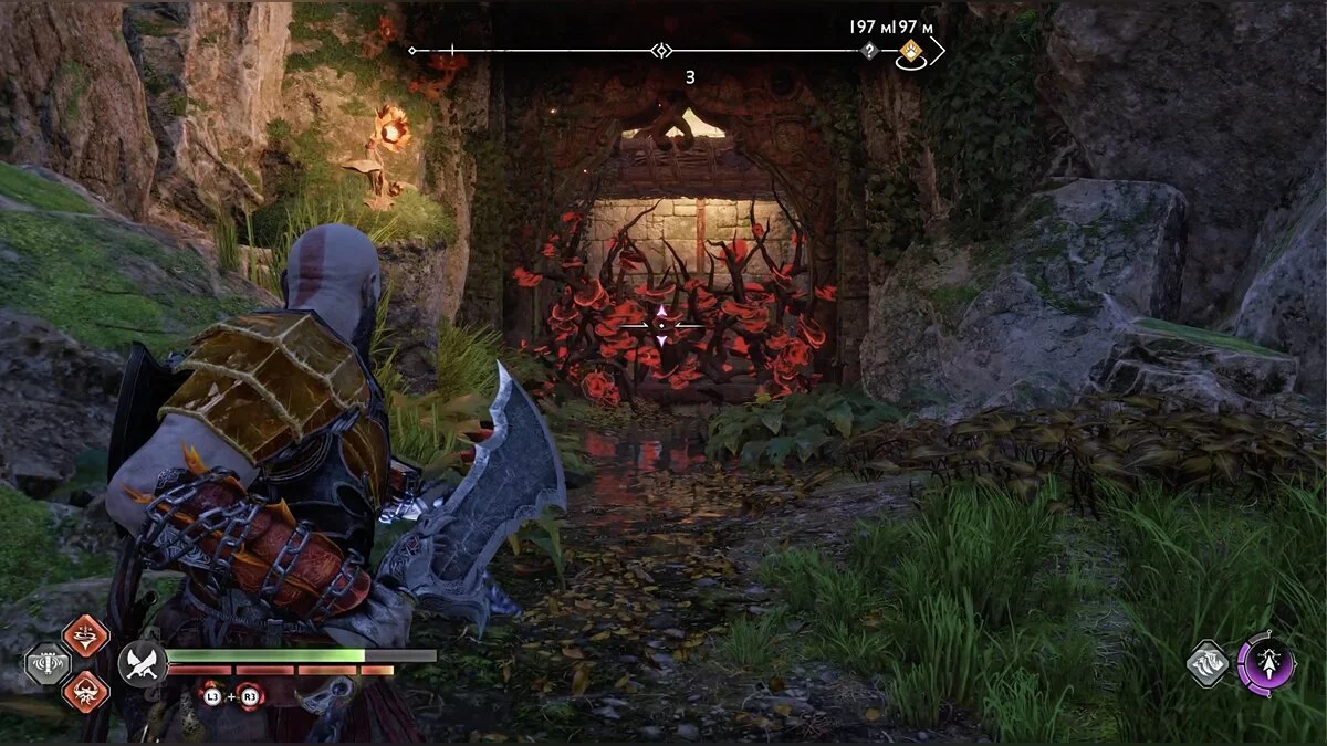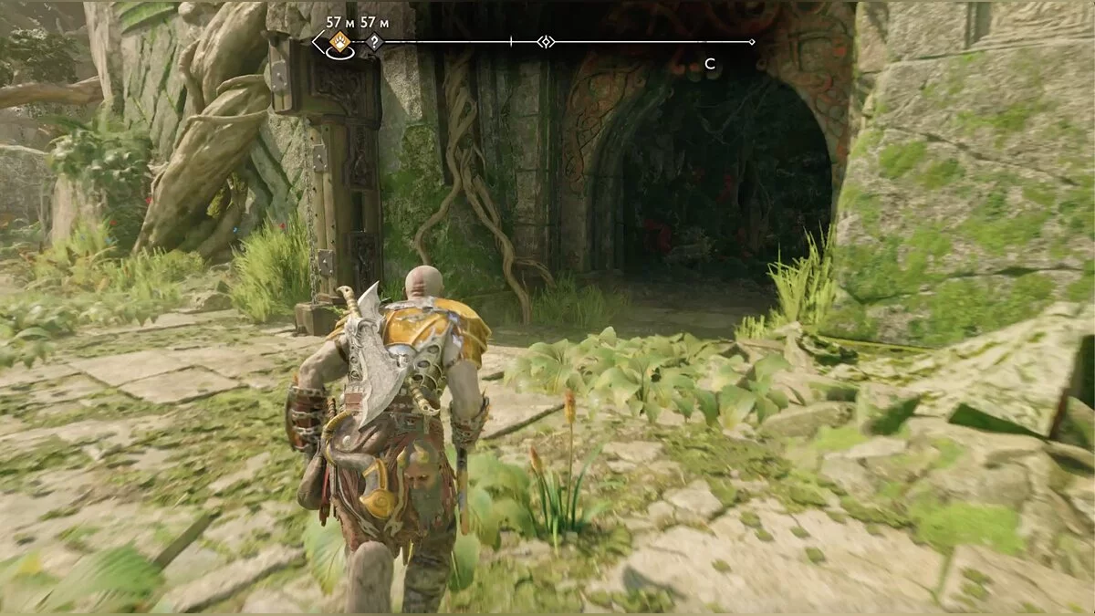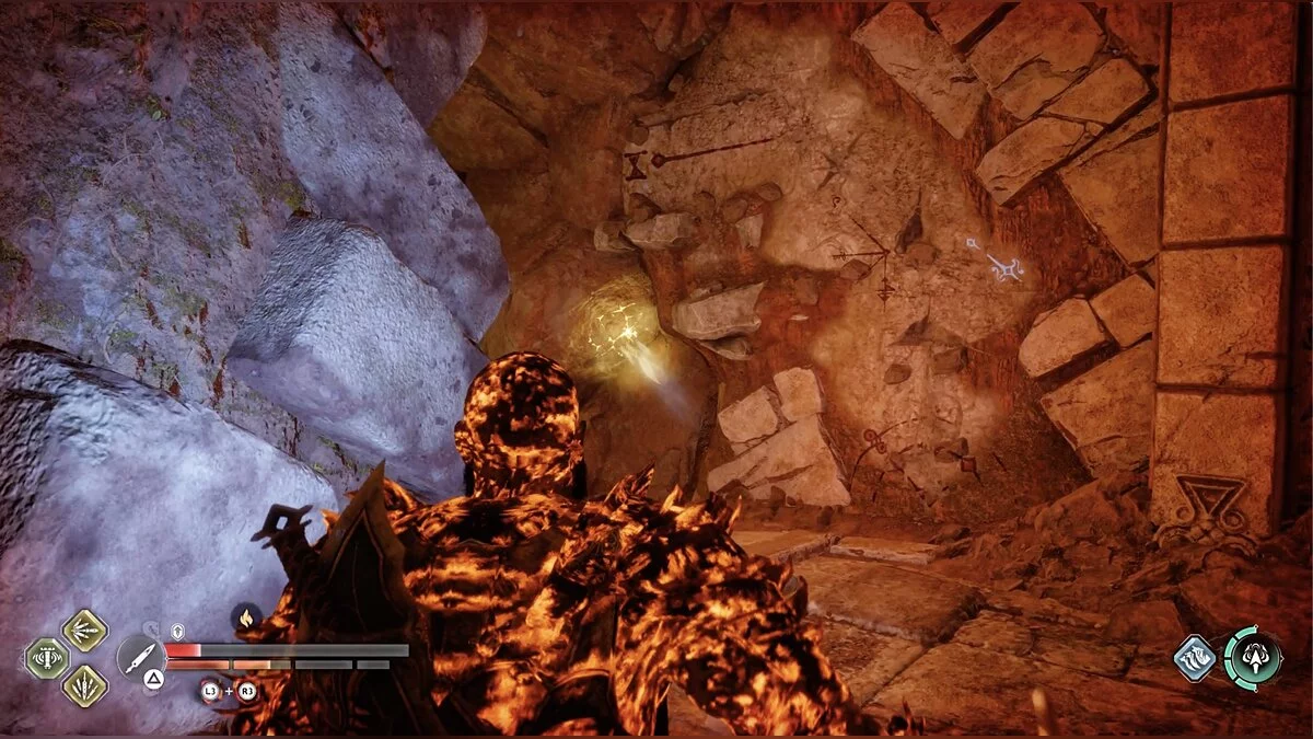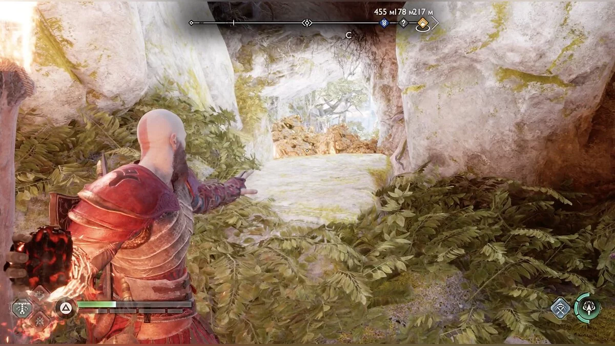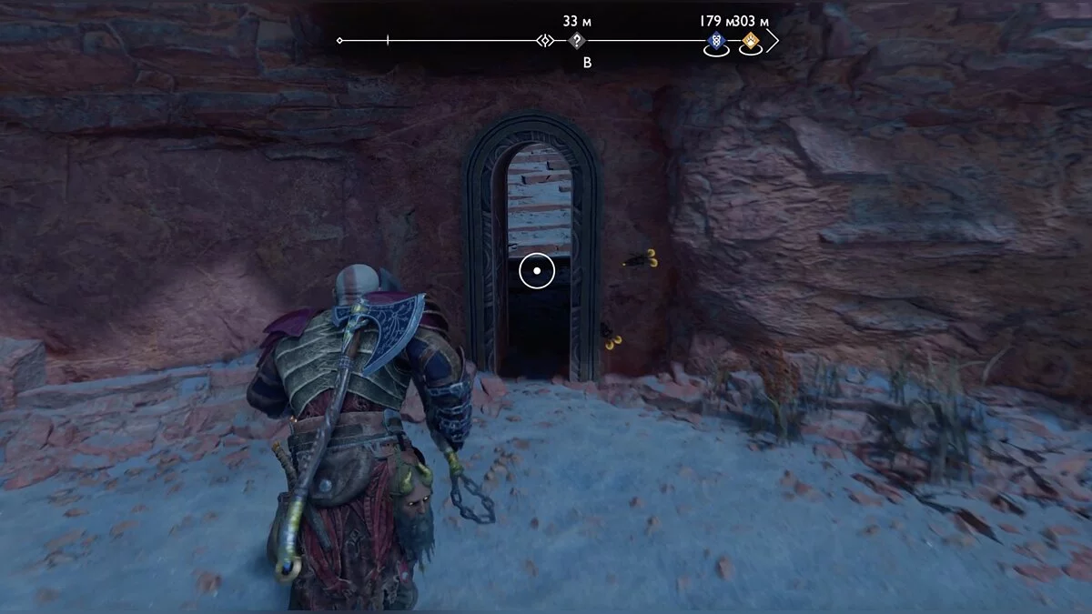 Путешествуя под землей, вы наткнетесь на укрепление для клинков Хаоса, которое обросло наростами. Разбейте их стрелами Атрея, чтобы получить доступ и перепрыгнуть на другую сторону. Основной путь ведет вас вперед, однако обратите внимание на левую сторону коридора. Первый поворот позволит открыть быстрый переход в место, где вы уже были — он нам не нужен. Во втором повороте можно перепрыгнуть небольшой водопад и спуститься вниз. Там Кратос найдет артефакт, а также ворота, которые можно открыть.