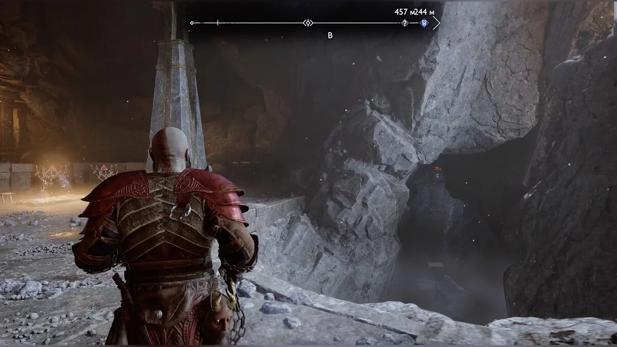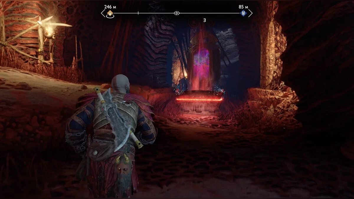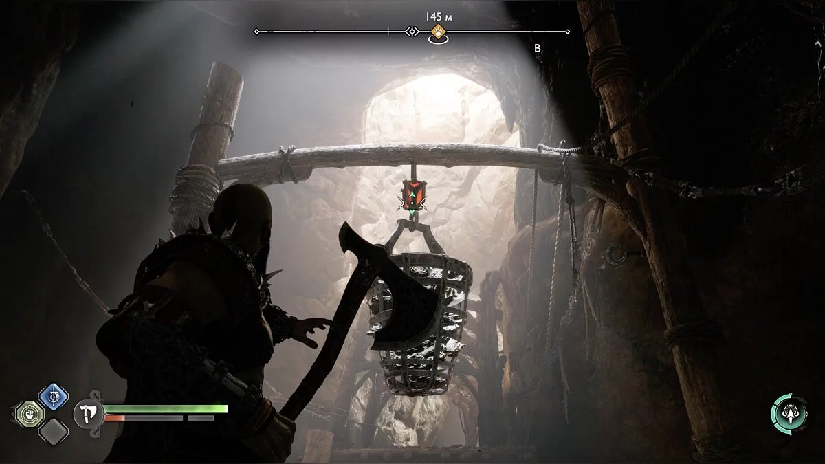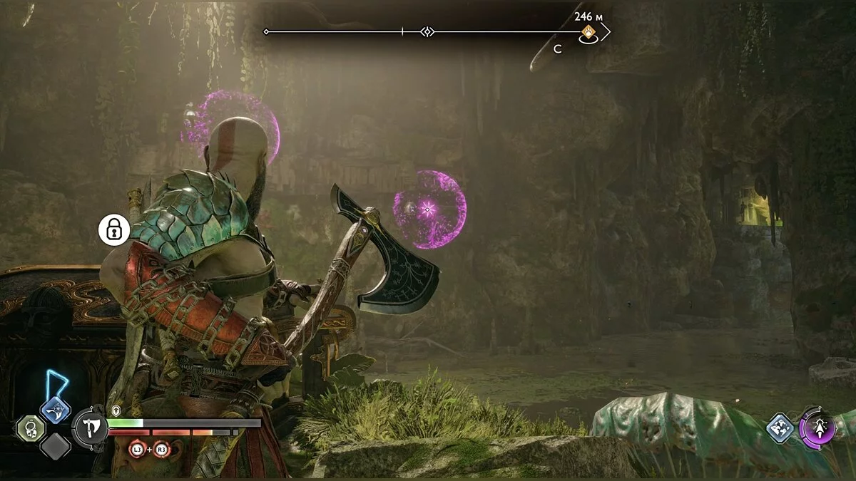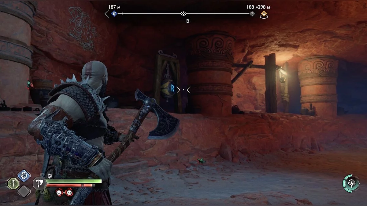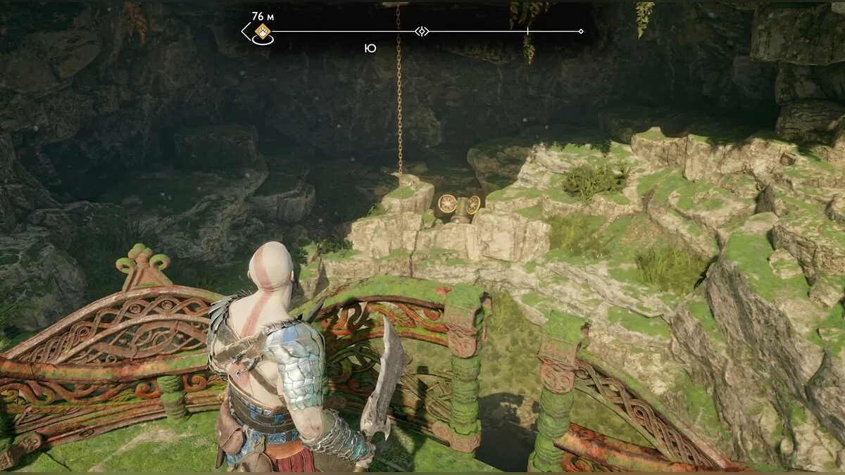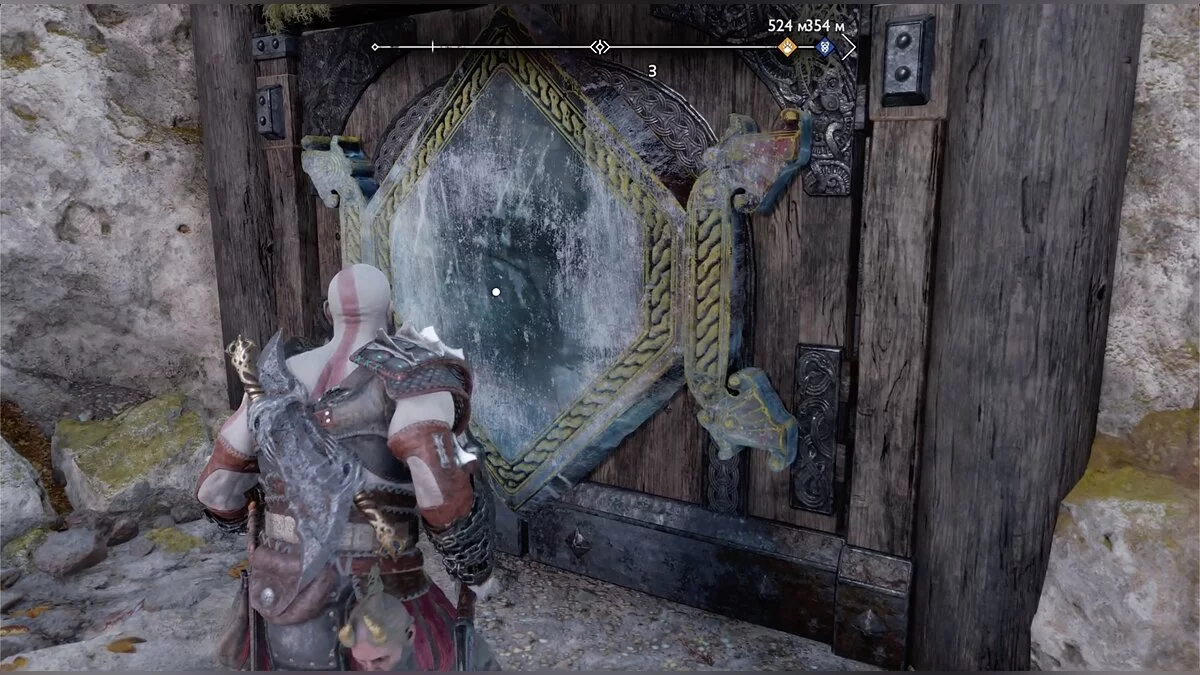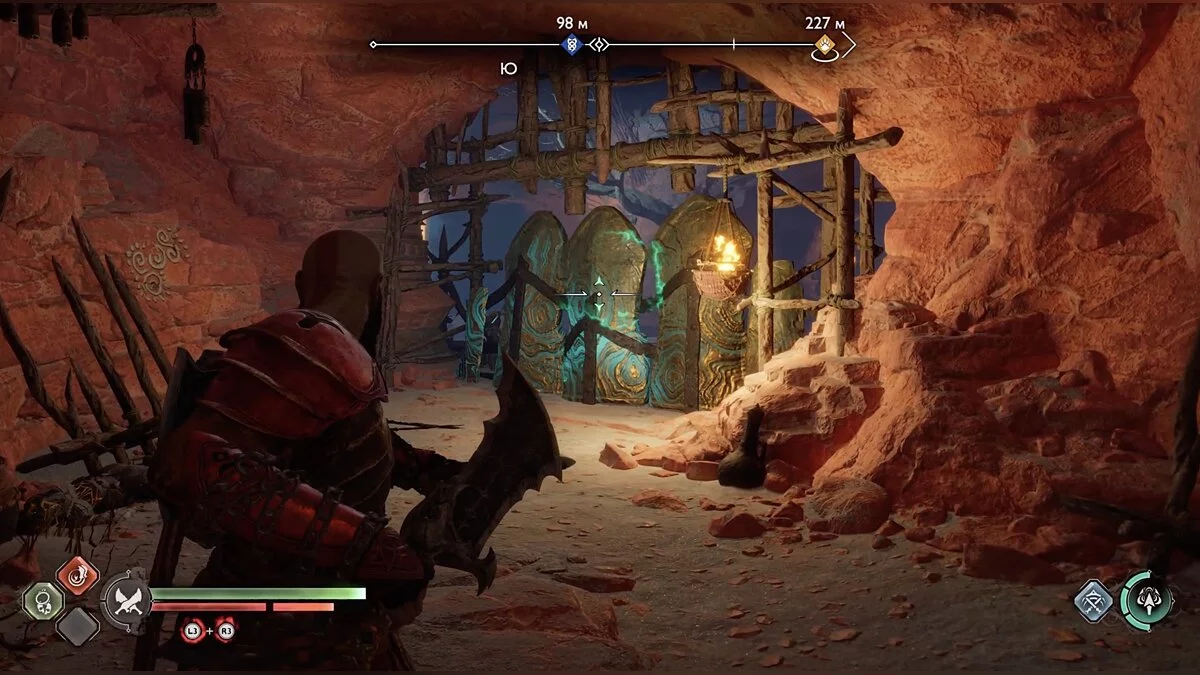 Путешествуя под землей, вы наткнетесь на укрепление для клинков Хаоса, которое обросло наростами. Разбейте их стрелами Атрея, чтобы получить доступ и перепрыгнуть на другую сторону. Основной путь ведет вас вперед, однако обратите внимание на левую сторону коридора. Первый поворот позволит открыть быстрый переход в место, где вы уже были — он нам не нужен. Во втором повороте можно перепрыгнуть небольшой водопад и спуститься вниз. Там Кратос найдет артефакт, а также ворота, которые можно открыть.