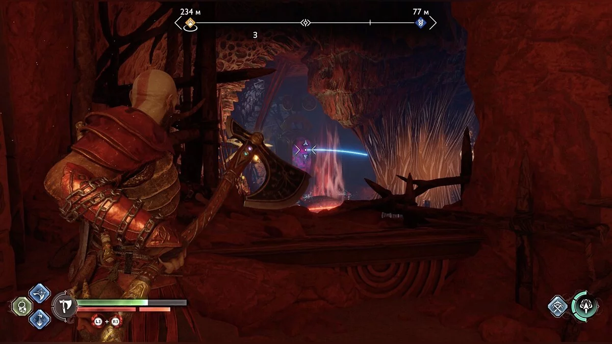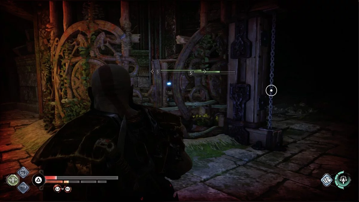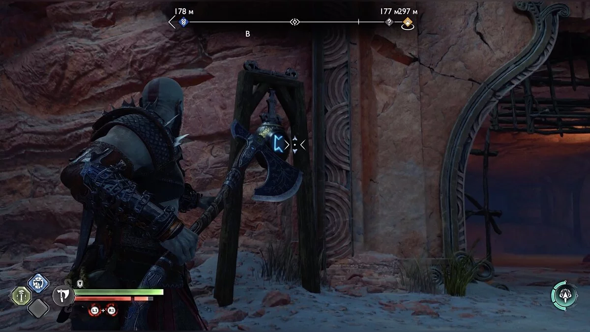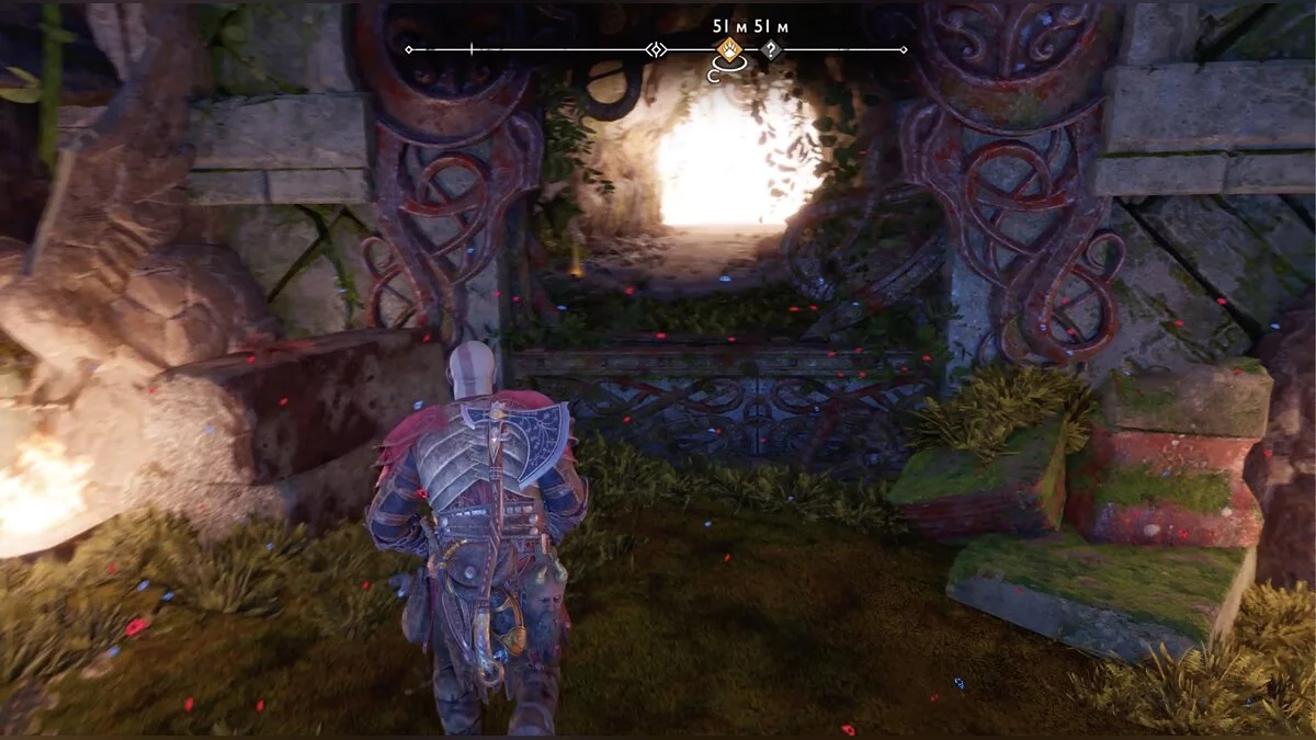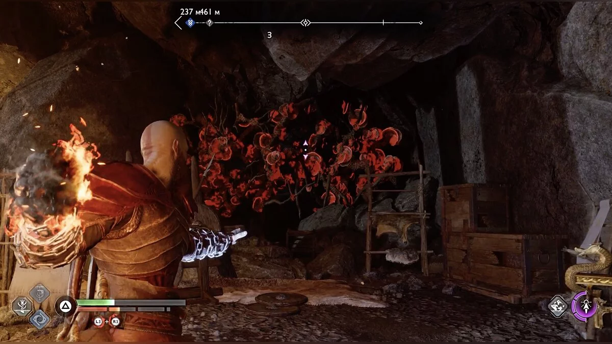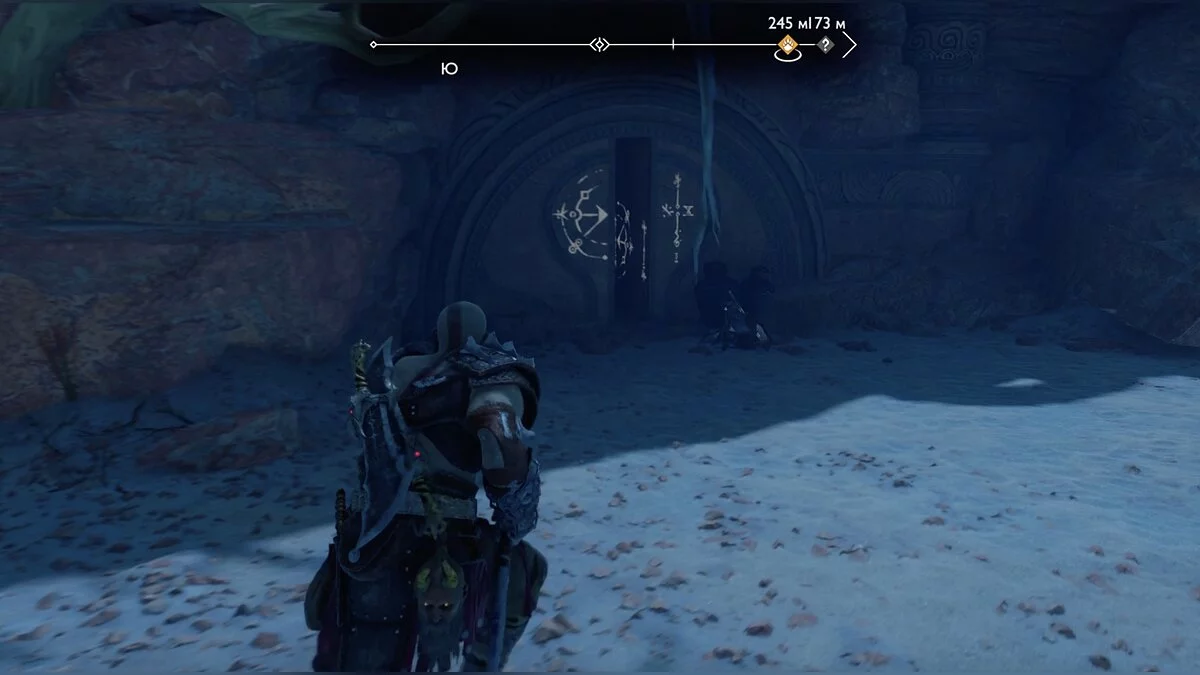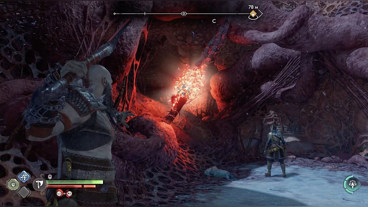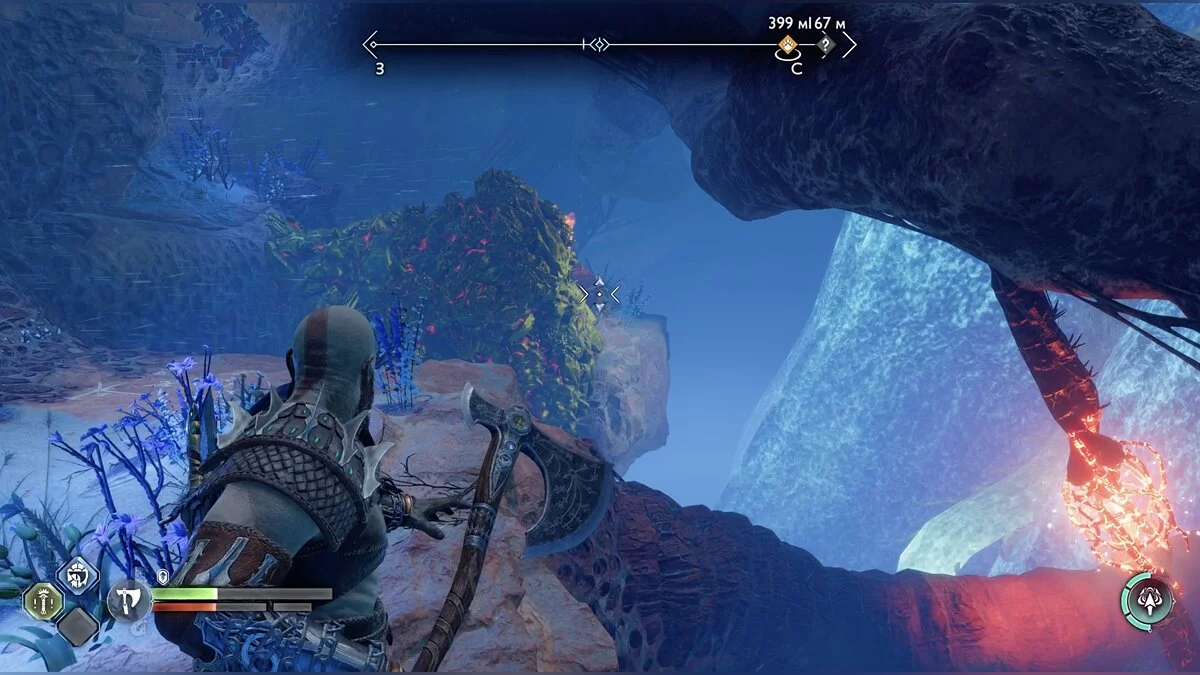 Путешествуя под землей, вы наткнетесь на укрепление для клинков Хаоса, которое обросло наростами. Разбейте их стрелами Атрея, чтобы получить доступ и перепрыгнуть на другую сторону. Основной путь ведет вас вперед, однако обратите внимание на левую сторону коридора. Первый поворот позволит открыть быстрый переход в место, где вы уже были — он нам не нужен. Во втором повороте можно перепрыгнуть небольшой водопад и спуститься вниз. Там Кратос найдет артефакт, а также ворота, которые можно открыть.