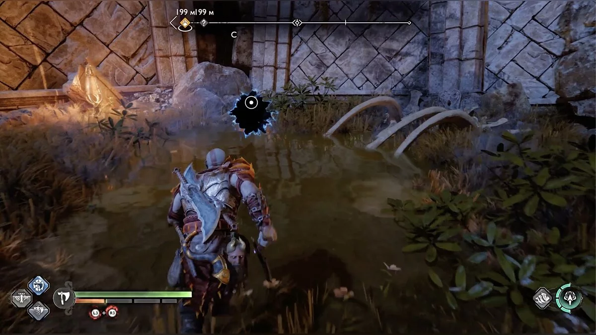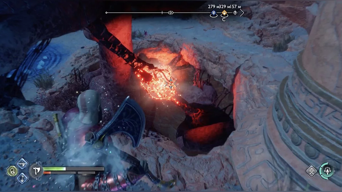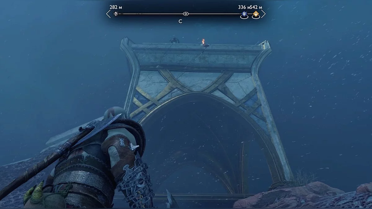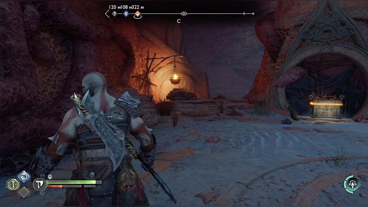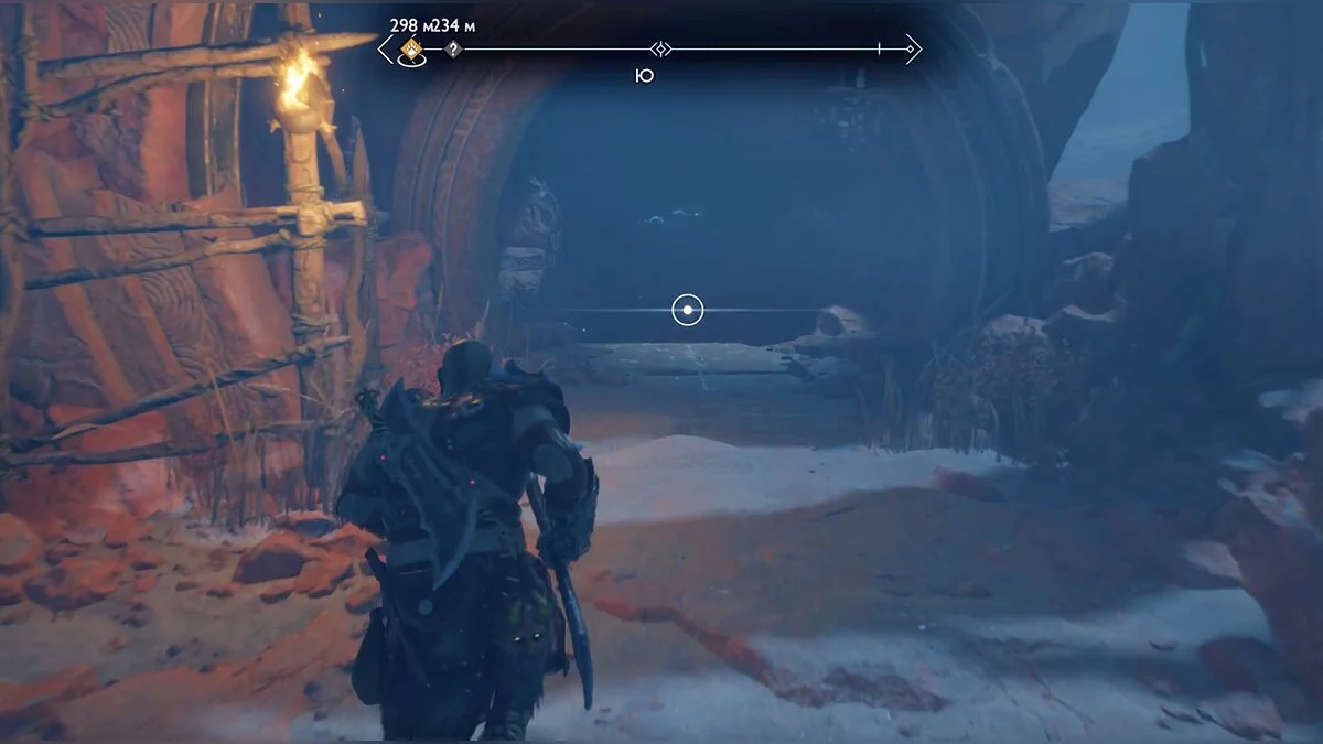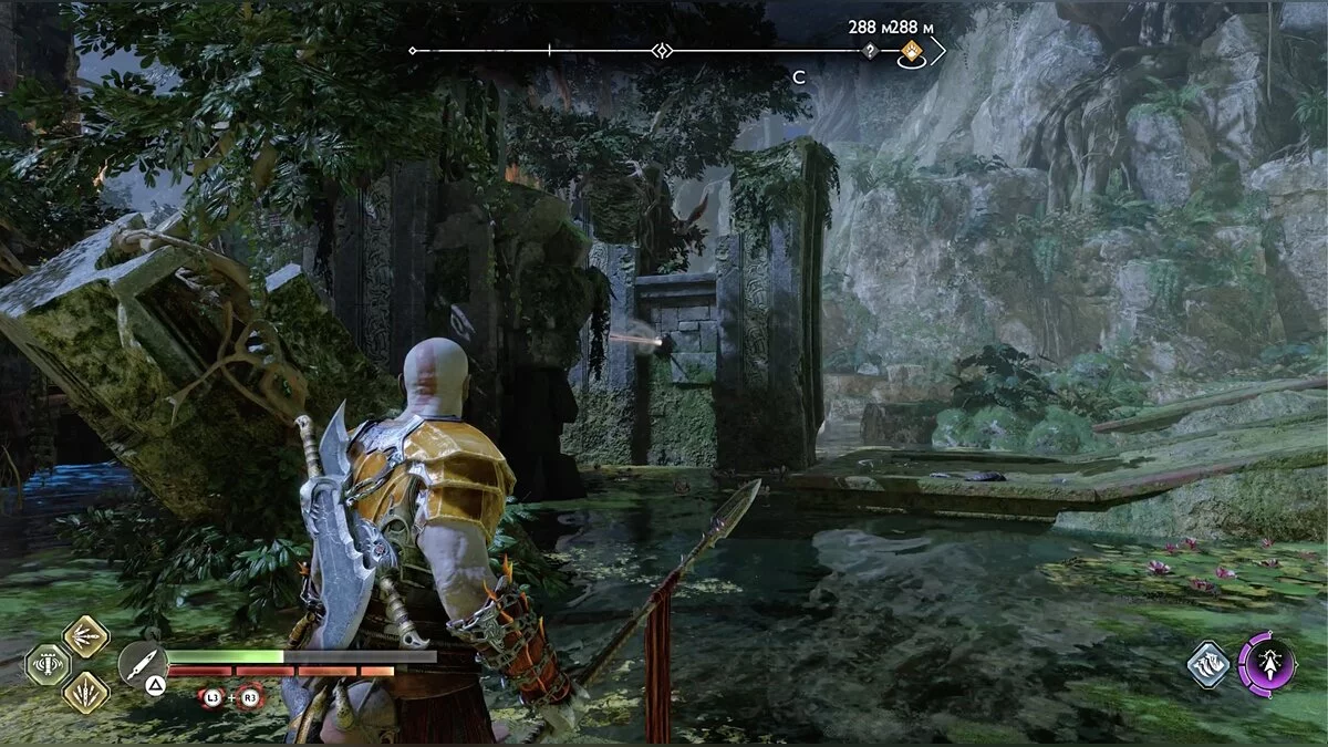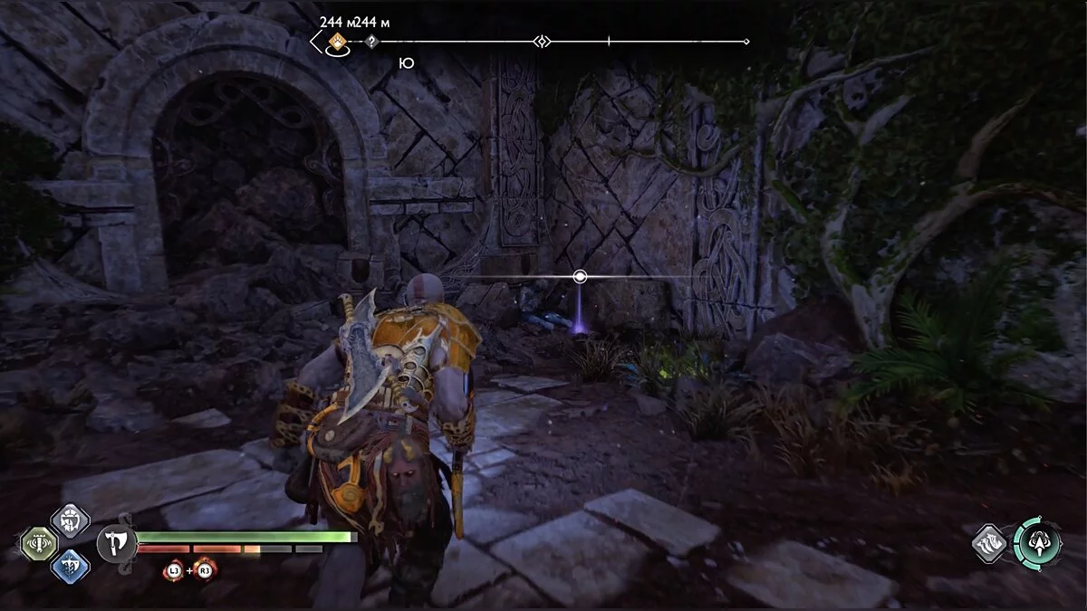 Путешествуя под землей, вы наткнетесь на укрепление для клинков Хаоса, которое обросло наростами. Разбейте их стрелами Атрея, чтобы получить доступ и перепрыгнуть на другую сторону. Основной путь ведет вас вперед, однако обратите внимание на левую сторону коридора. Первый поворот позволит открыть быстрый переход в место, где вы уже были — он нам не нужен. Во втором повороте можно перепрыгнуть небольшой водопад и спуститься вниз. Там Кратос найдет артефакт, а также ворота, которые можно открыть.