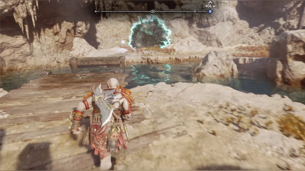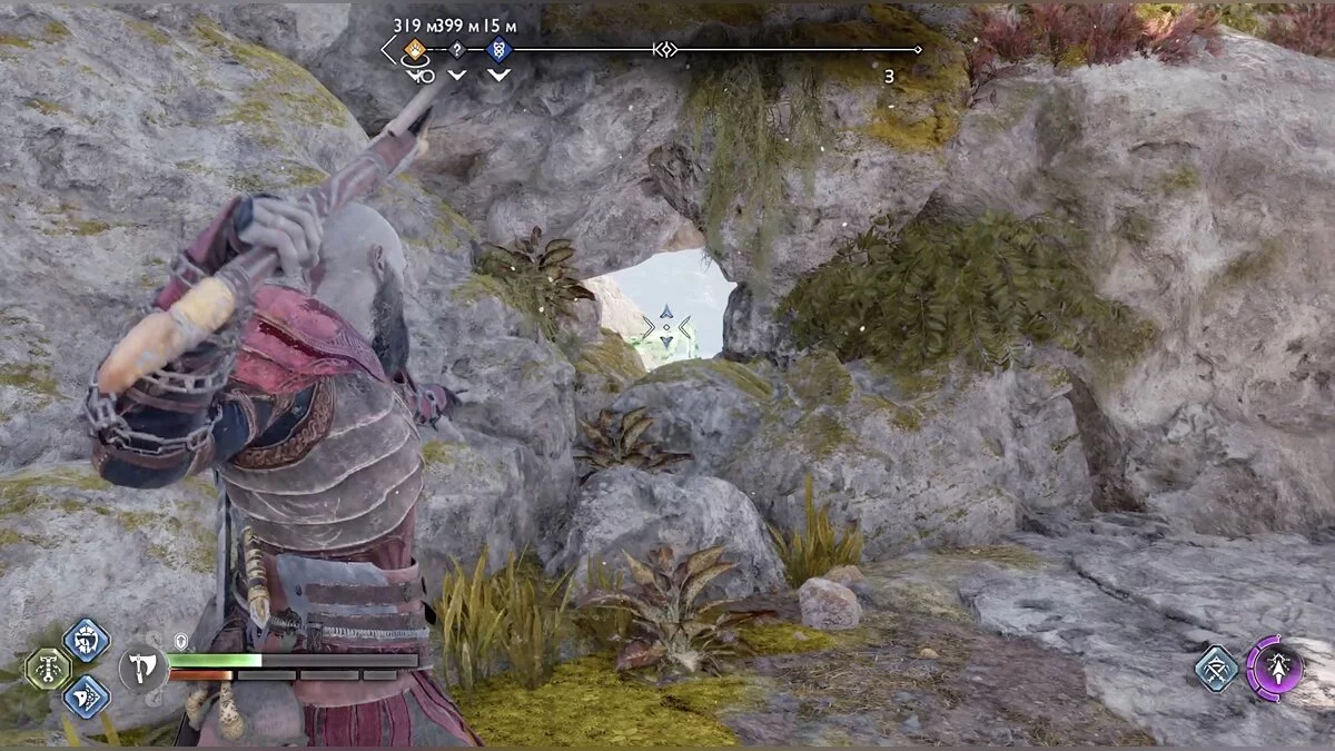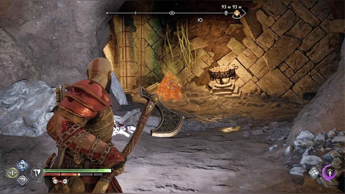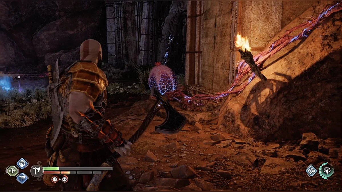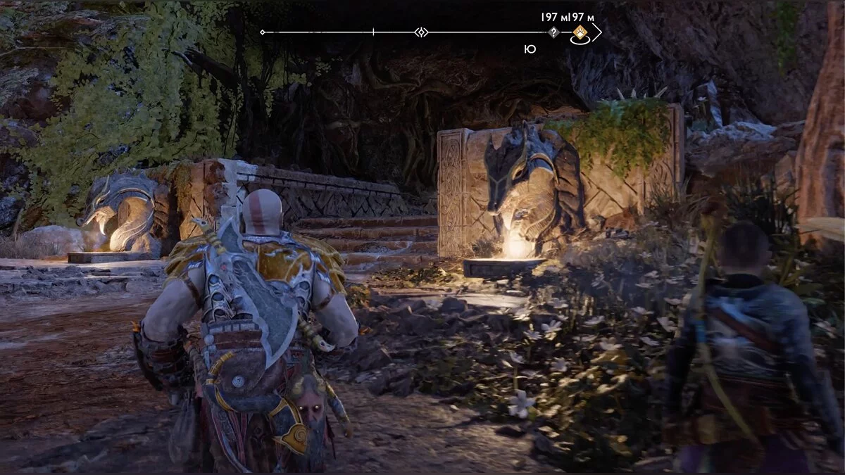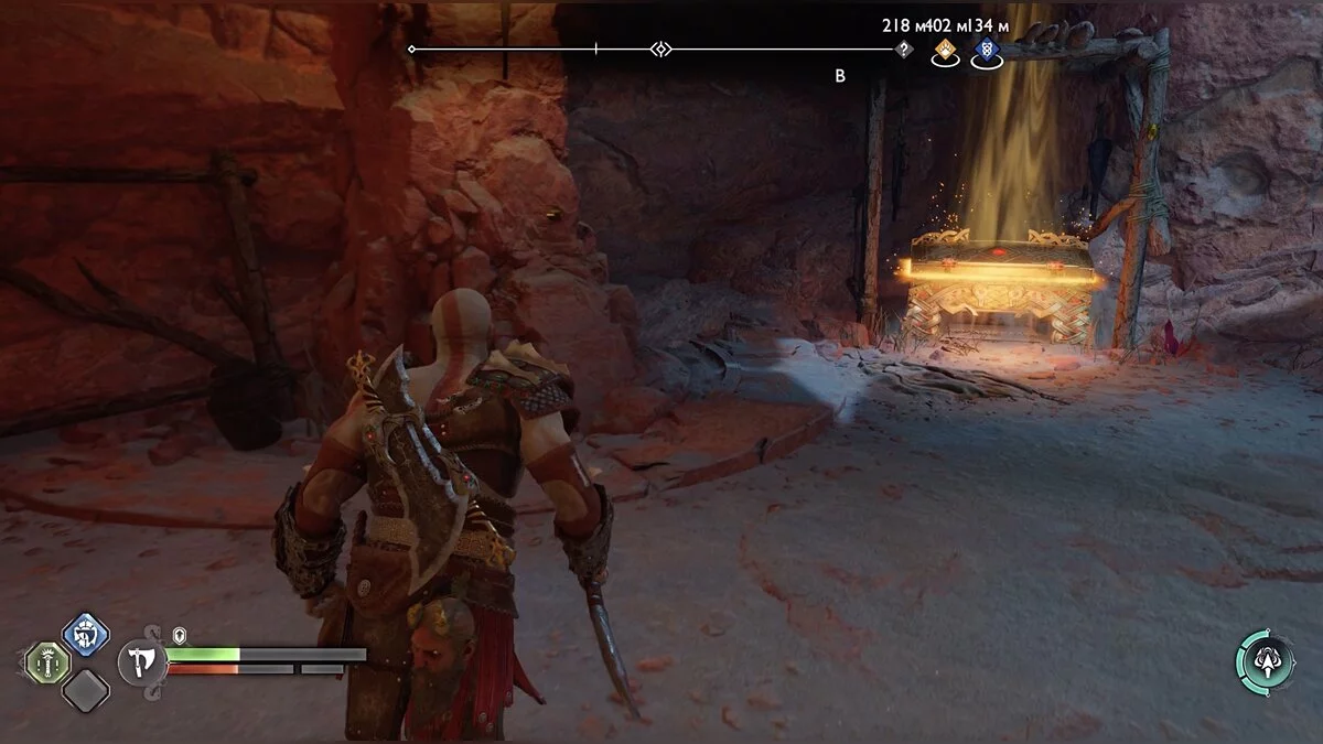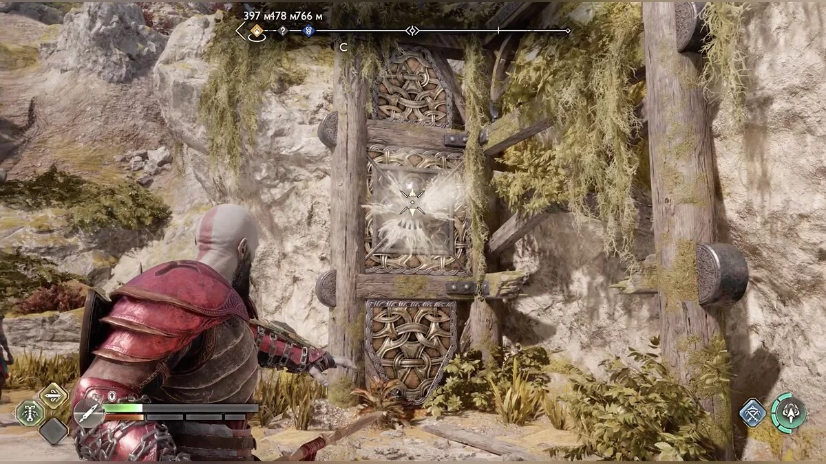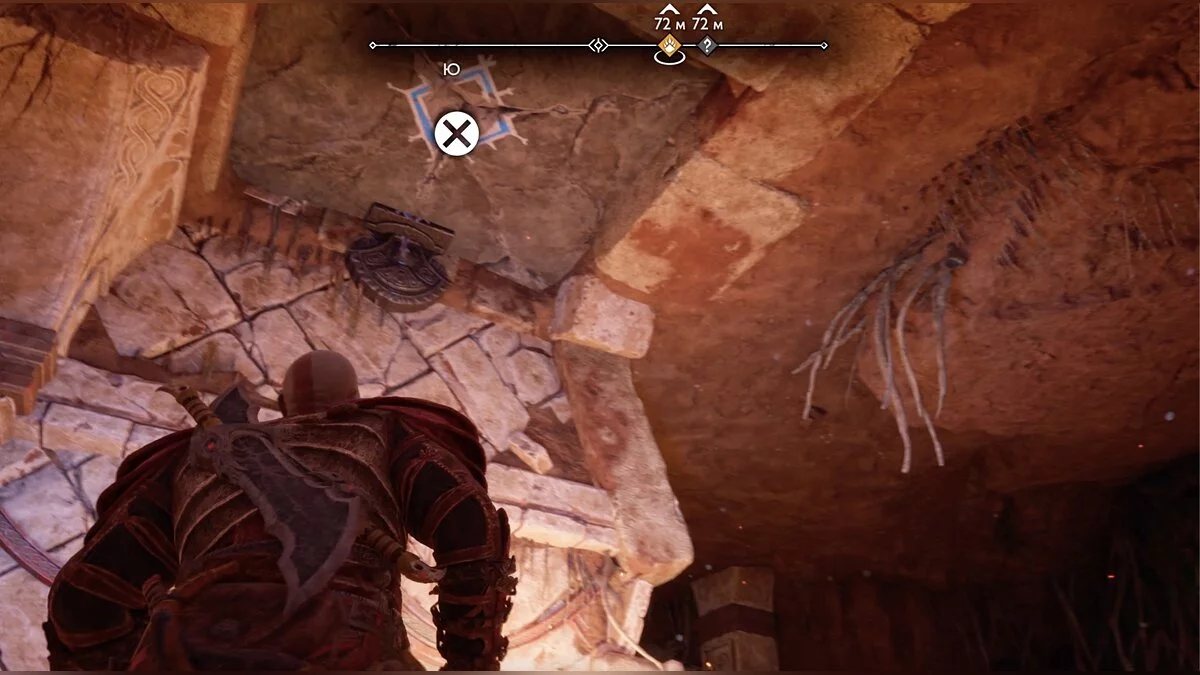 Путешествуя под землей, вы наткнетесь на укрепление для клинков Хаоса, которое обросло наростами. Разбейте их стрелами Атрея, чтобы получить доступ и перепрыгнуть на другую сторону. Основной путь ведет вас вперед, однако обратите внимание на левую сторону коридора. Первый поворот позволит открыть быстрый переход в место, где вы уже были — он нам не нужен. Во втором повороте можно перепрыгнуть небольшой водопад и спуститься вниз. Там Кратос найдет артефакт, а также ворота, которые можно открыть.