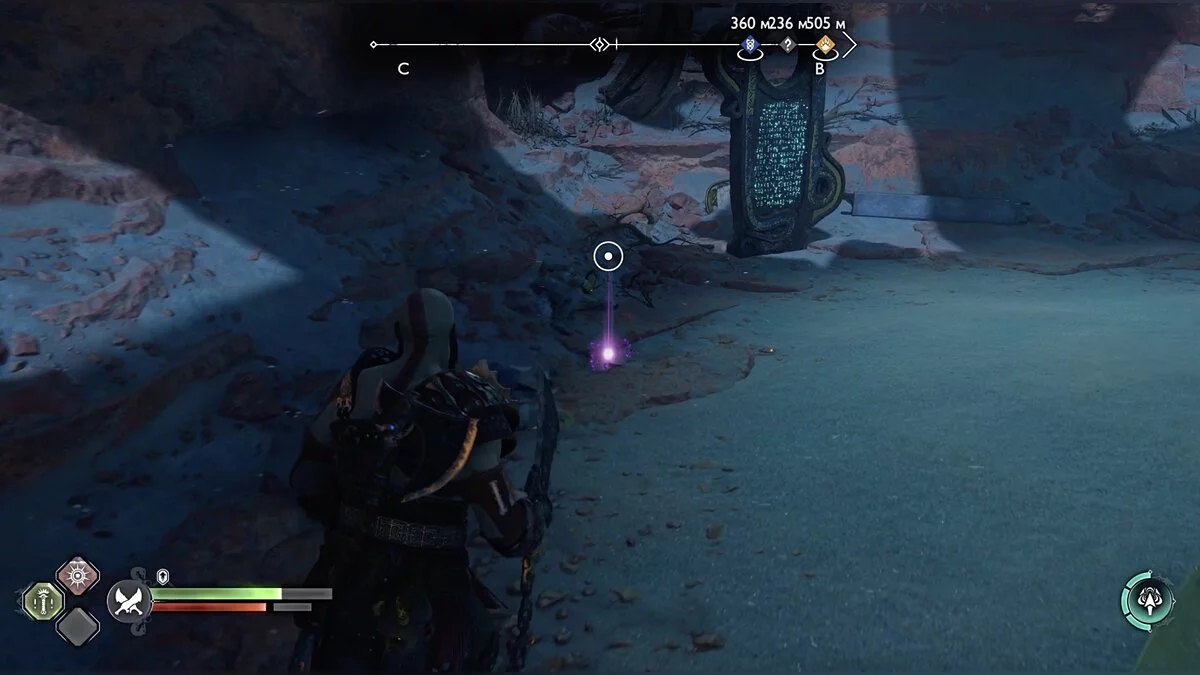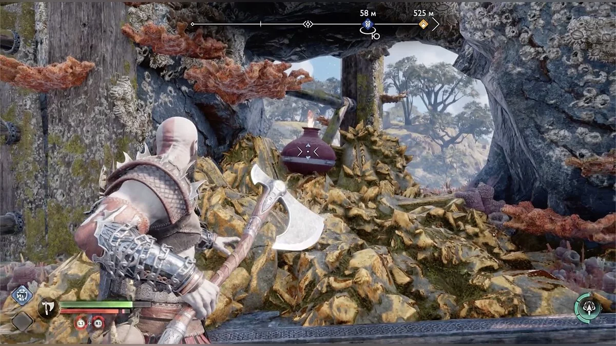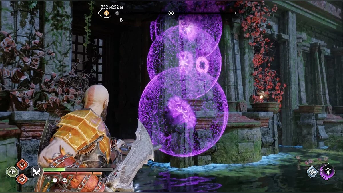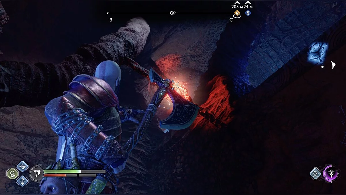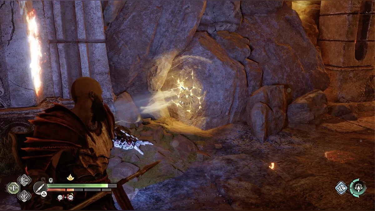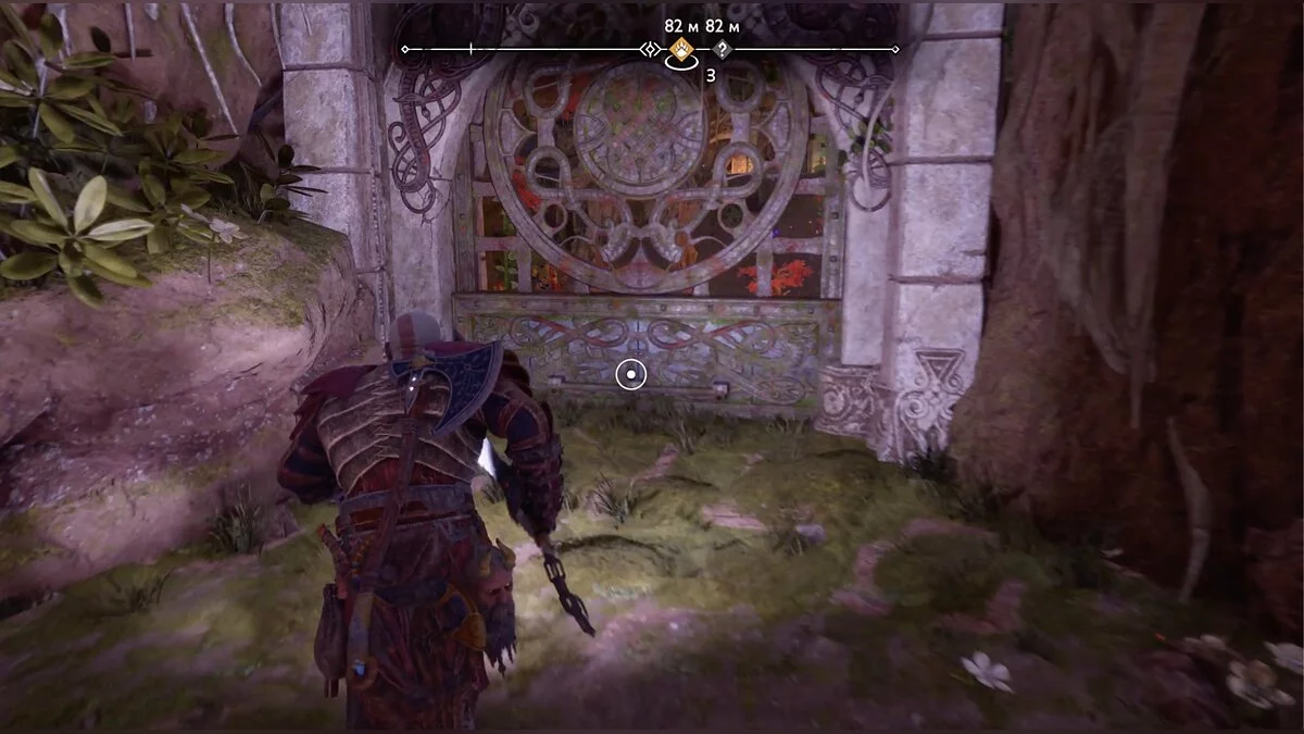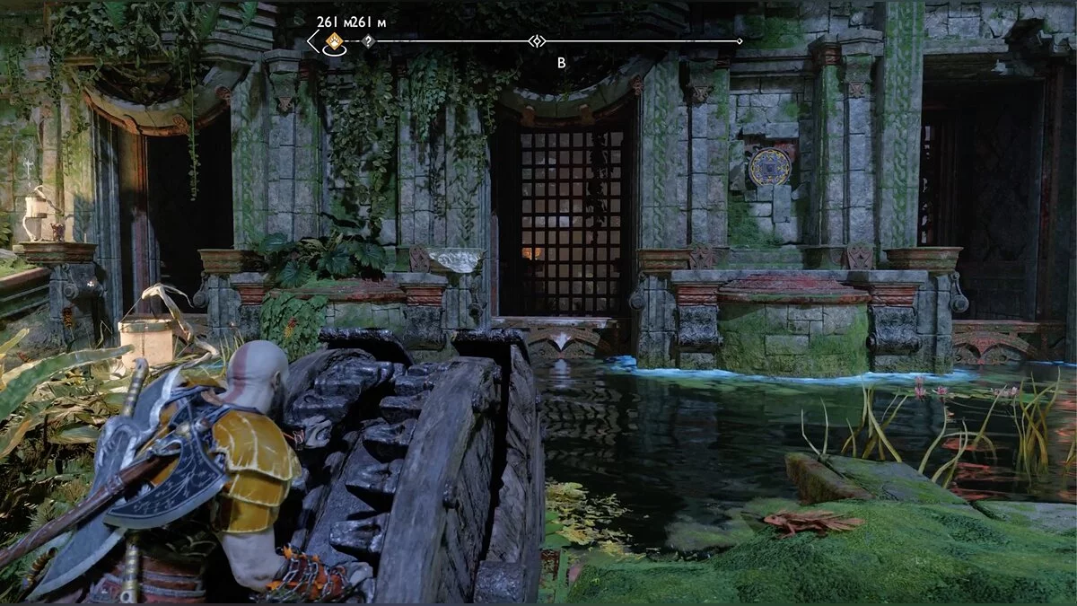 Путешествуя под землей, вы наткнетесь на укрепление для клинков Хаоса, которое обросло наростами. Разбейте их стрелами Атрея, чтобы получить доступ и перепрыгнуть на другую сторону. Основной путь ведет вас вперед, однако обратите внимание на левую сторону коридора. Первый поворот позволит открыть быстрый переход в место, где вы уже были — он нам не нужен. Во втором повороте можно перепрыгнуть небольшой водопад и спуститься вниз. Там Кратос найдет артефакт, а также ворота, которые можно открыть.