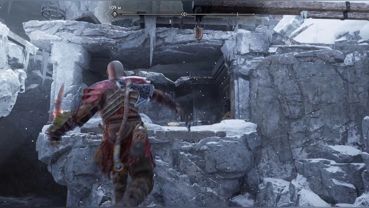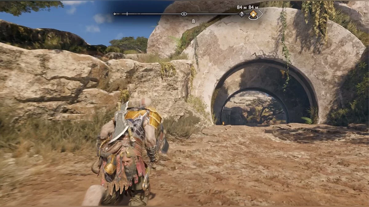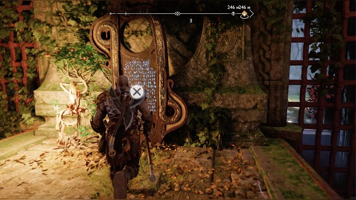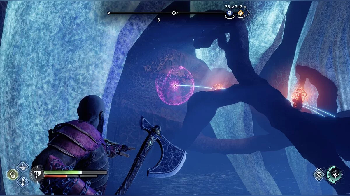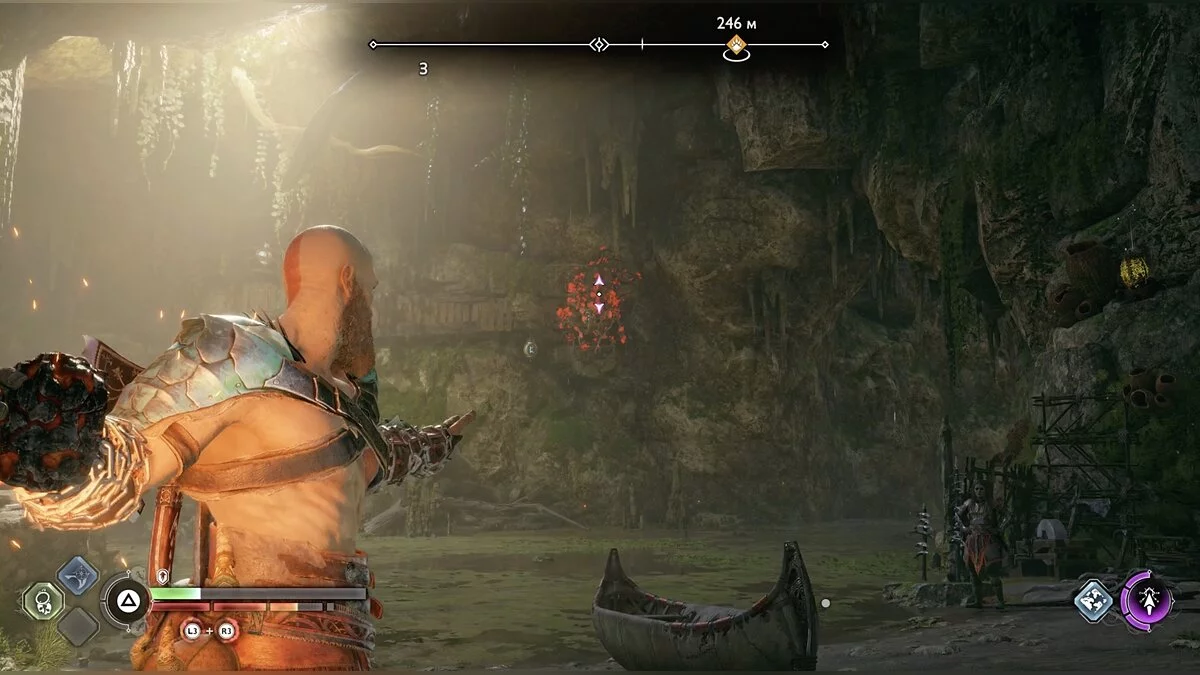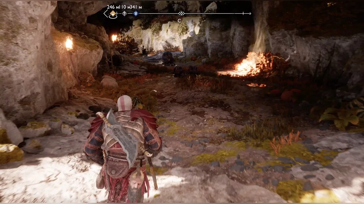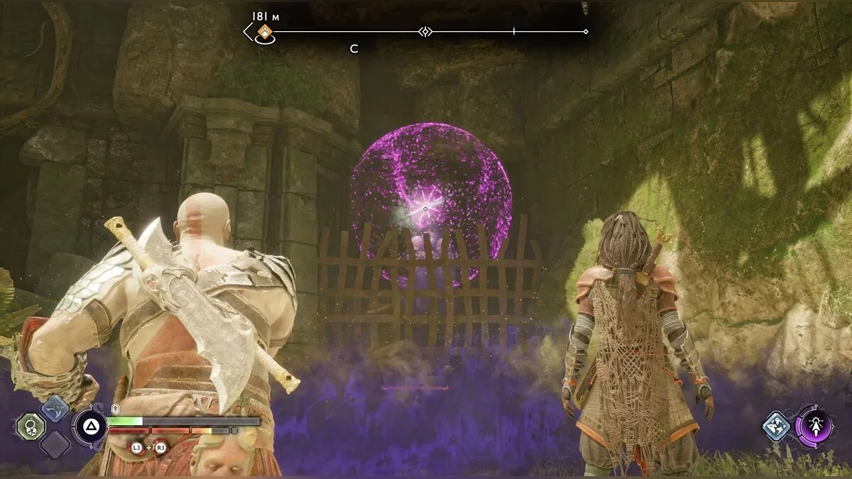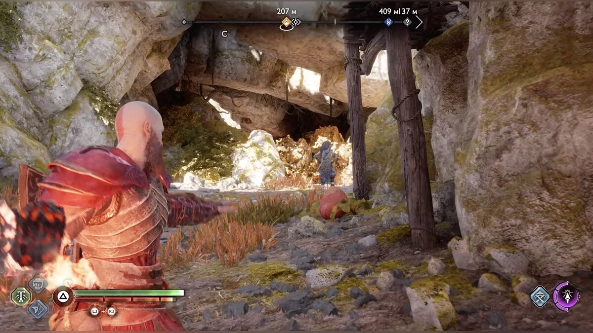 Путешествуя под землей, вы наткнетесь на укрепление для клинков Хаоса, которое обросло наростами. Разбейте их стрелами Атрея, чтобы получить доступ и перепрыгнуть на другую сторону. Основной путь ведет вас вперед, однако обратите внимание на левую сторону коридора. Первый поворот позволит открыть быстрый переход в место, где вы уже были — он нам не нужен. Во втором повороте можно перепрыгнуть небольшой водопад и спуститься вниз. Там Кратос найдет артефакт, а также ворота, которые можно открыть.