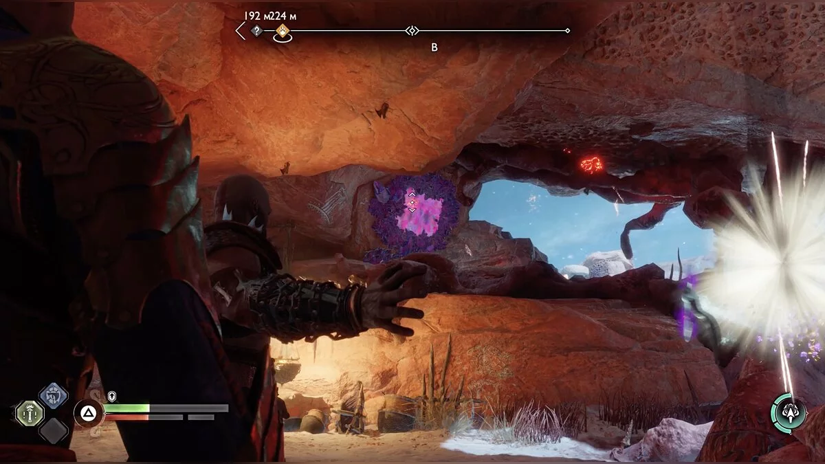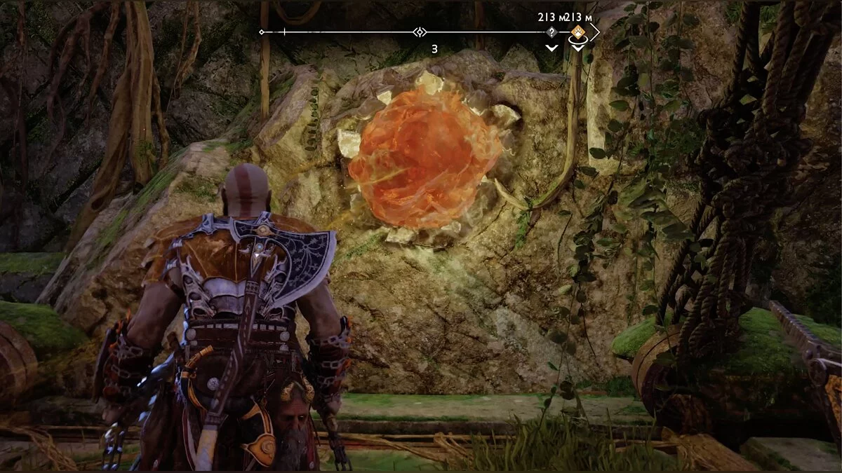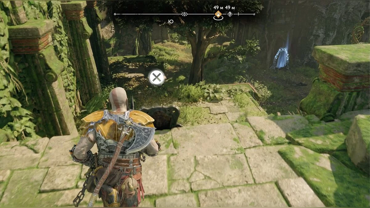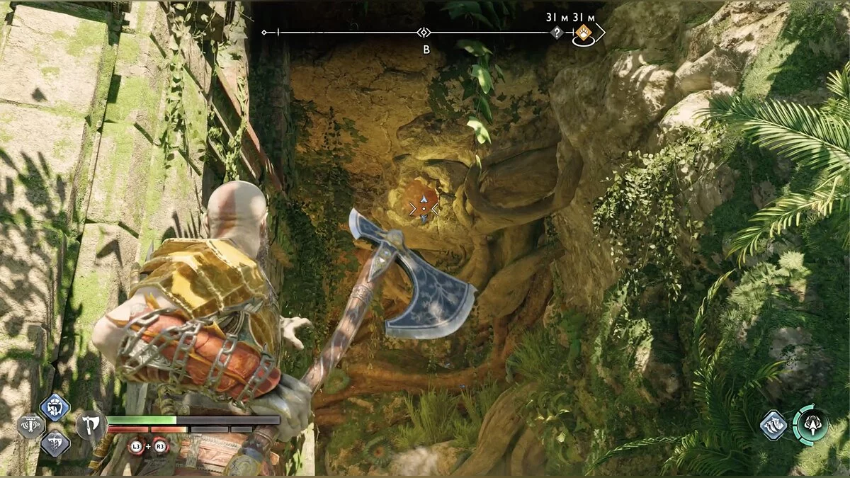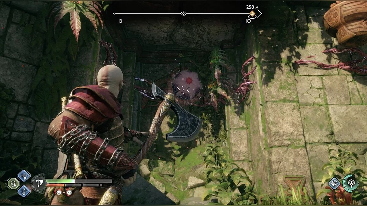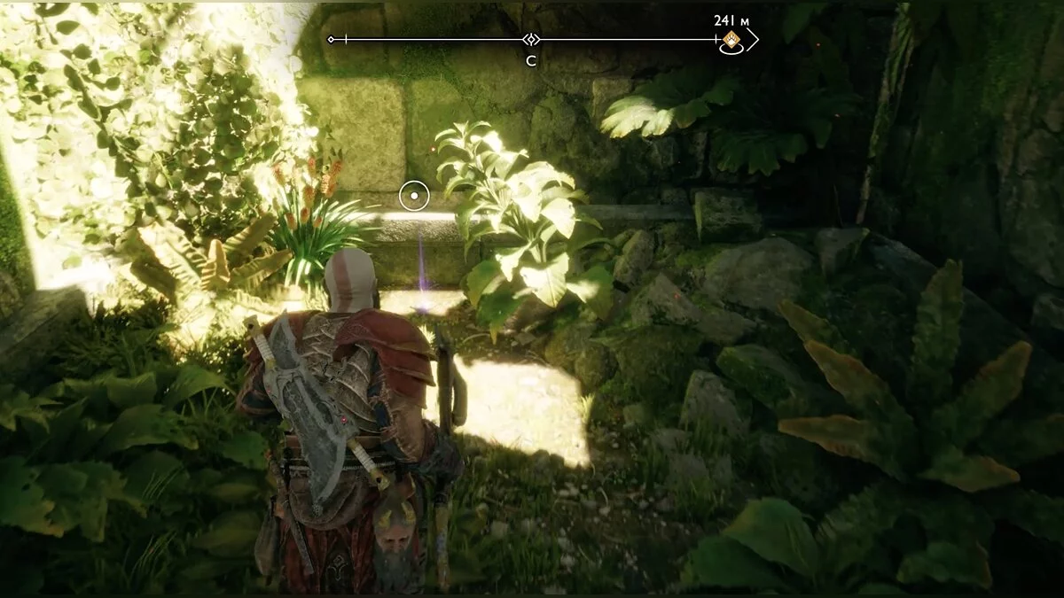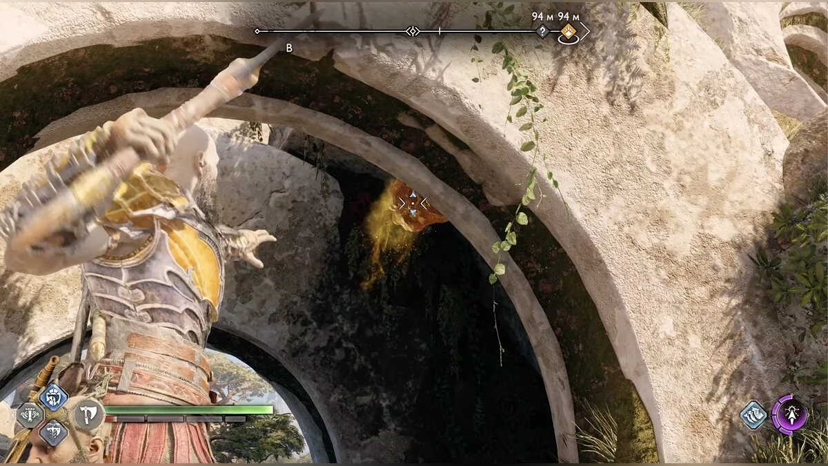Путешествуя под землей, вы наткнетесь на укрепление для клинков Хаоса, которое обросло наростами. Разбейте их стрелами Атрея, чтобы получить доступ и перепрыгнуть на другую сторону. Основной путь ведет вас вперед, однако обратите внимание на левую сторону коридора. Первый поворот позволит открыть быстрый переход в место, где вы уже были — он нам не нужен. Во втором повороте можно перепрыгнуть небольшой водопад и спуститься вниз. Там Кратос найдет артефакт, а также ворота, которые можно открыть.