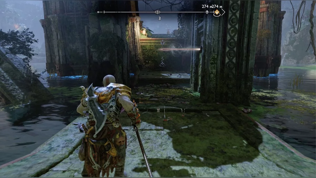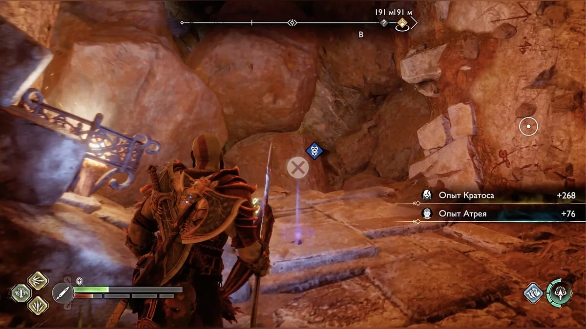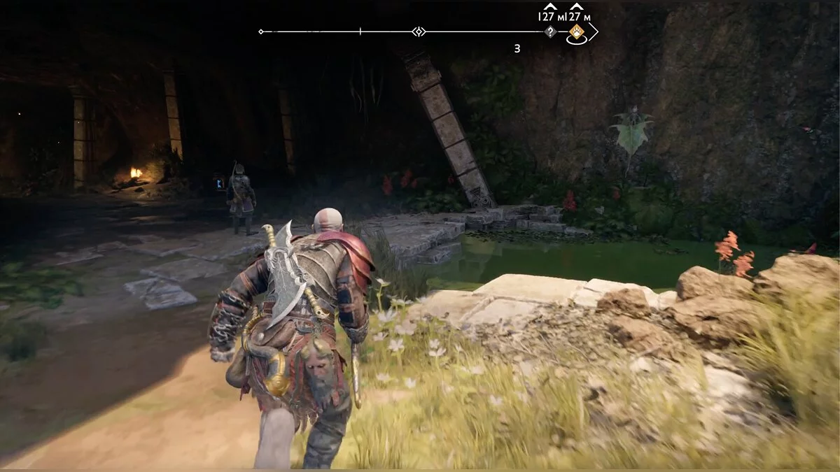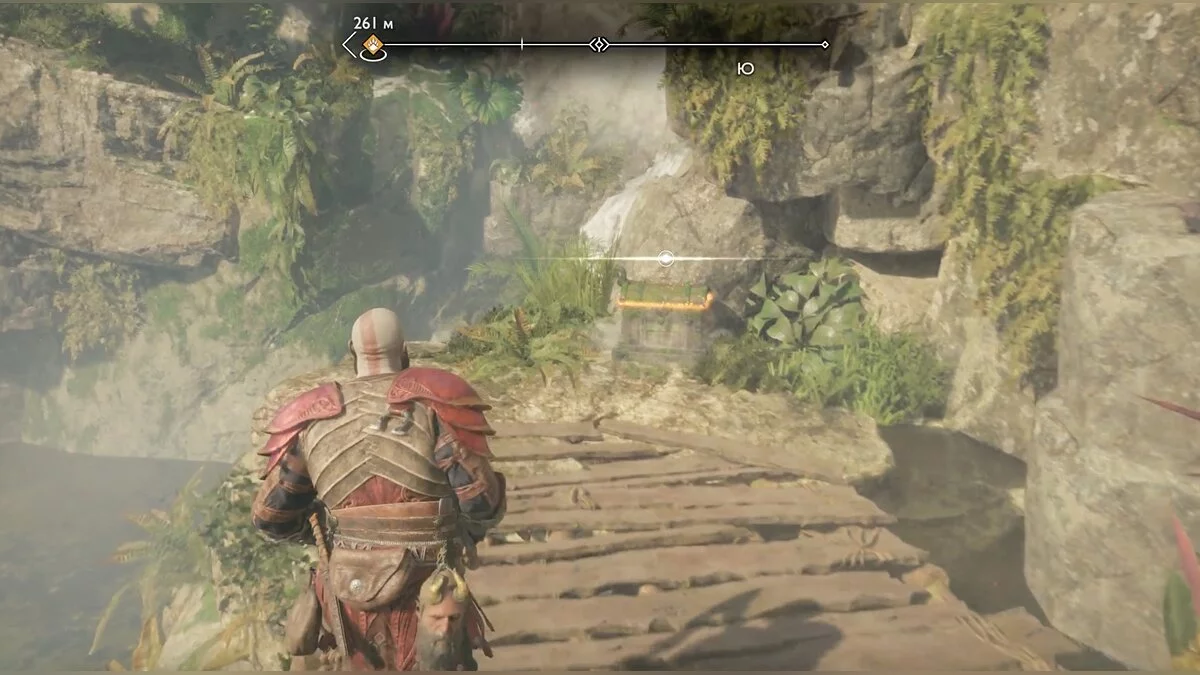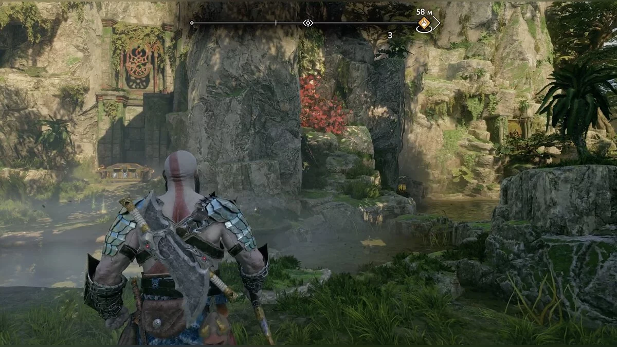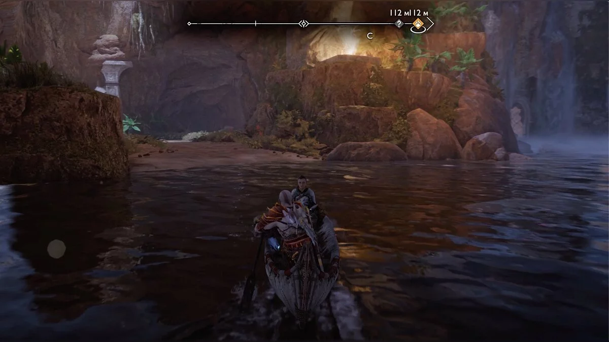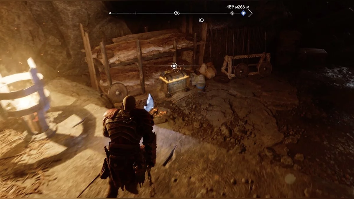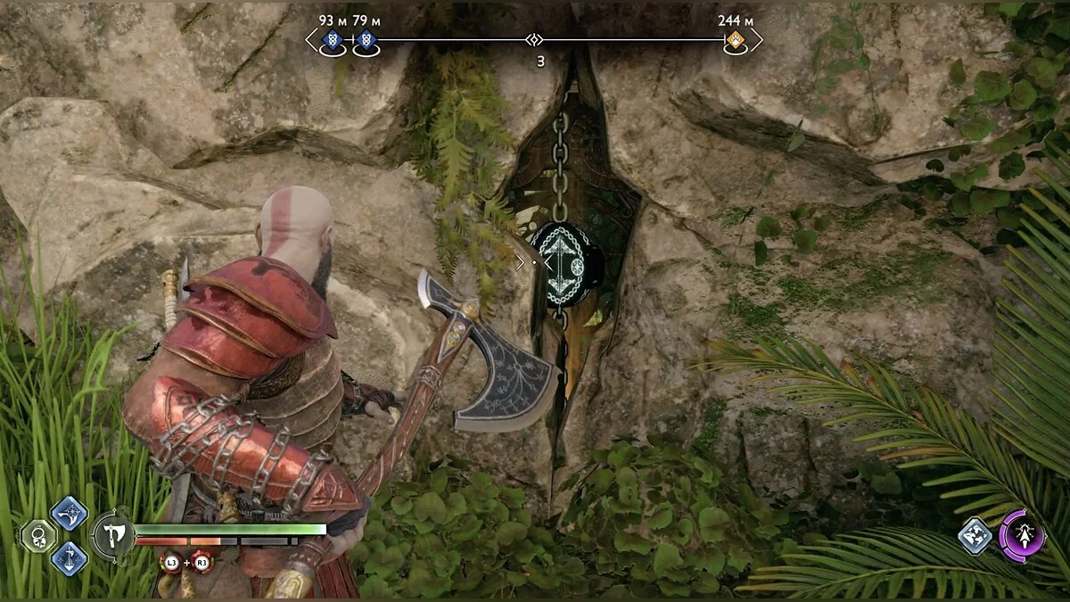 Путешествуя под землей, вы наткнетесь на укрепление для клинков Хаоса, которое обросло наростами. Разбейте их стрелами Атрея, чтобы получить доступ и перепрыгнуть на другую сторону. Основной путь ведет вас вперед, однако обратите внимание на левую сторону коридора. Первый поворот позволит открыть быстрый переход в место, где вы уже были — он нам не нужен. Во втором повороте можно перепрыгнуть небольшой водопад и спуститься вниз. Там Кратос найдет артефакт, а также ворота, которые можно открыть.