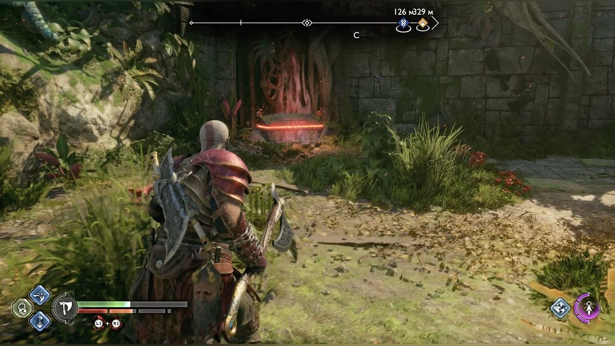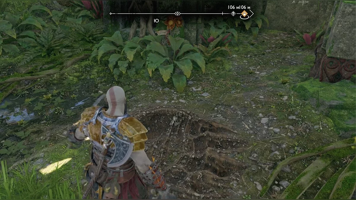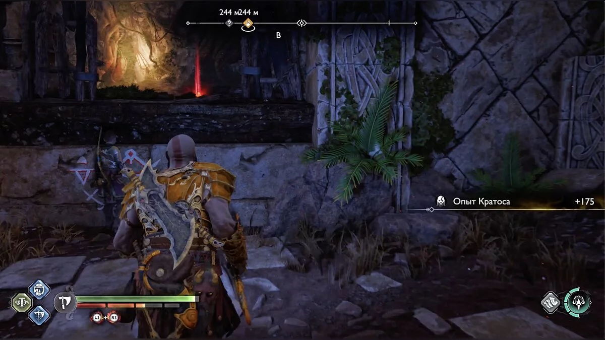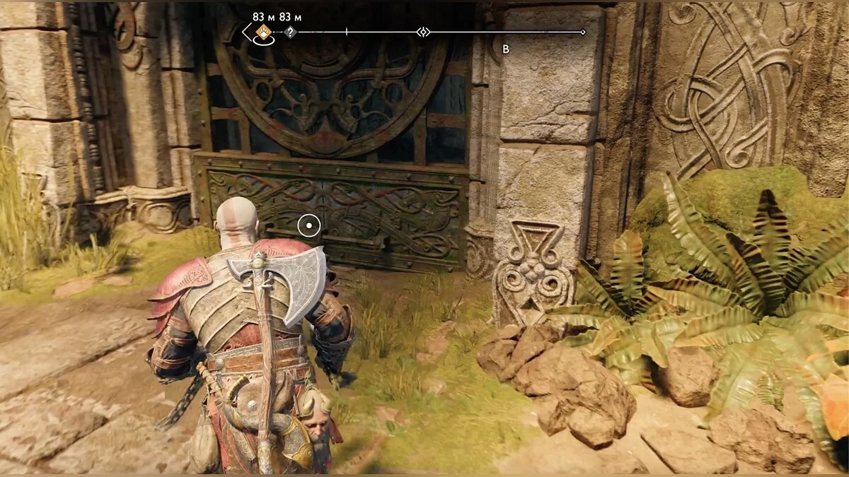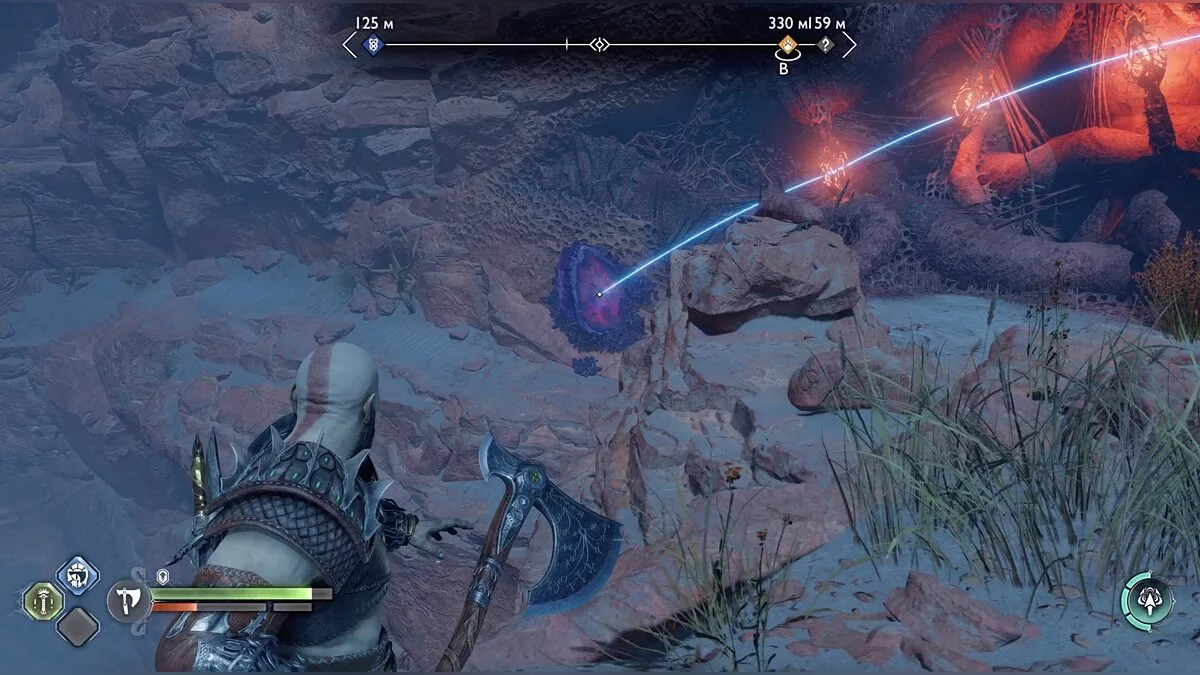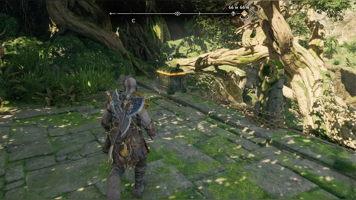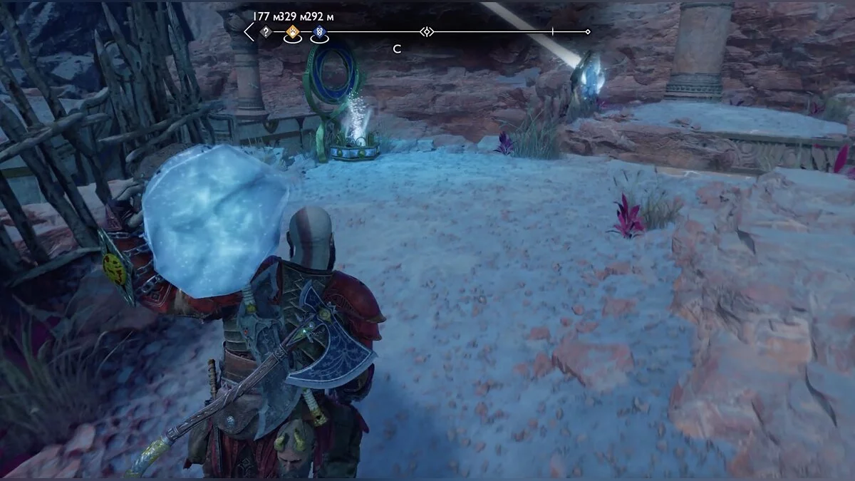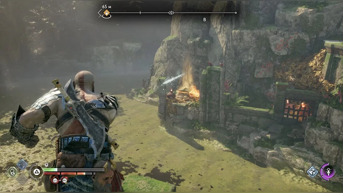 Путешествуя под землей, вы наткнетесь на укрепление для клинков Хаоса, которое обросло наростами. Разбейте их стрелами Атрея, чтобы получить доступ и перепрыгнуть на другую сторону. Основной путь ведет вас вперед, однако обратите внимание на левую сторону коридора. Первый поворот позволит открыть быстрый переход в место, где вы уже были — он нам не нужен. Во втором повороте можно перепрыгнуть небольшой водопад и спуститься вниз. Там Кратос найдет артефакт, а также ворота, которые можно открыть.
