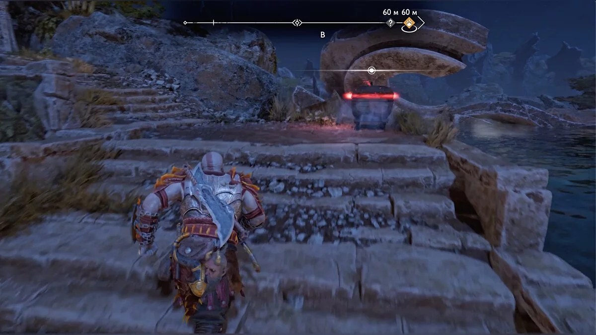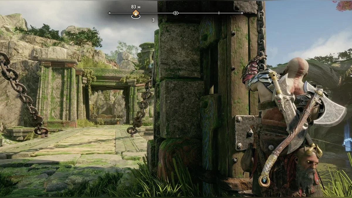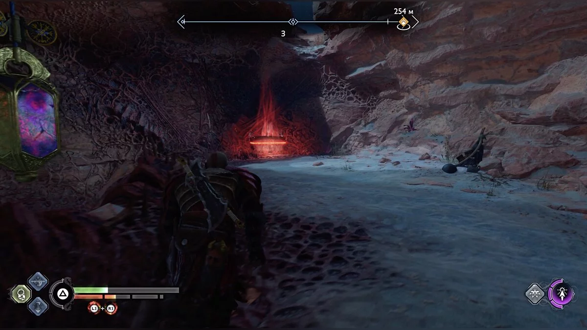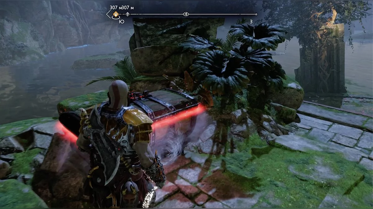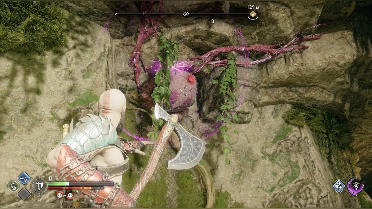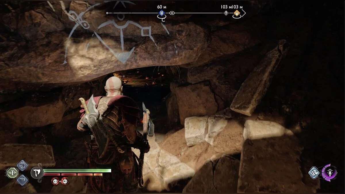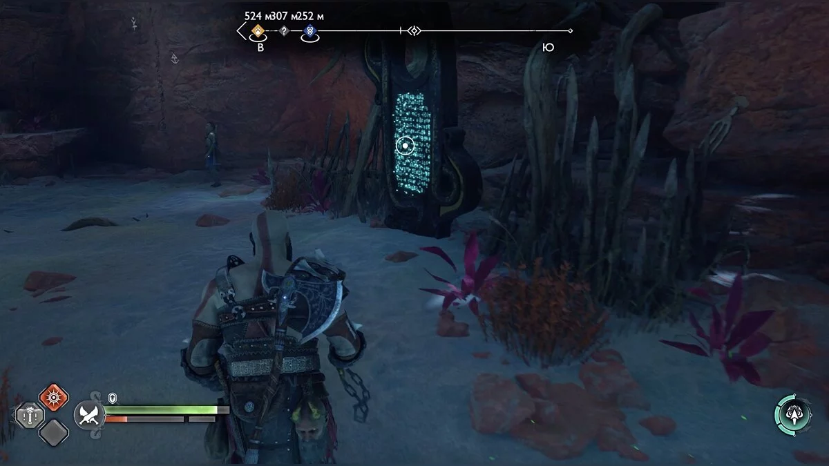 Путешествуя под землей, вы наткнетесь на укрепление для клинков Хаоса, которое обросло наростами. Разбейте их стрелами Атрея, чтобы получить доступ и перепрыгнуть на другую сторону. Основной путь ведет вас вперед, однако обратите внимание на левую сторону коридора. Первый поворот позволит открыть быстрый переход в место, где вы уже были — он нам не нужен. Во втором повороте можно перепрыгнуть небольшой водопад и спуститься вниз. Там Кратос найдет артефакт, а также ворота, которые можно открыть.
