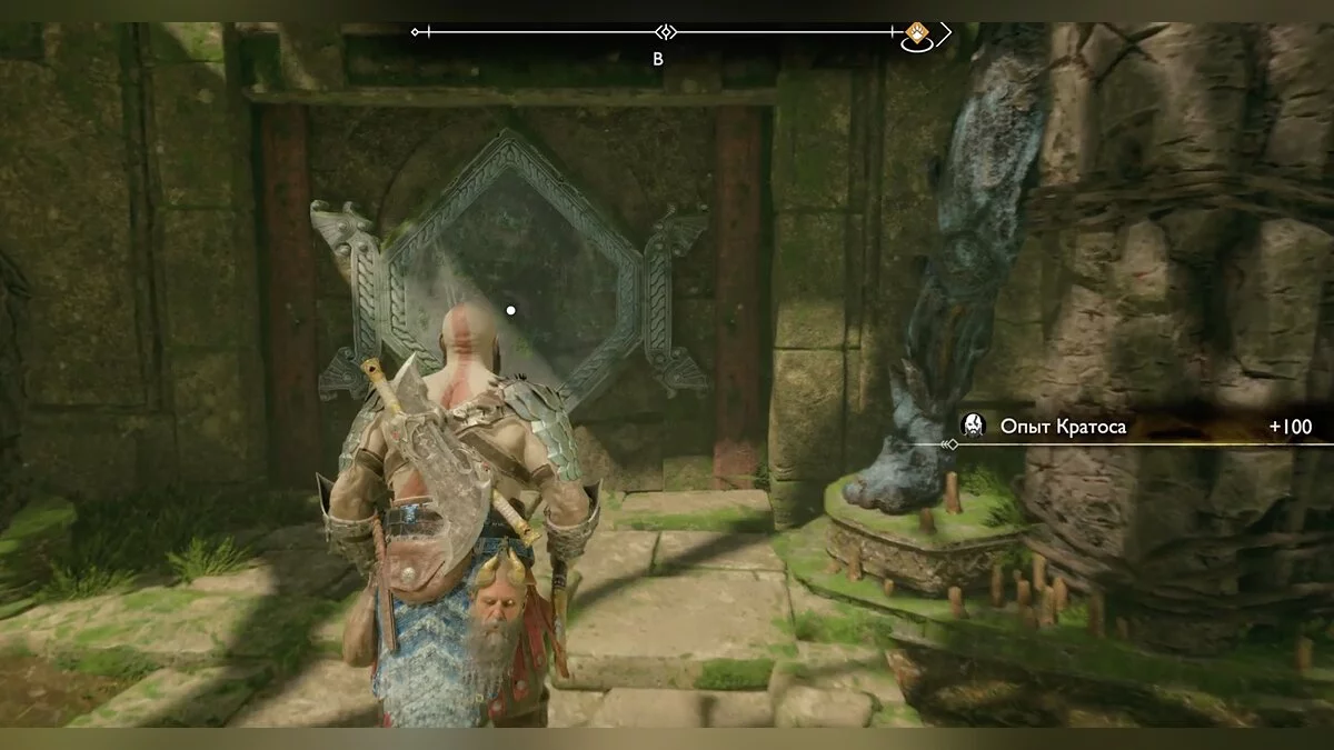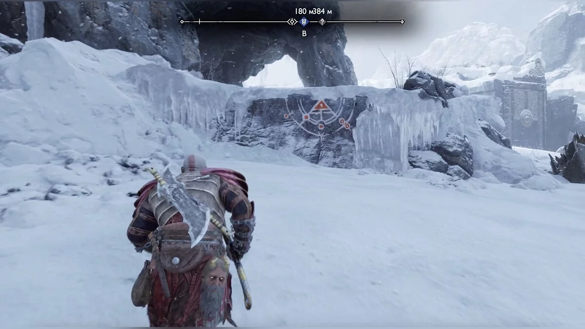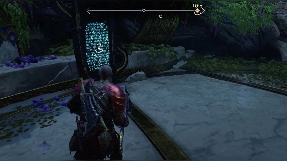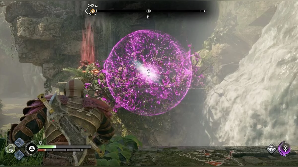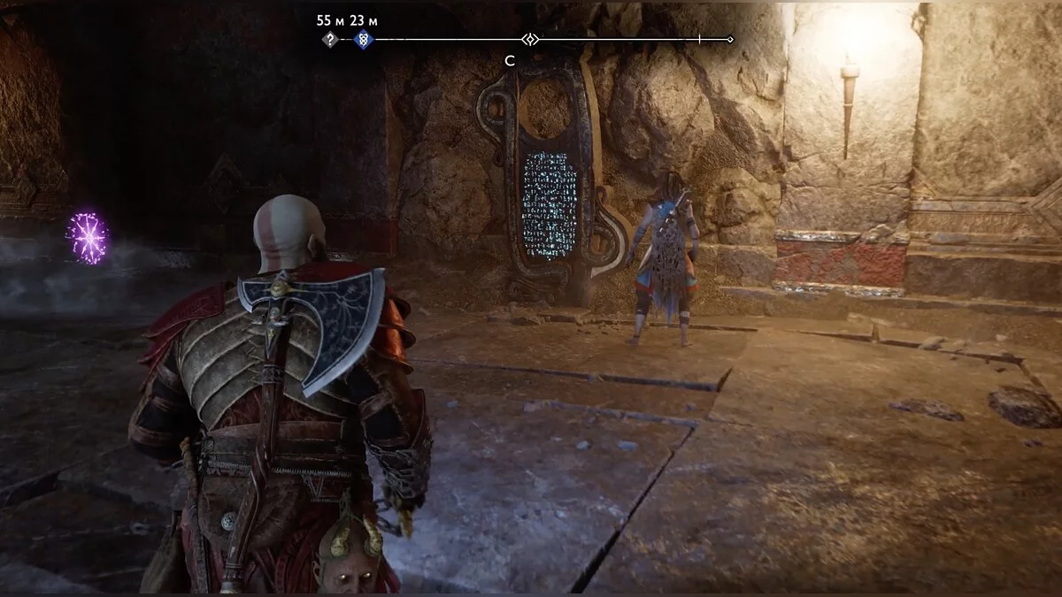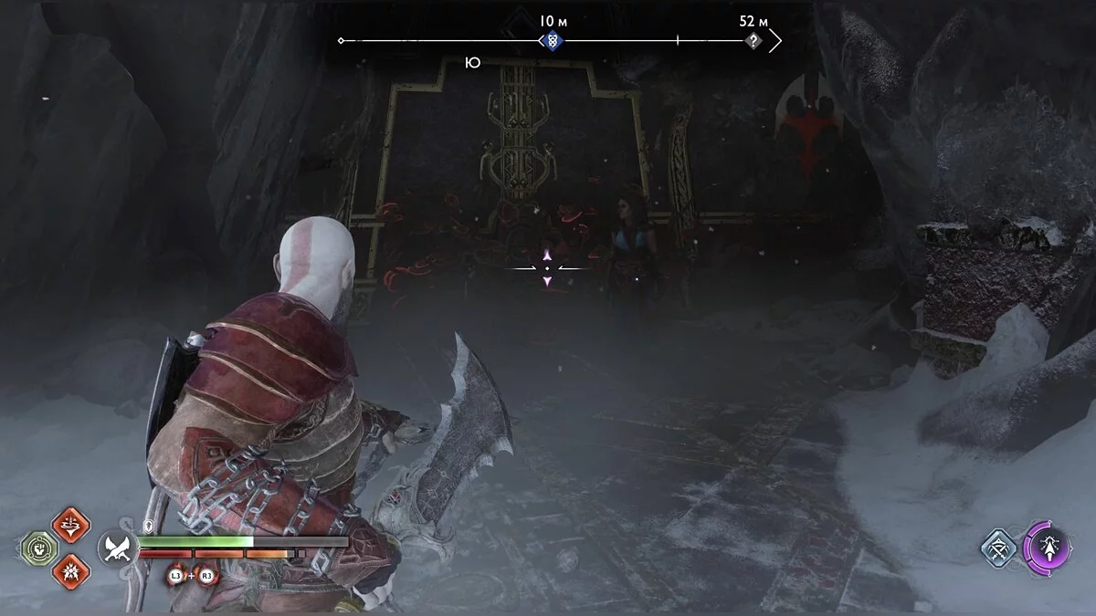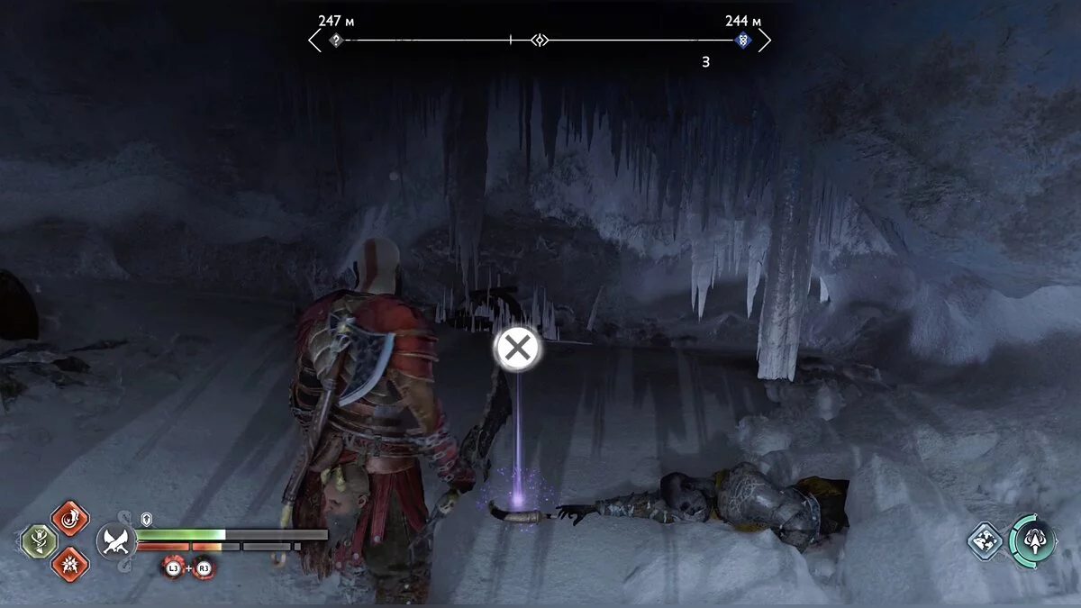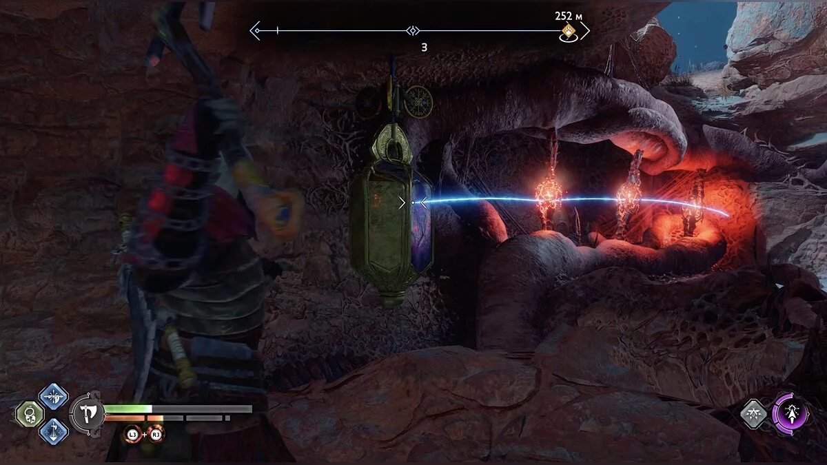 Путешествуя под землей, вы наткнетесь на укрепление для клинков Хаоса, которое обросло наростами. Разбейте их стрелами Атрея, чтобы получить доступ и перепрыгнуть на другую сторону. Основной путь ведет вас вперед, однако обратите внимание на левую сторону коридора. Первый поворот позволит открыть быстрый переход в место, где вы уже были — он нам не нужен. Во втором повороте можно перепрыгнуть небольшой водопад и спуститься вниз. Там Кратос найдет артефакт, а также ворота, которые можно открыть.