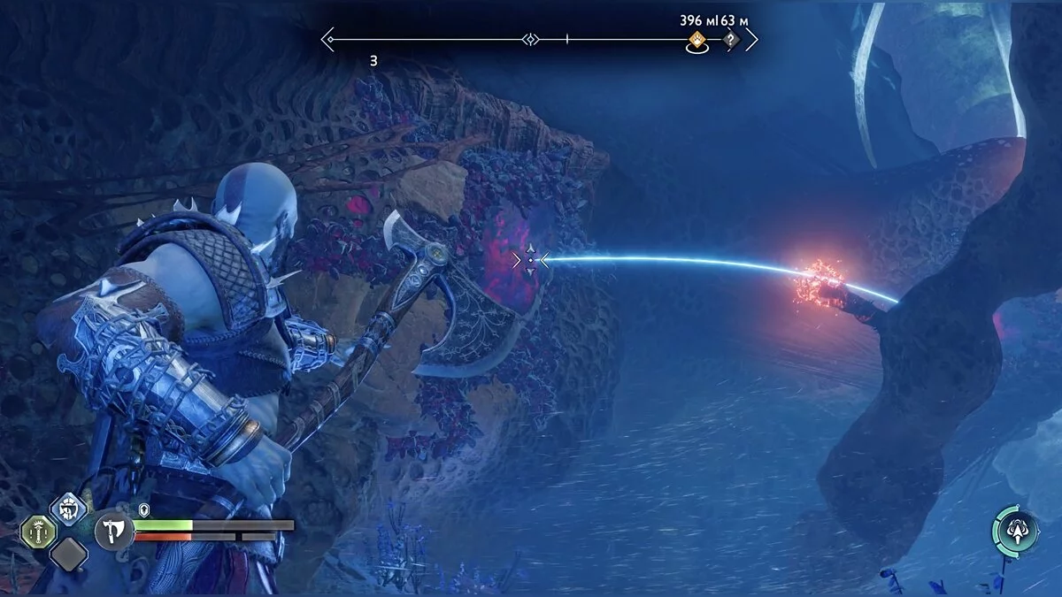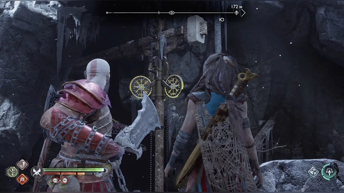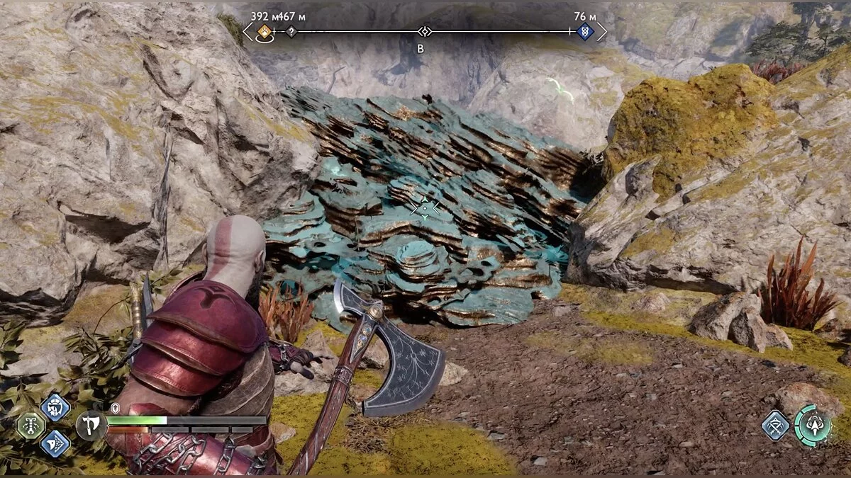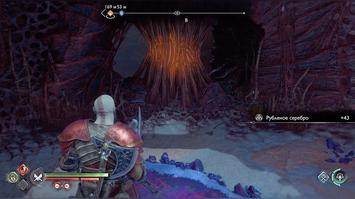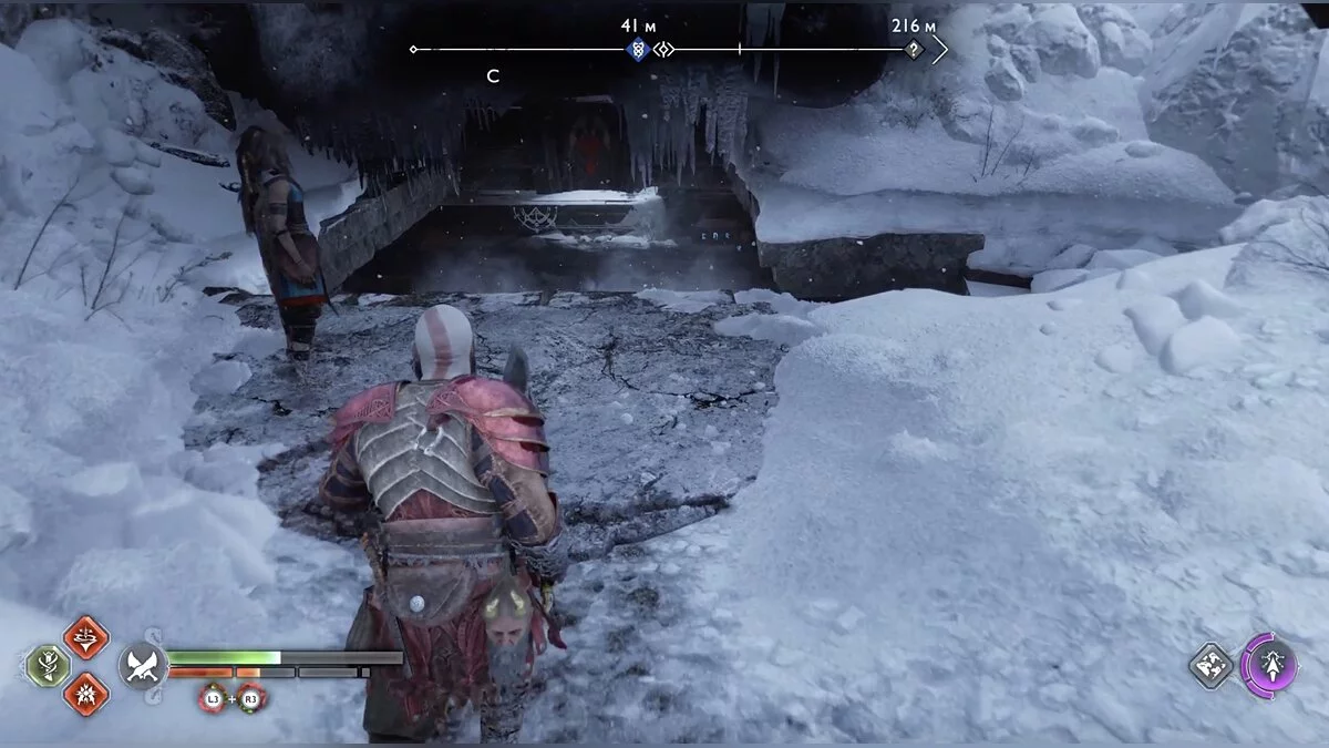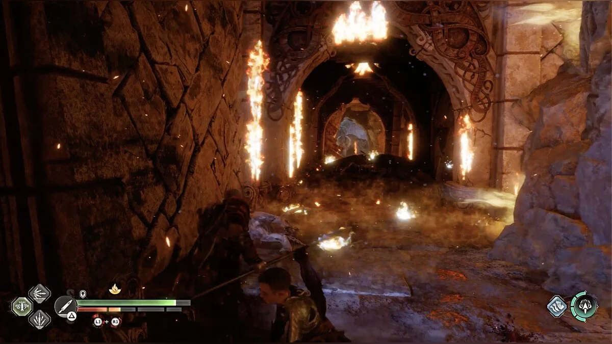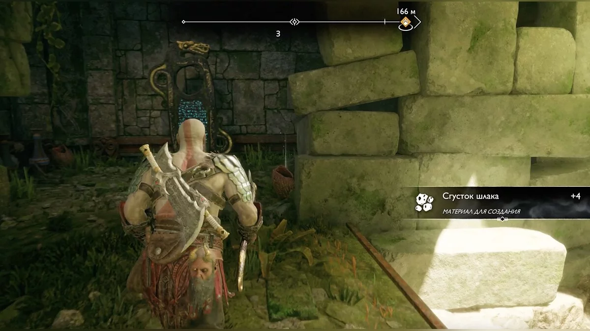 Путешествуя под землей, вы наткнетесь на укрепление для клинков Хаоса, которое обросло наростами. Разбейте их стрелами Атрея, чтобы получить доступ и перепрыгнуть на другую сторону. Основной путь ведет вас вперед, однако обратите внимание на левую сторону коридора. Первый поворот позволит открыть быстрый переход в место, где вы уже были — он нам не нужен. Во втором повороте можно перепрыгнуть небольшой водопад и спуститься вниз. Там Кратос найдет артефакт, а также ворота, которые можно открыть.