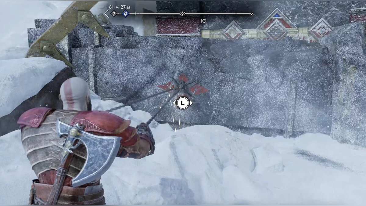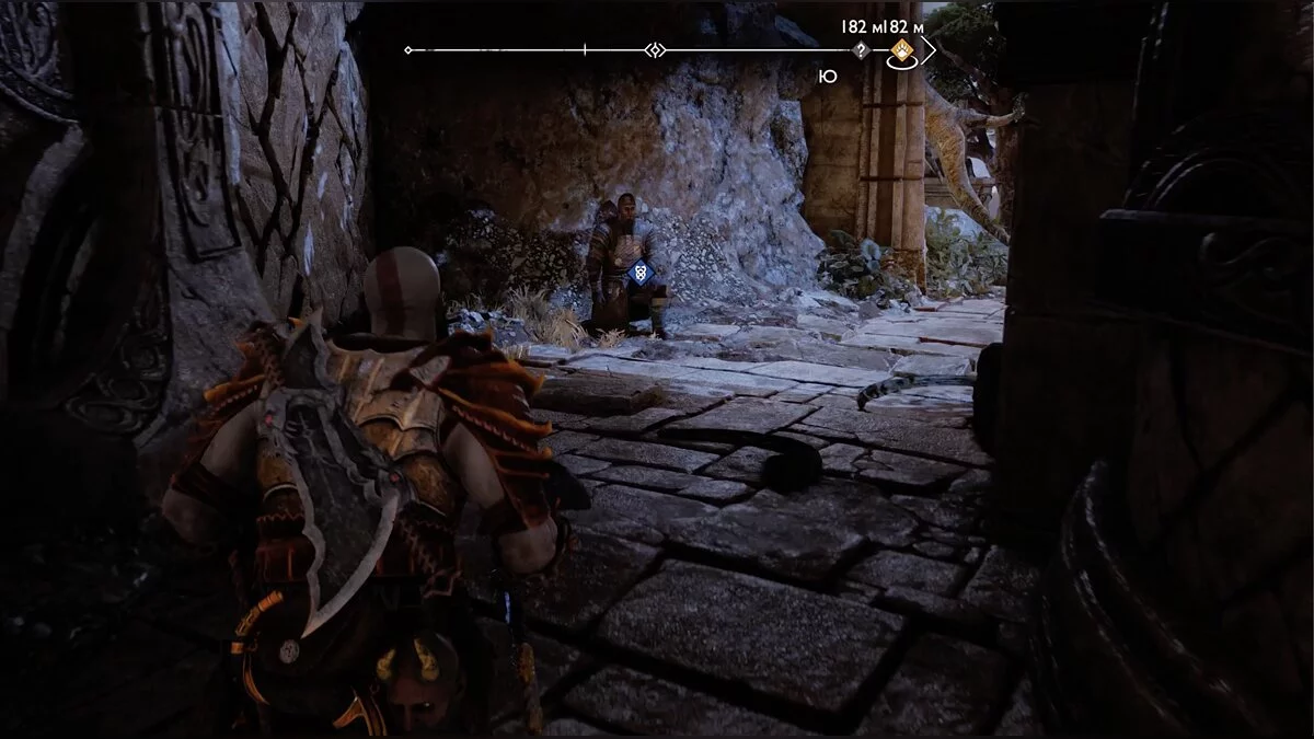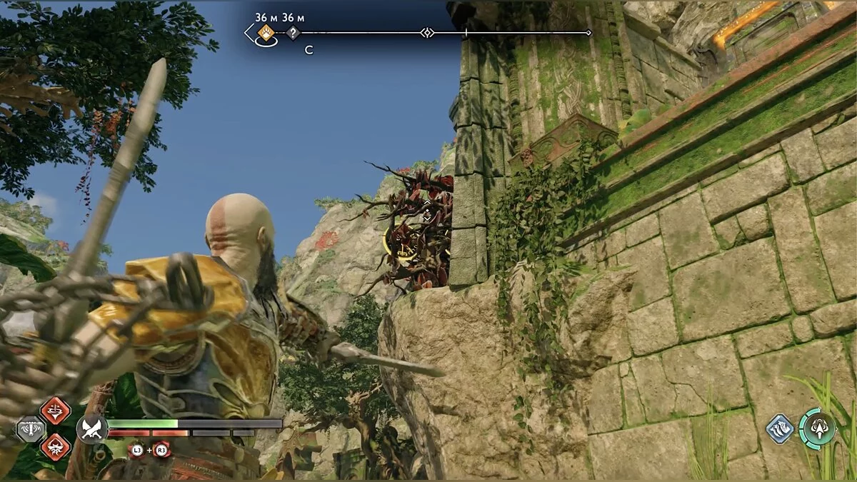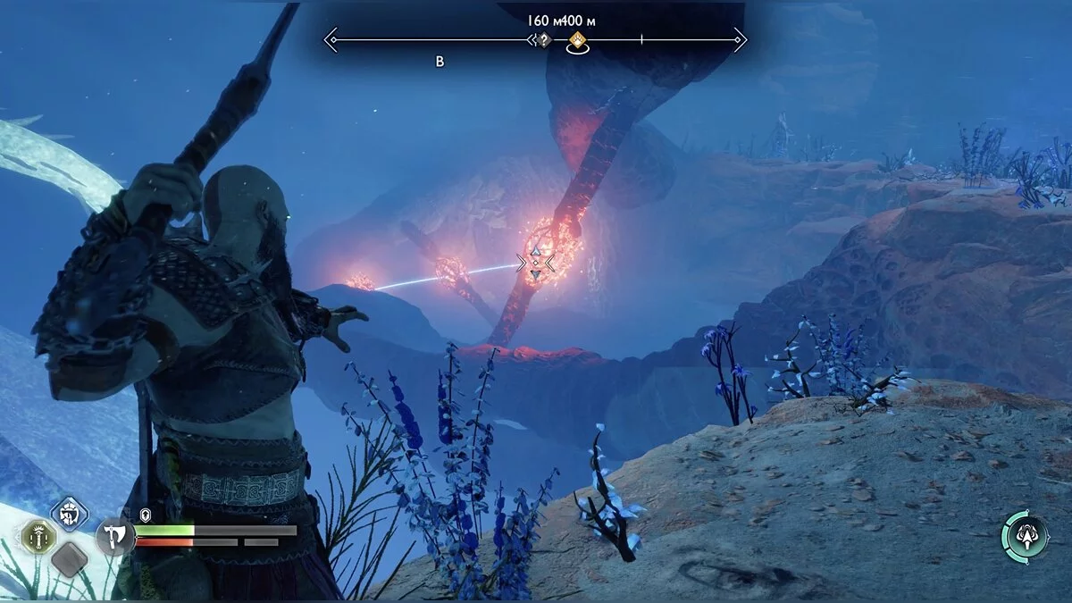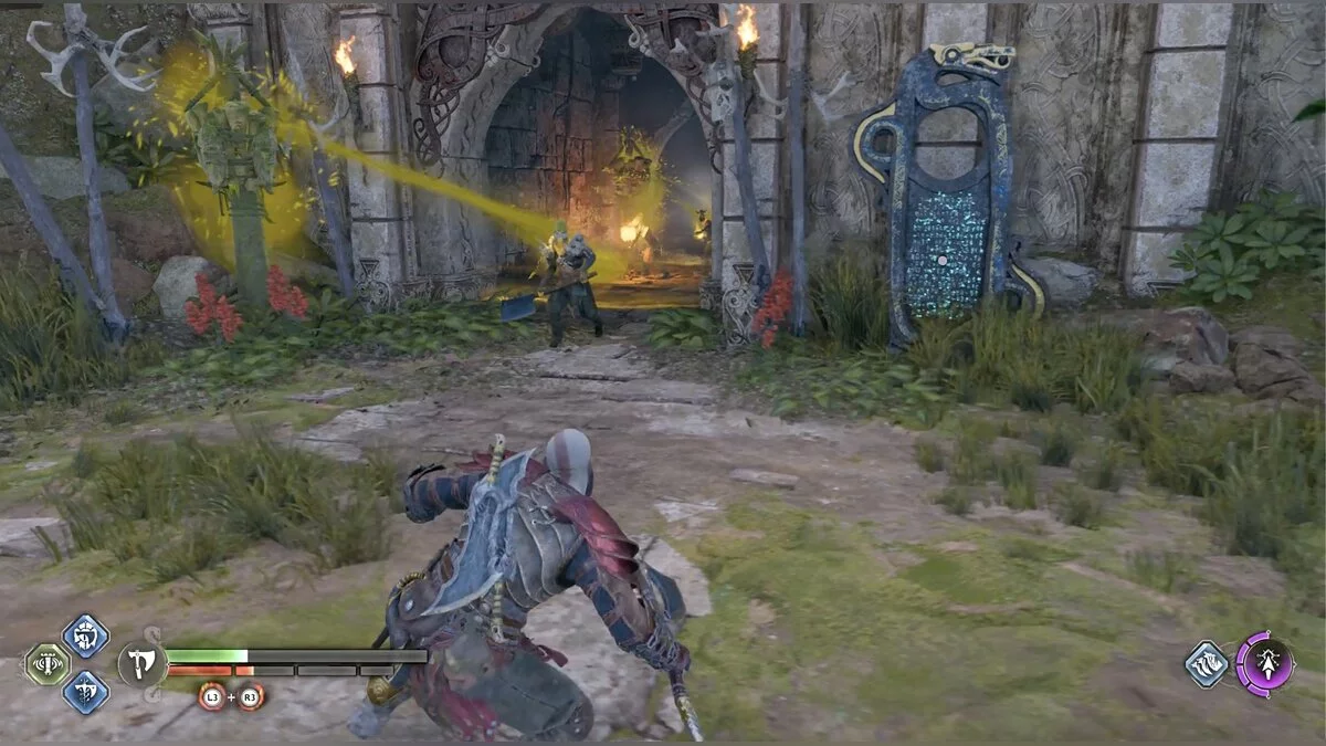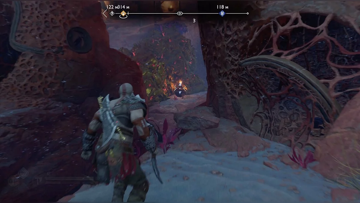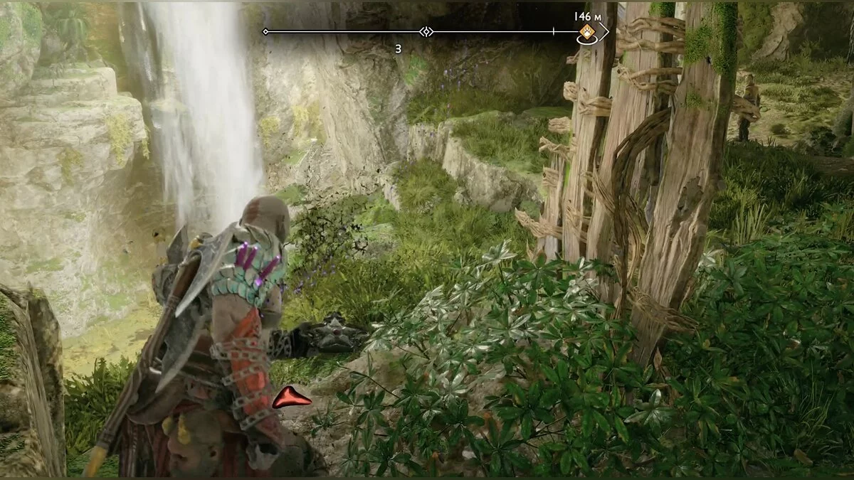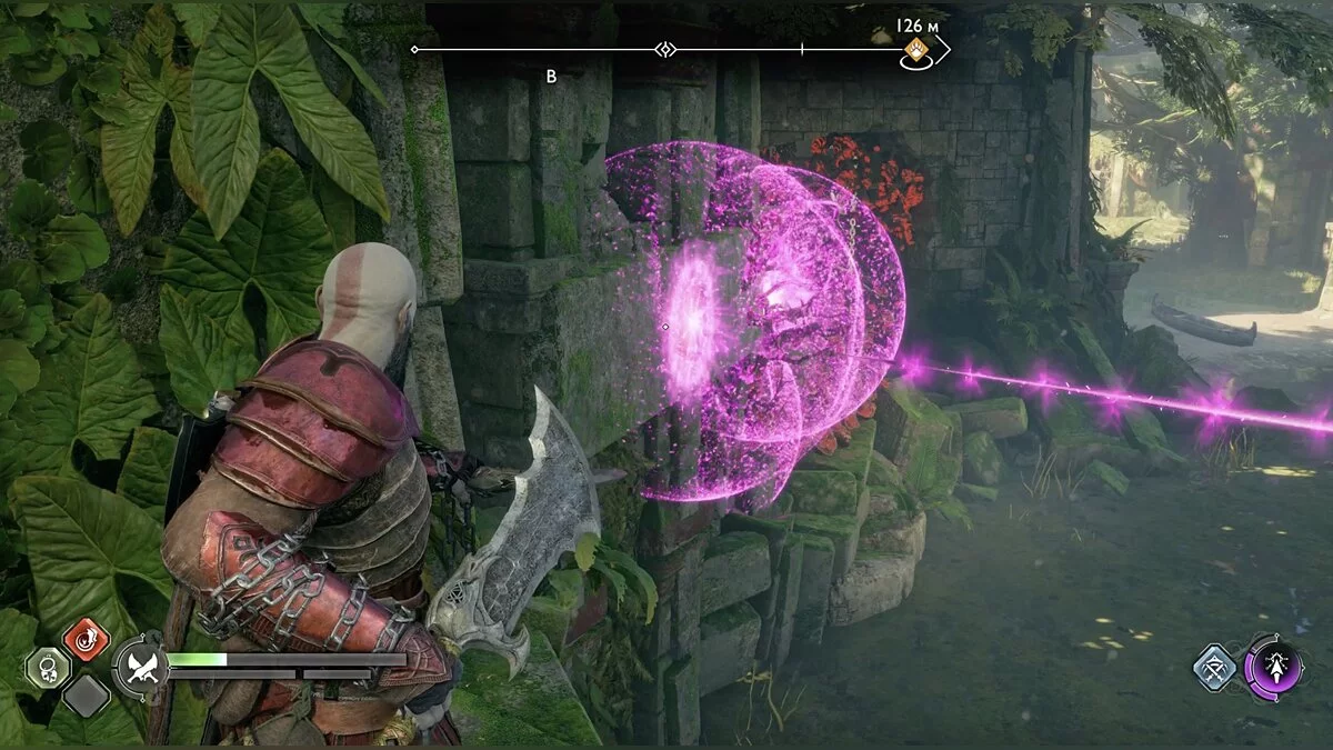 Путешествуя под землей, вы наткнетесь на укрепление для клинков Хаоса, которое обросло наростами. Разбейте их стрелами Атрея, чтобы получить доступ и перепрыгнуть на другую сторону. Основной путь ведет вас вперед, однако обратите внимание на левую сторону коридора. Первый поворот позволит открыть быстрый переход в место, где вы уже были — он нам не нужен. Во втором повороте можно перепрыгнуть небольшой водопад и спуститься вниз. Там Кратос найдет артефакт, а также ворота, которые можно открыть.