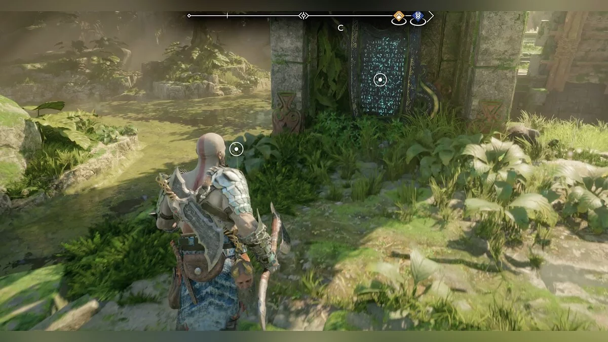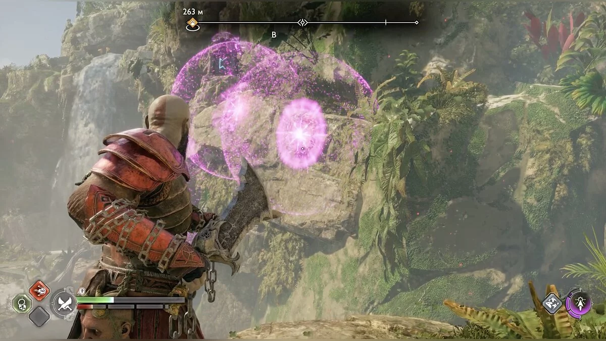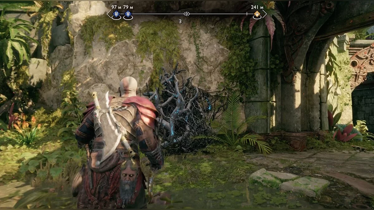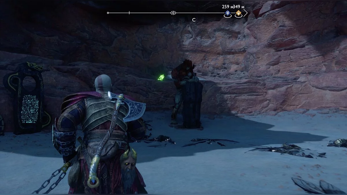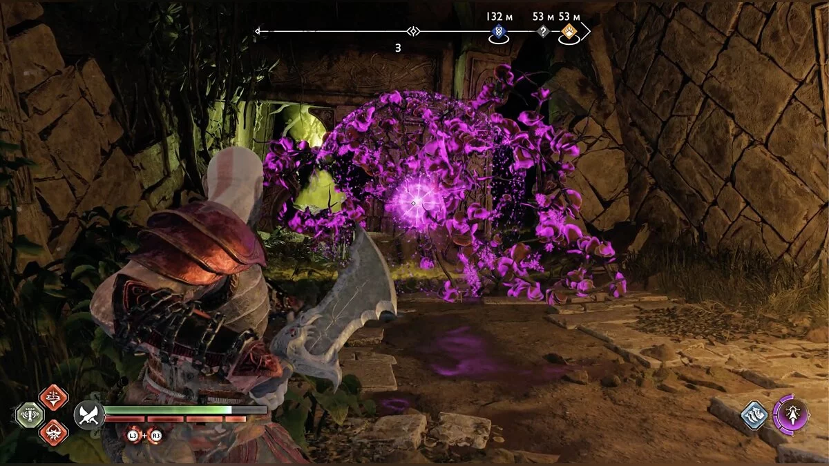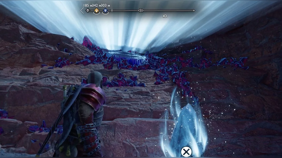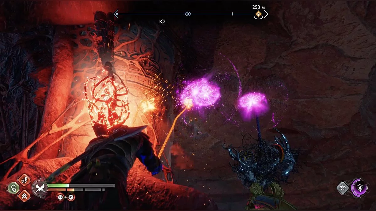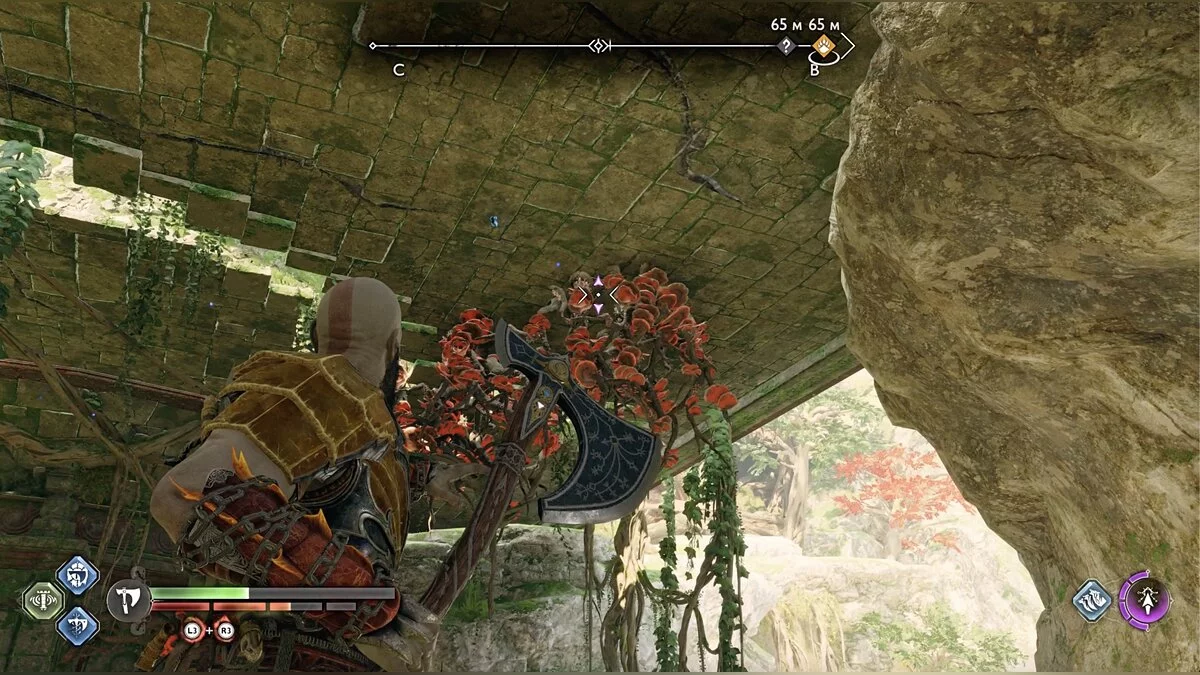 Путешествуя под землей, вы наткнетесь на укрепление для клинков Хаоса, которое обросло наростами. Разбейте их стрелами Атрея, чтобы получить доступ и перепрыгнуть на другую сторону. Основной путь ведет вас вперед, однако обратите внимание на левую сторону коридора. Первый поворот позволит открыть быстрый переход в место, где вы уже были — он нам не нужен. Во втором повороте можно перепрыгнуть небольшой водопад и спуститься вниз. Там Кратос найдет артефакт, а также ворота, которые можно открыть.
